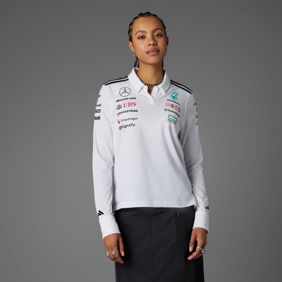 Regular fit","Two-button polo collar","74% polyester (recycled), 19% cotton, 7% elastane","Side slits on hem","Mercedes - AMG Petronas Formula One Team logo","Petronas on back"