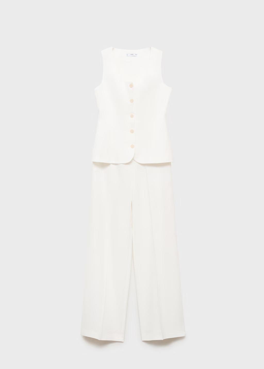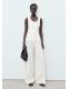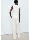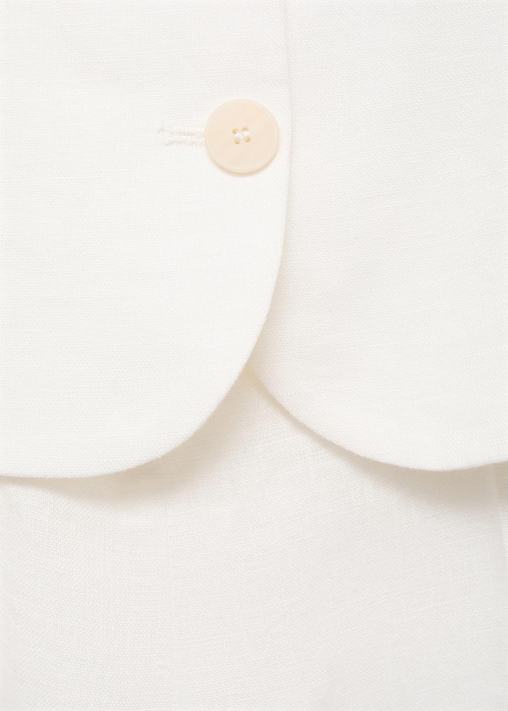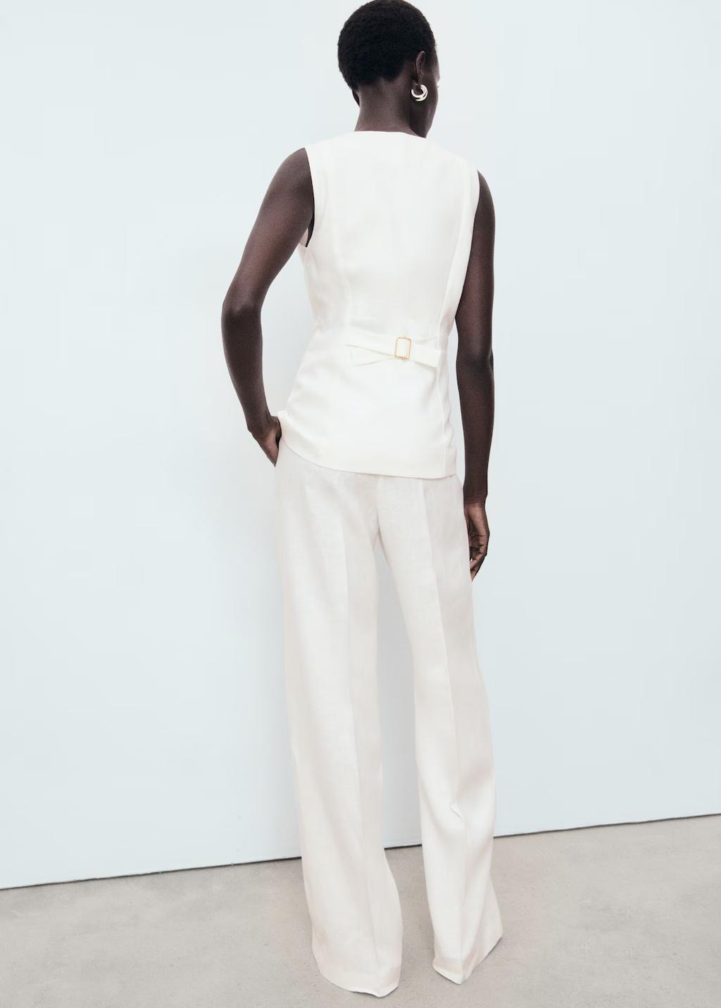 Tejido 100% de lino. Diseño largo. Diseño recto. Estilo traje. Cuello escotado. Detalle hebilla en la parte posterior. Cierre delantero con botones. Forro interior 100% algodón. Largo del interior de la pierna 85.6 cm. Largo de costado 138.5 cm. Largo de la espalda 66.7 cm