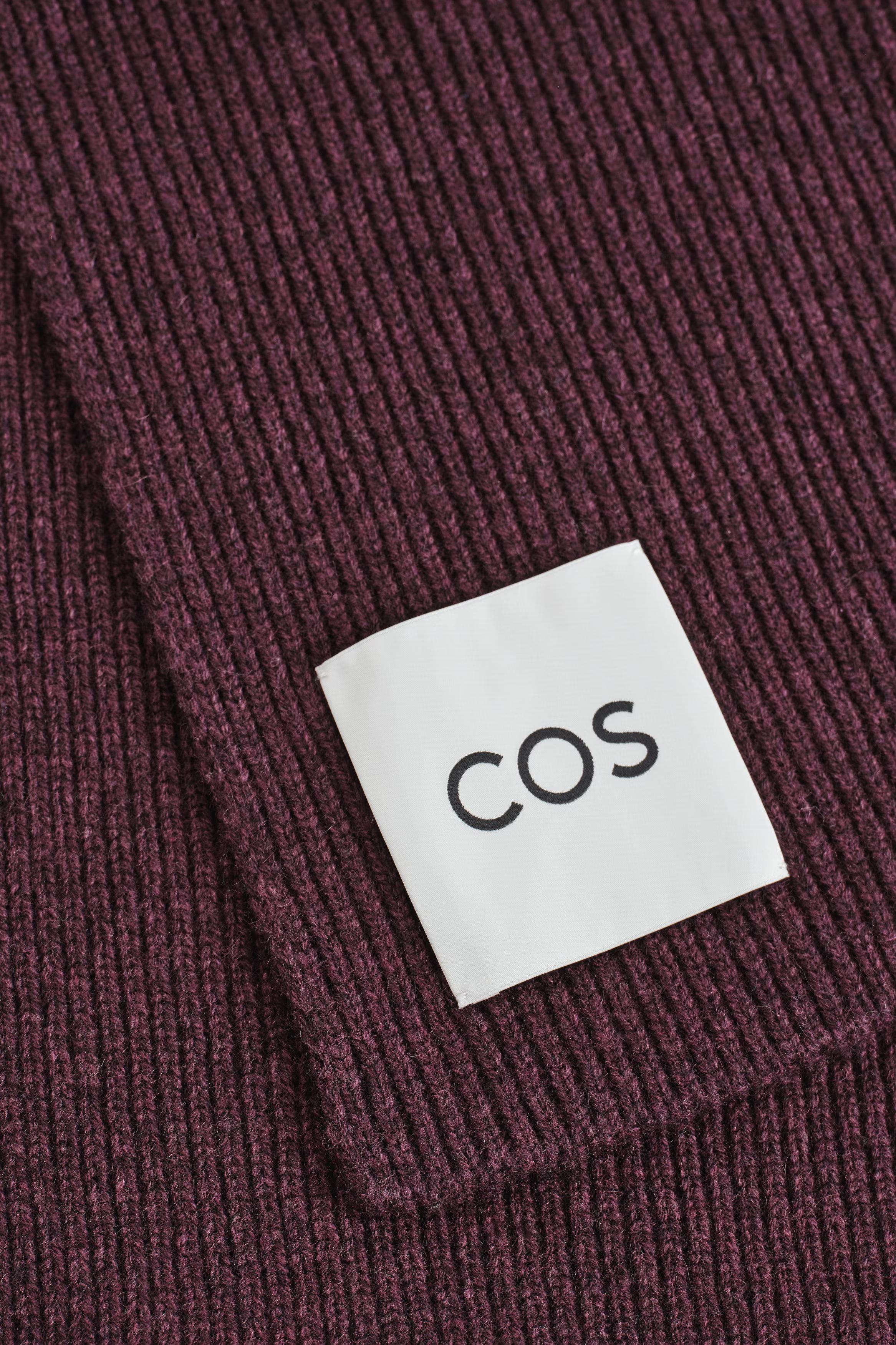 This chunky scarf can be effortlessly draped around your shoulders when the weather cools. Supremely soft to the touch, it's knitted from a premium blend of wool and cashmere that's ribbed for tactility and finished with the signature COS motif. The classic navy tone lends itself to a winter palette.\u0026nbsp;This product contains Responsible Wool Standard TE-00047206 (RWS) wool fibre from farms certified to animal welfare and land-management requirements\u0026nbsp;Shell: 70% RWS Wool, 30% Recycled cashmere. Excluding trims / Hand wash\u0026nbsp;Length: 170cm, Width: 26cm