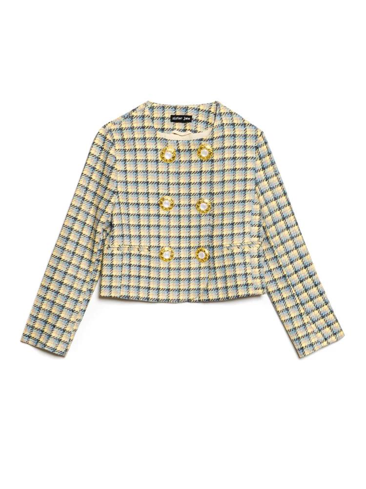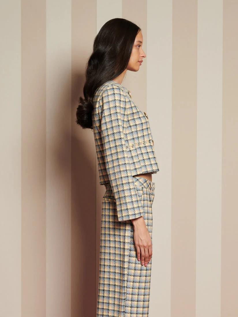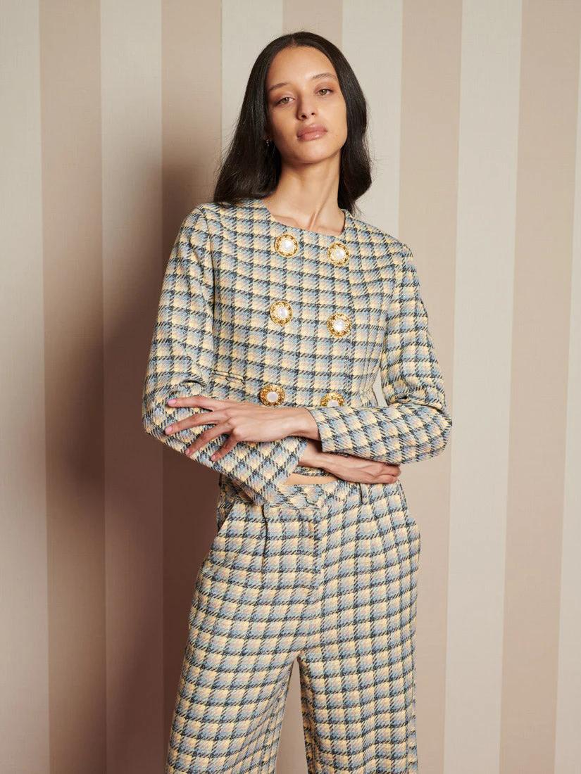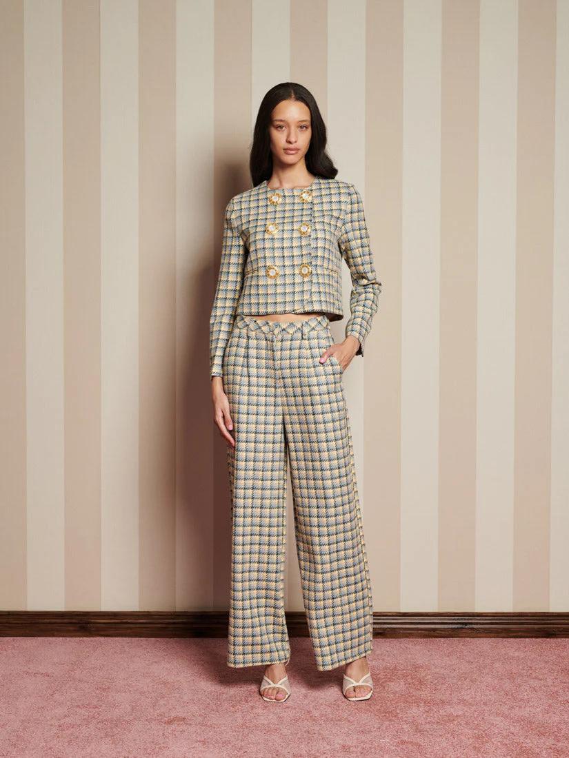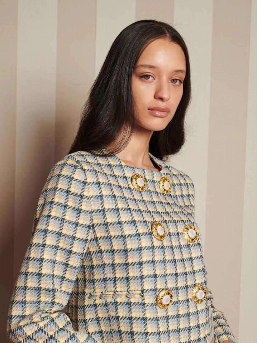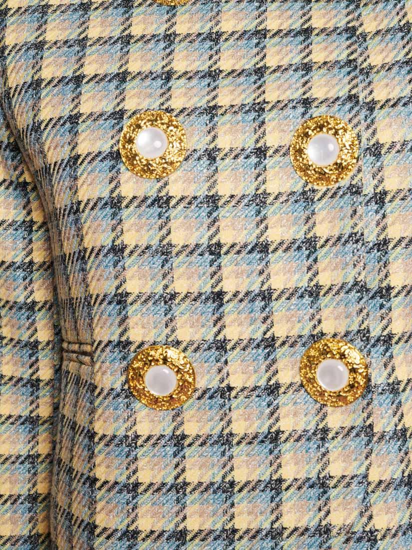 Smart as a library book, decorated with gold and pearl buttons, The Nook Check Double breasted Jacket keeps its stories close. Pair with the Nook Check Trousers for the complete look.
