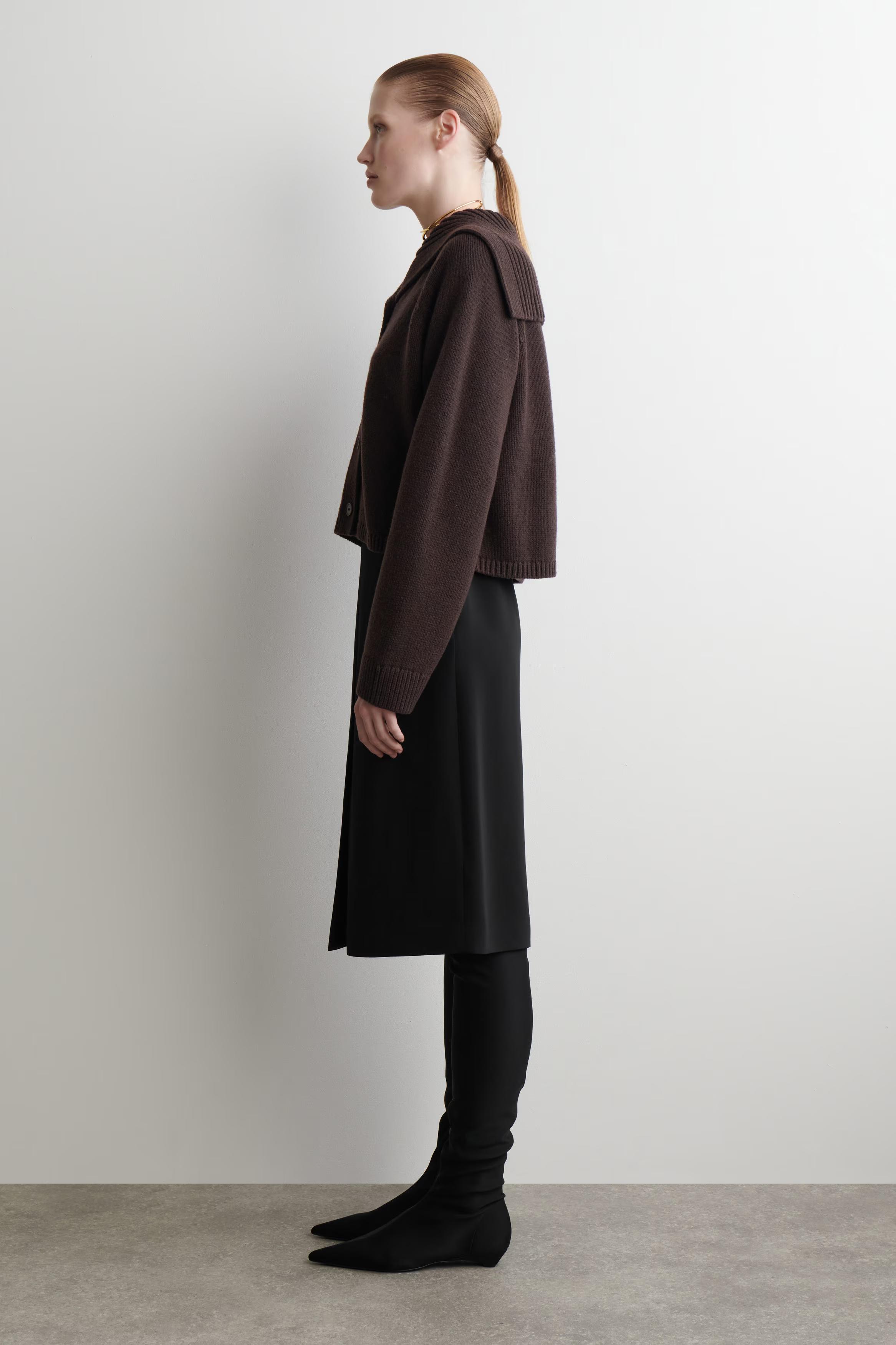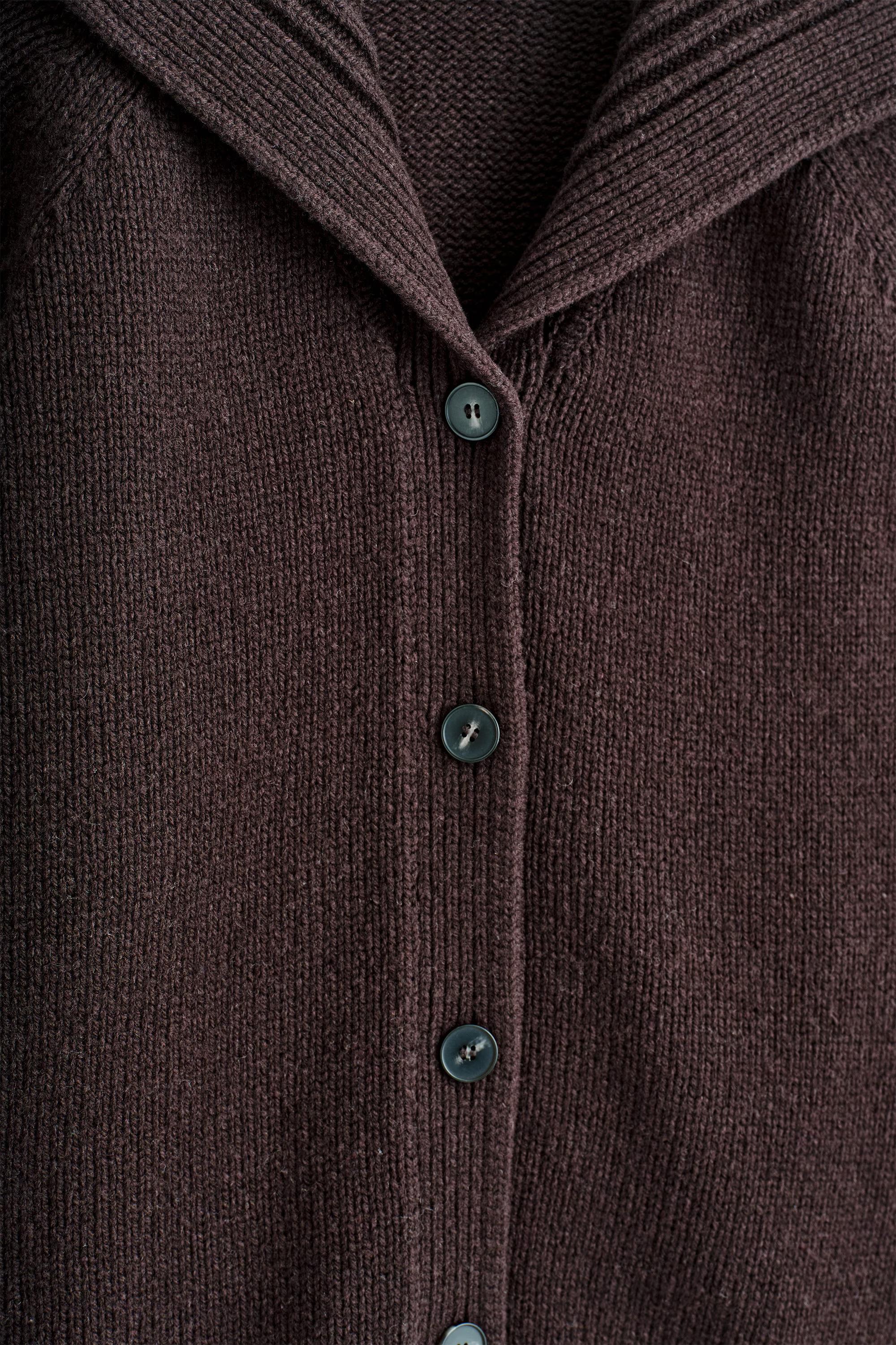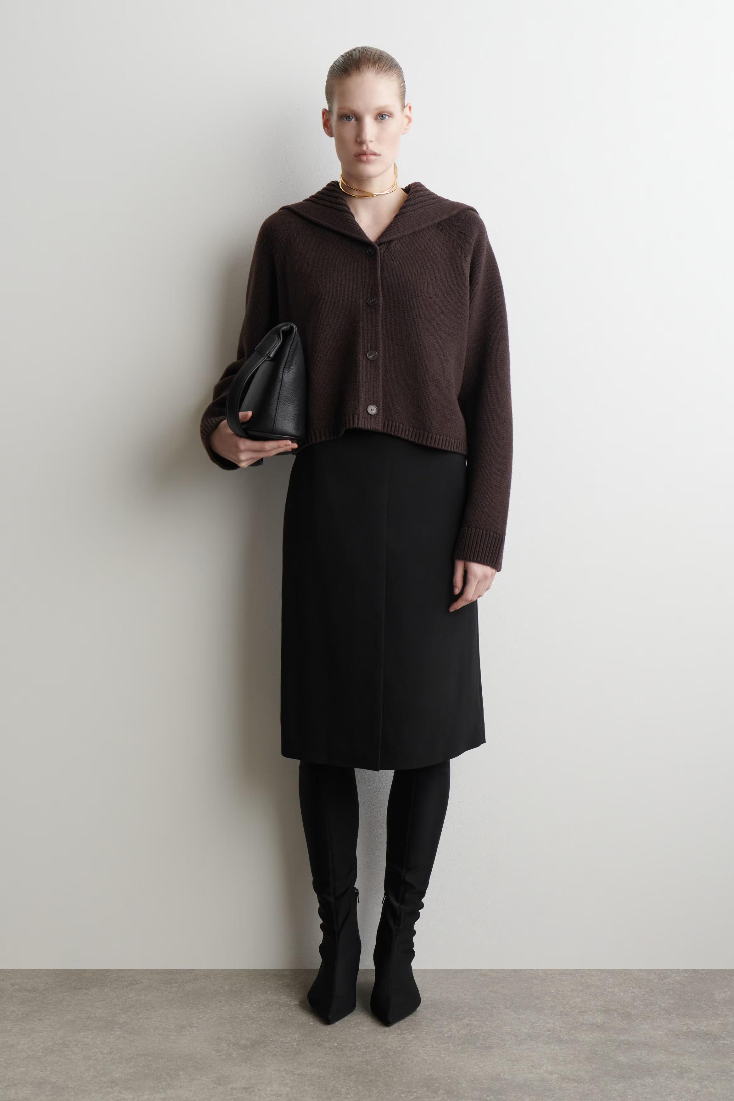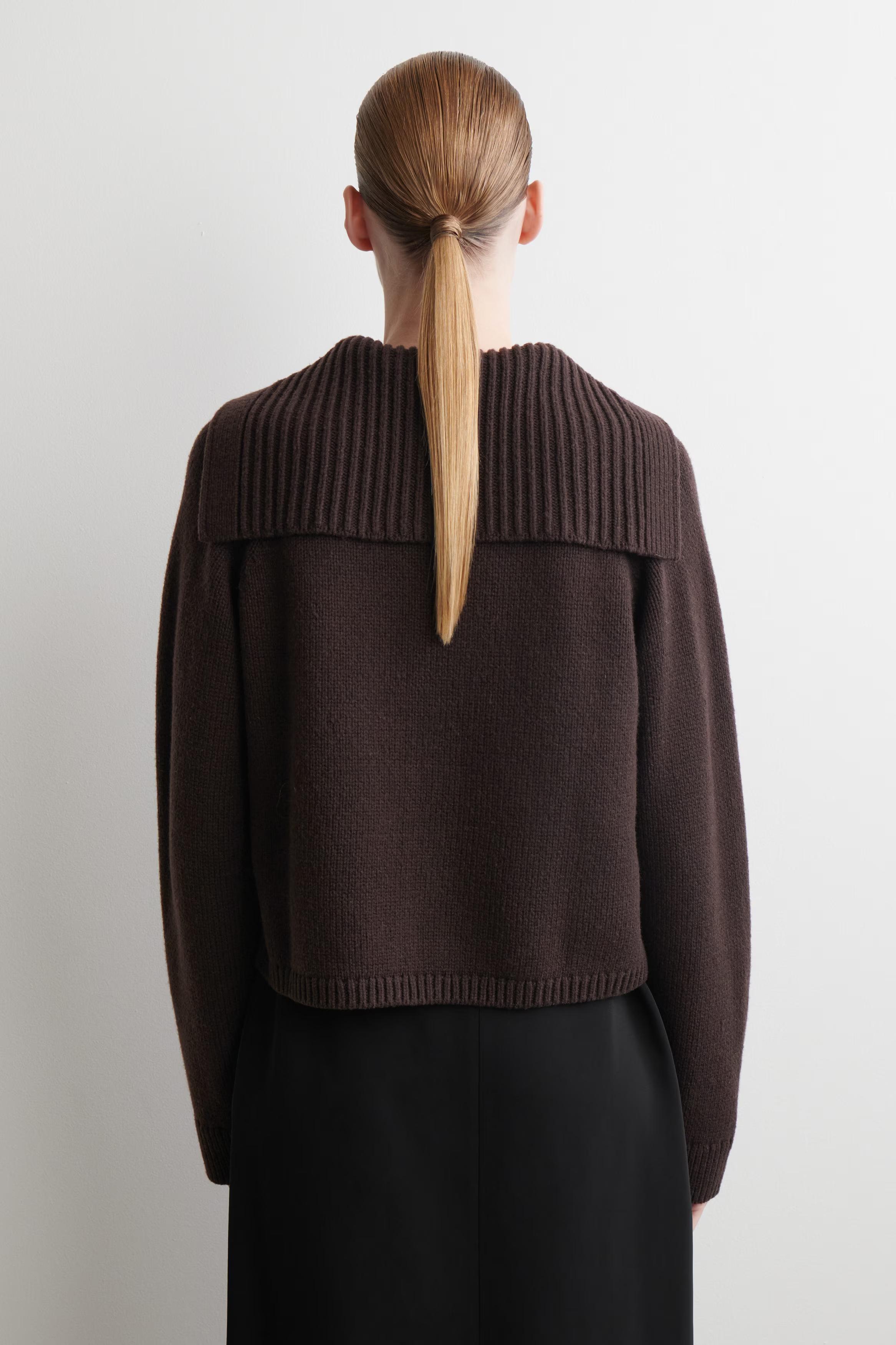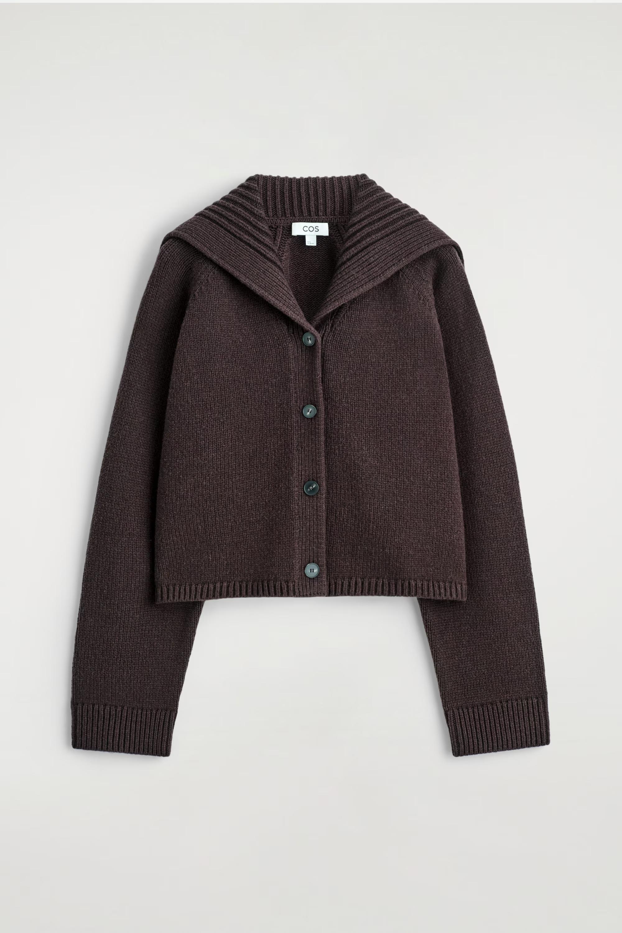 Cut in a boxy shape, this boxy cardigan is knitted from pure RWS wool that's equal parts soft and warm. It's designed with a unique sailor collar that folds over the shoulders and comes in a m\u0026eacute;lange-grey tone that will style effortlessly with the other pieces in your wardrobe.\u0026nbsp;Regular fitButton closureThis product contains Responsible Wool Standard TE-00047206 (RWS) wool fibre from farms certified to animal welfare and land-management requirements\u0026nbsp;\u0026nbsp;Shell: 100% RWS Wool. Excluding trims / Machine wash\u0026nbsp;Length of size S is 51cm / Model wears a size S