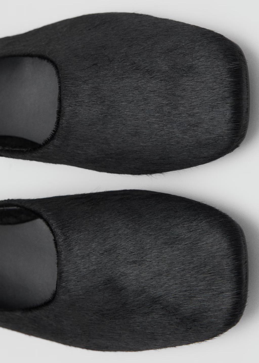 100% piel bovino con pelo. Flat. Punta cuadrada. Sin cierre. Forro interior. Exclusivo Online