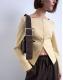 This bag has a contrast shoulder strap with a soft, textured finish and a silver-tone buckle. The main compartment is smooth and glossy, fastening with a zip.