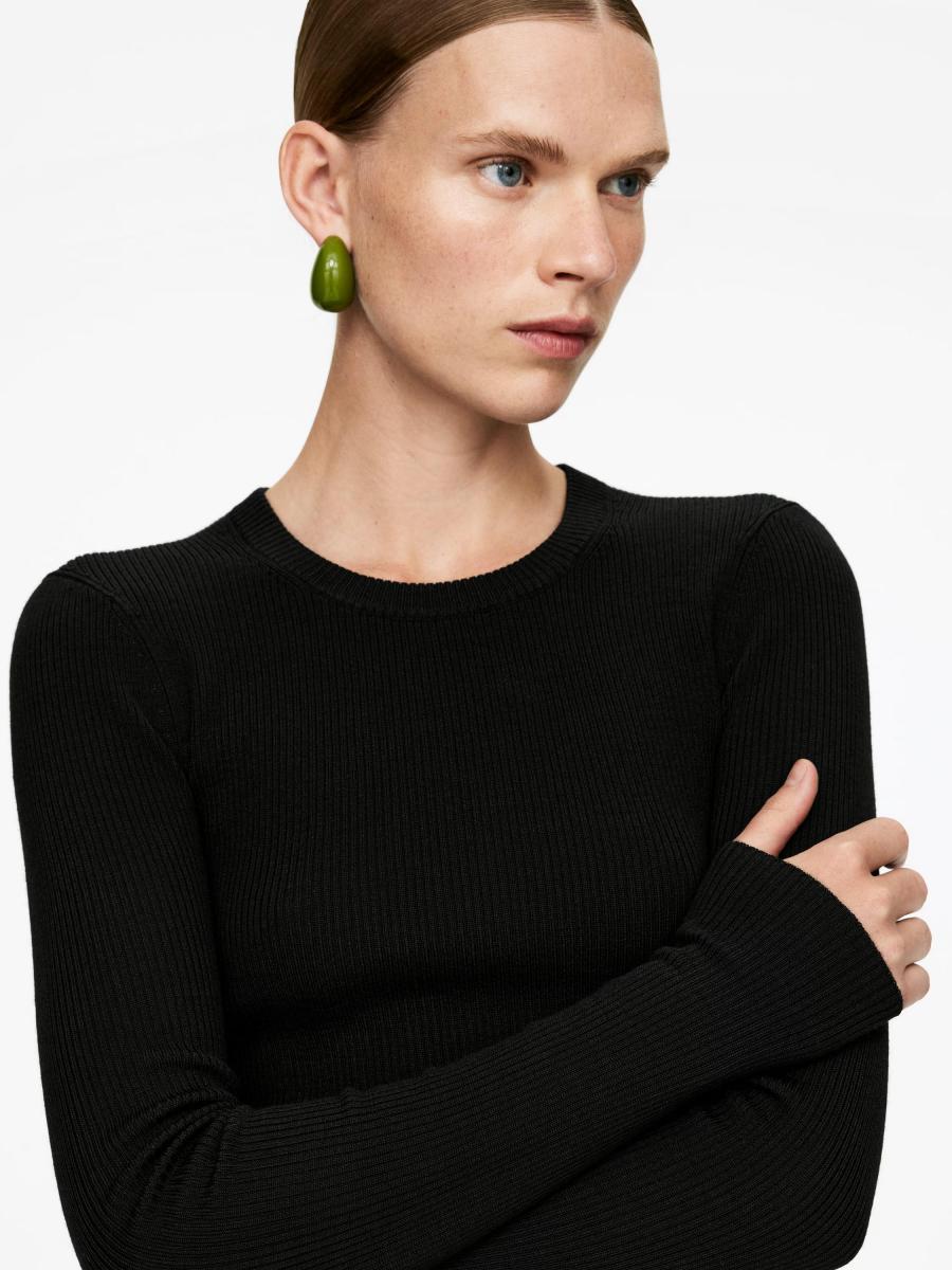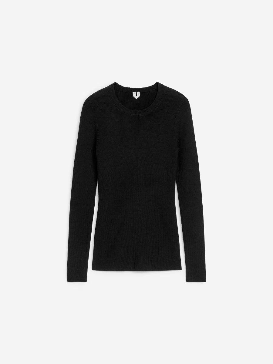 Long-sleeved top rib-knitted from merino wool. Crew-neck with ribbed trim. Slim fit. The top contains 100% RWS wool (TE-00047206). Products certified to the Responsible Wool Standard (RWS) contain wool fiber from farms independently certified to animal welfare and land management requirements.ARKET/Women's clothes/Women's knitwear