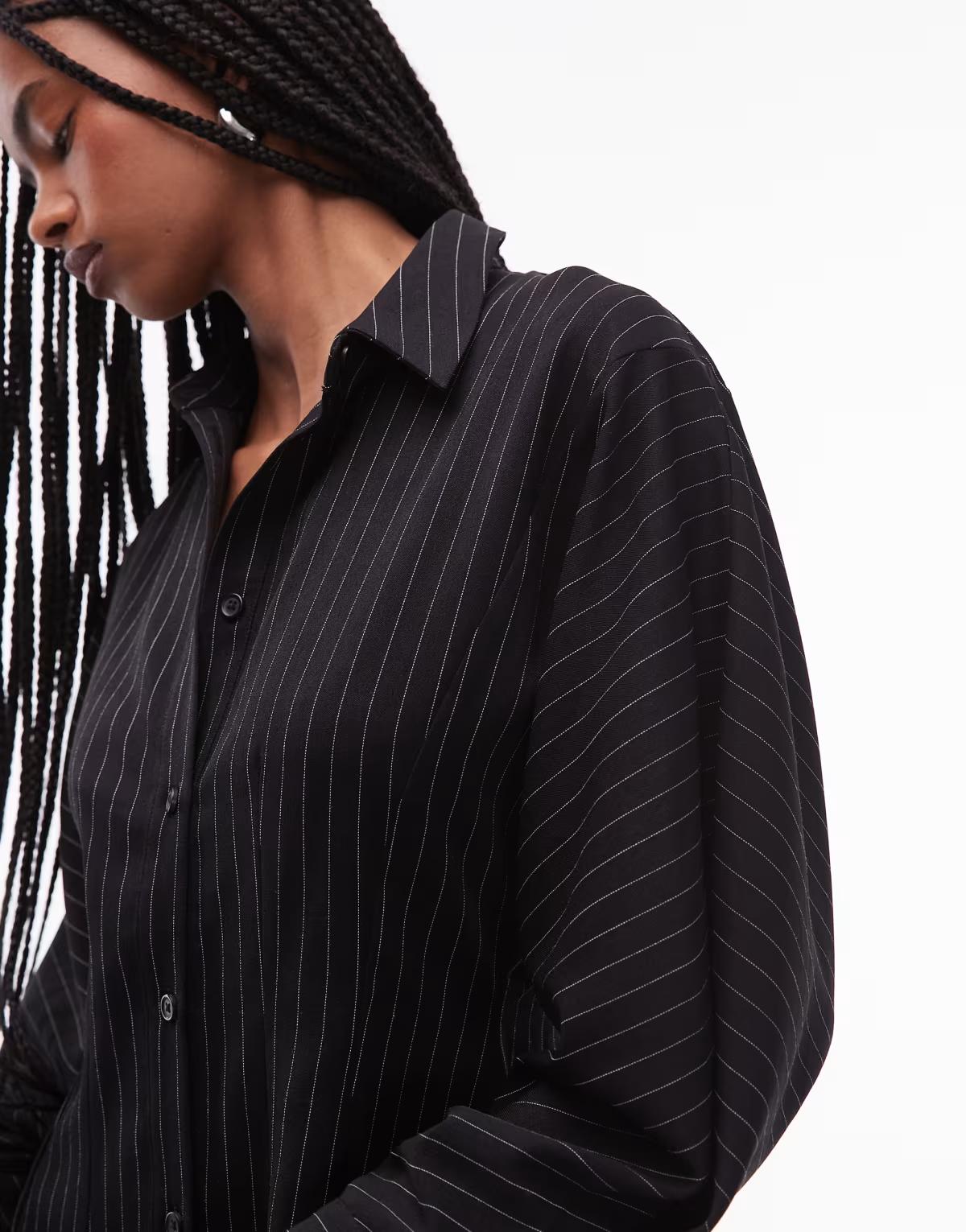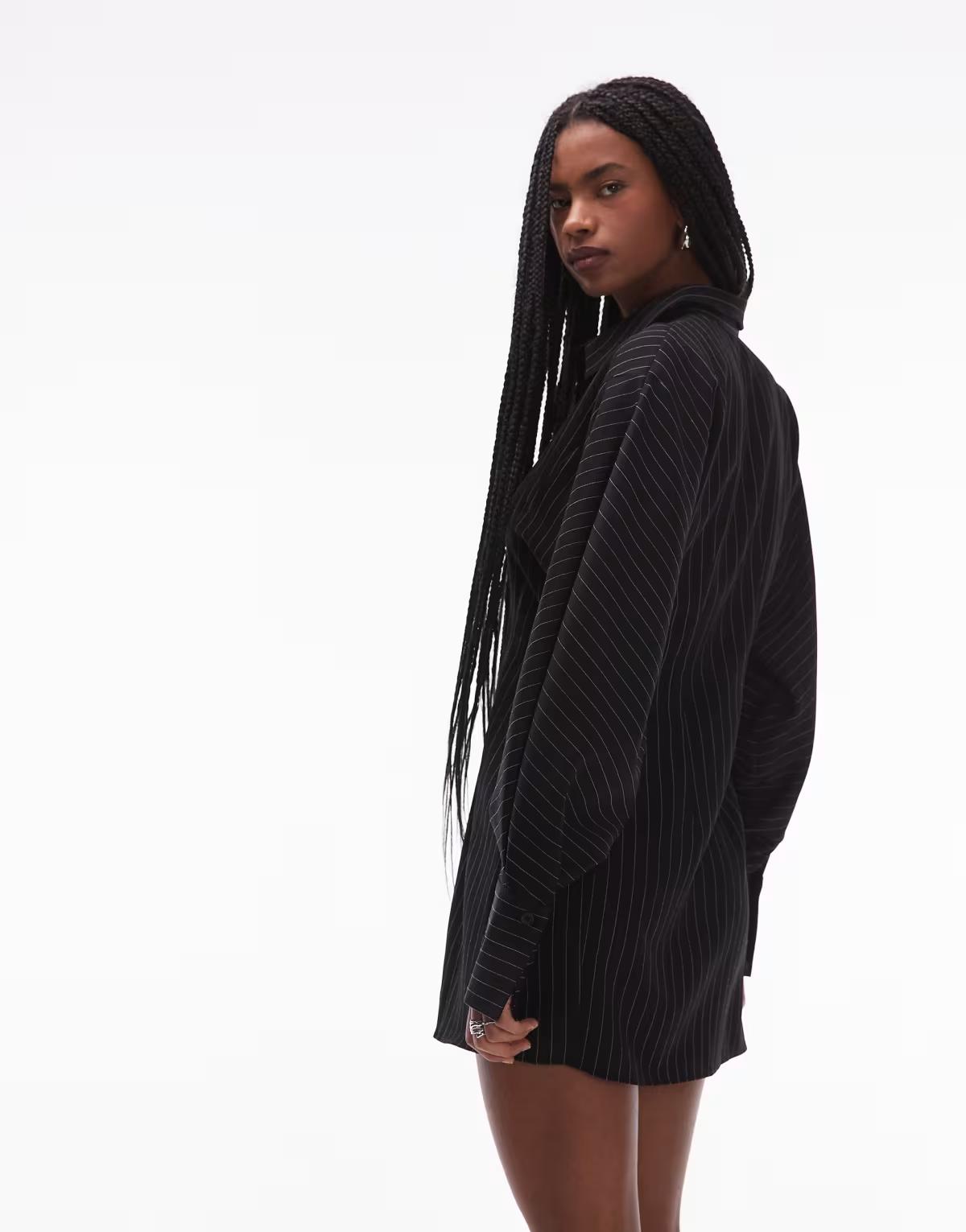 ASOS DESIGN mini shirt dress with cinched waist in black pinstripe