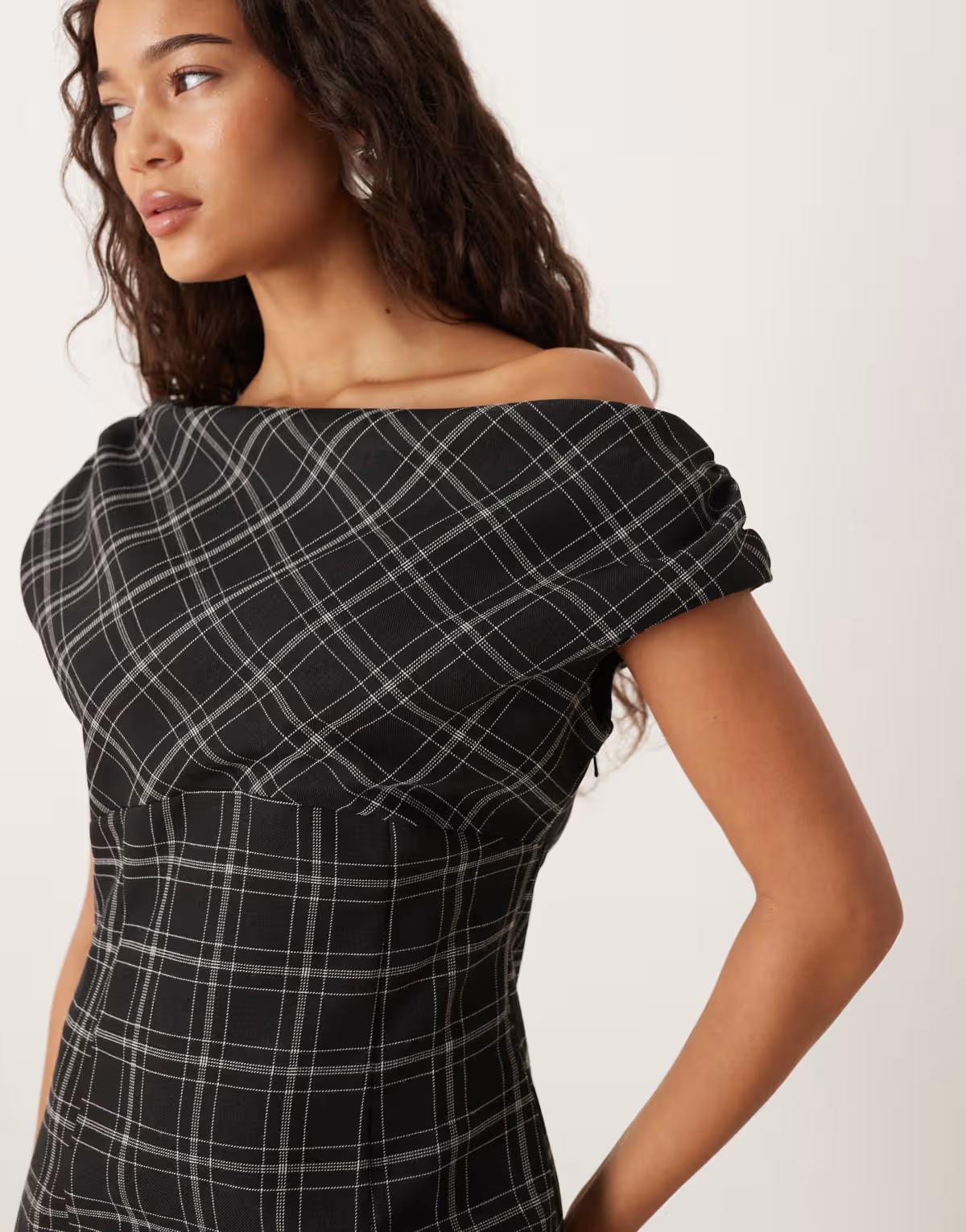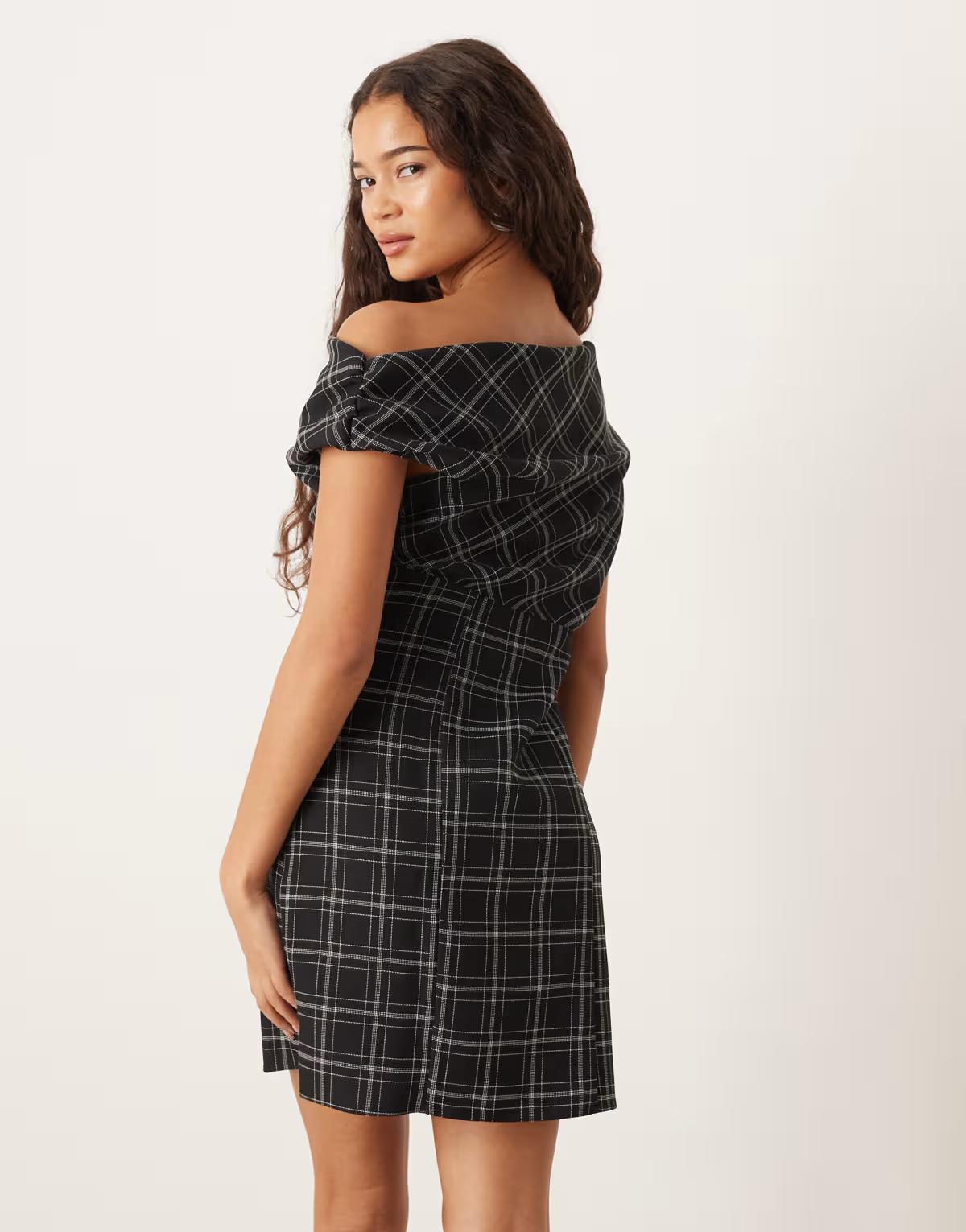 ASOS DESIGN fallen shoulder mini dress in black and white check
