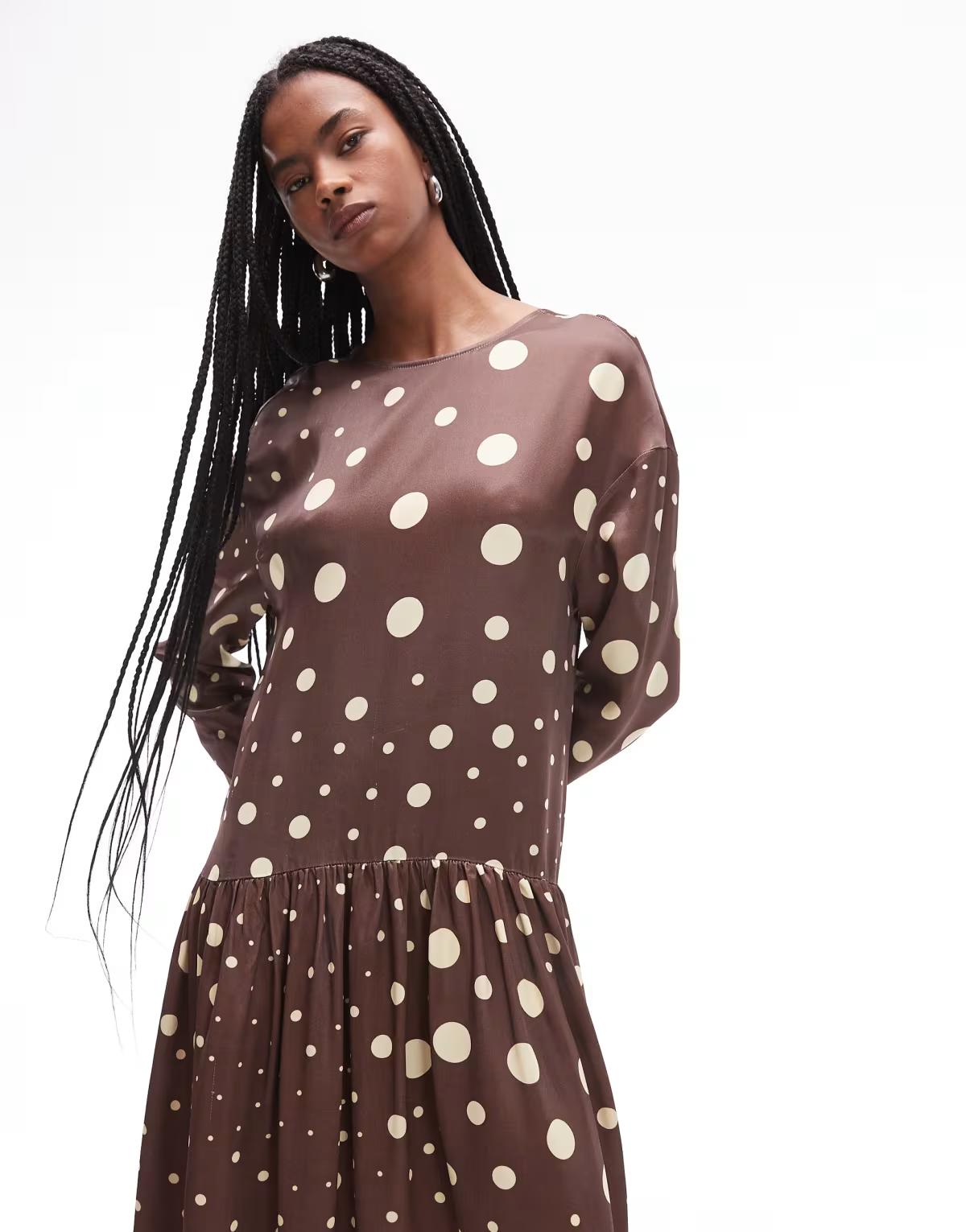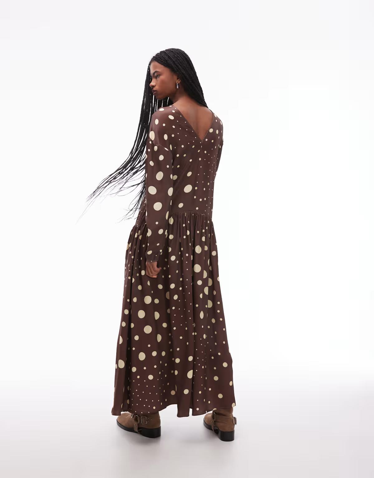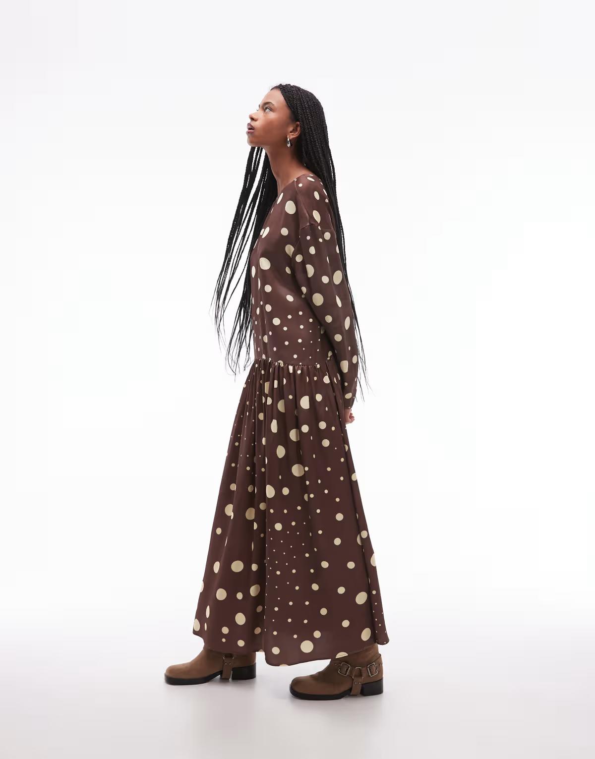 ASOS DESIGN dropped waist maxi smock dress in chocolate spot
