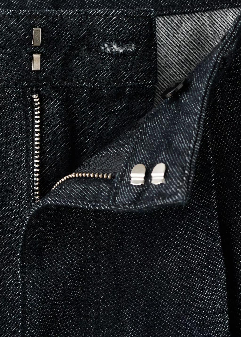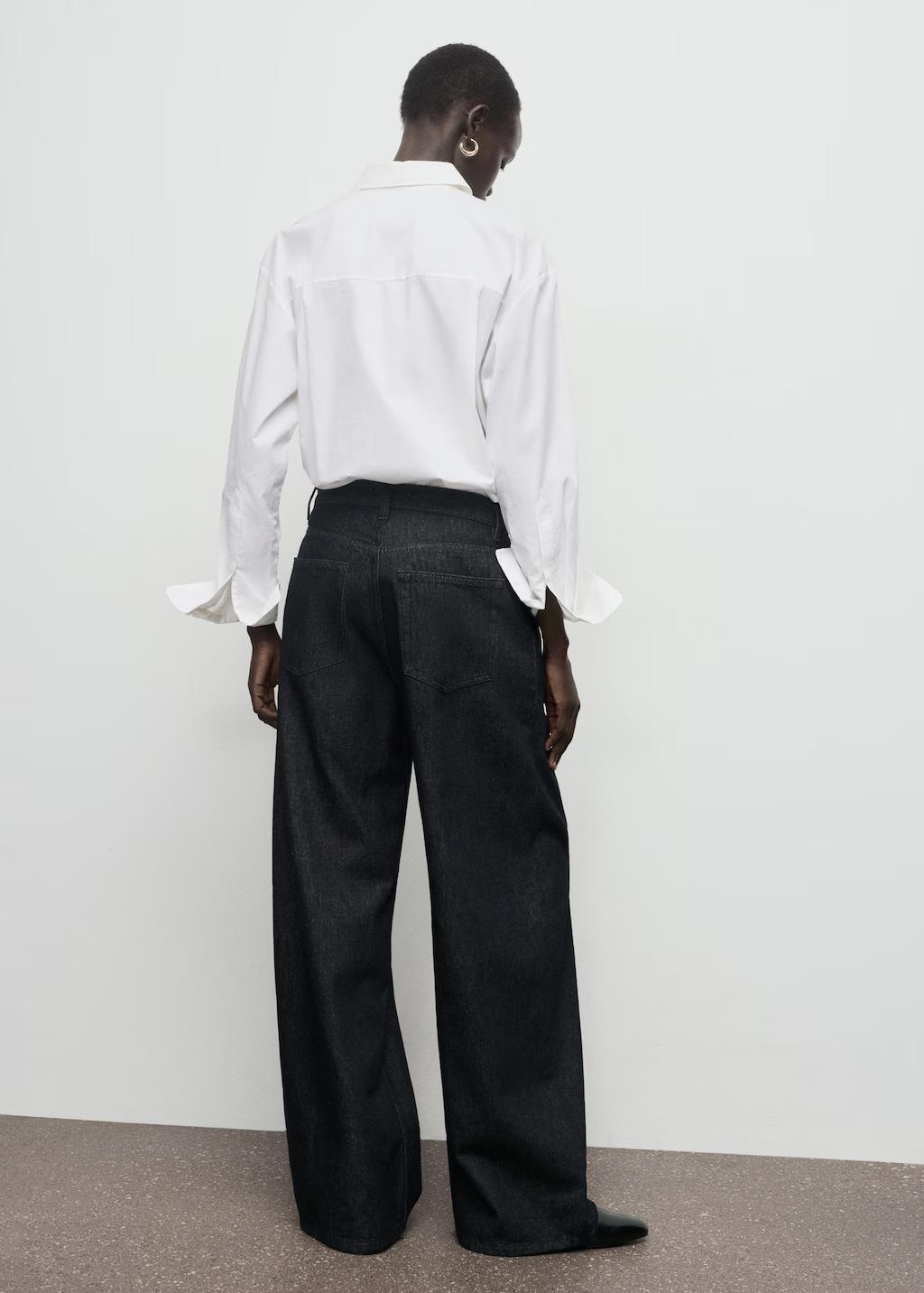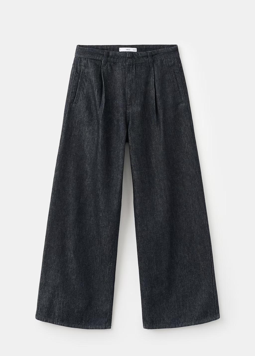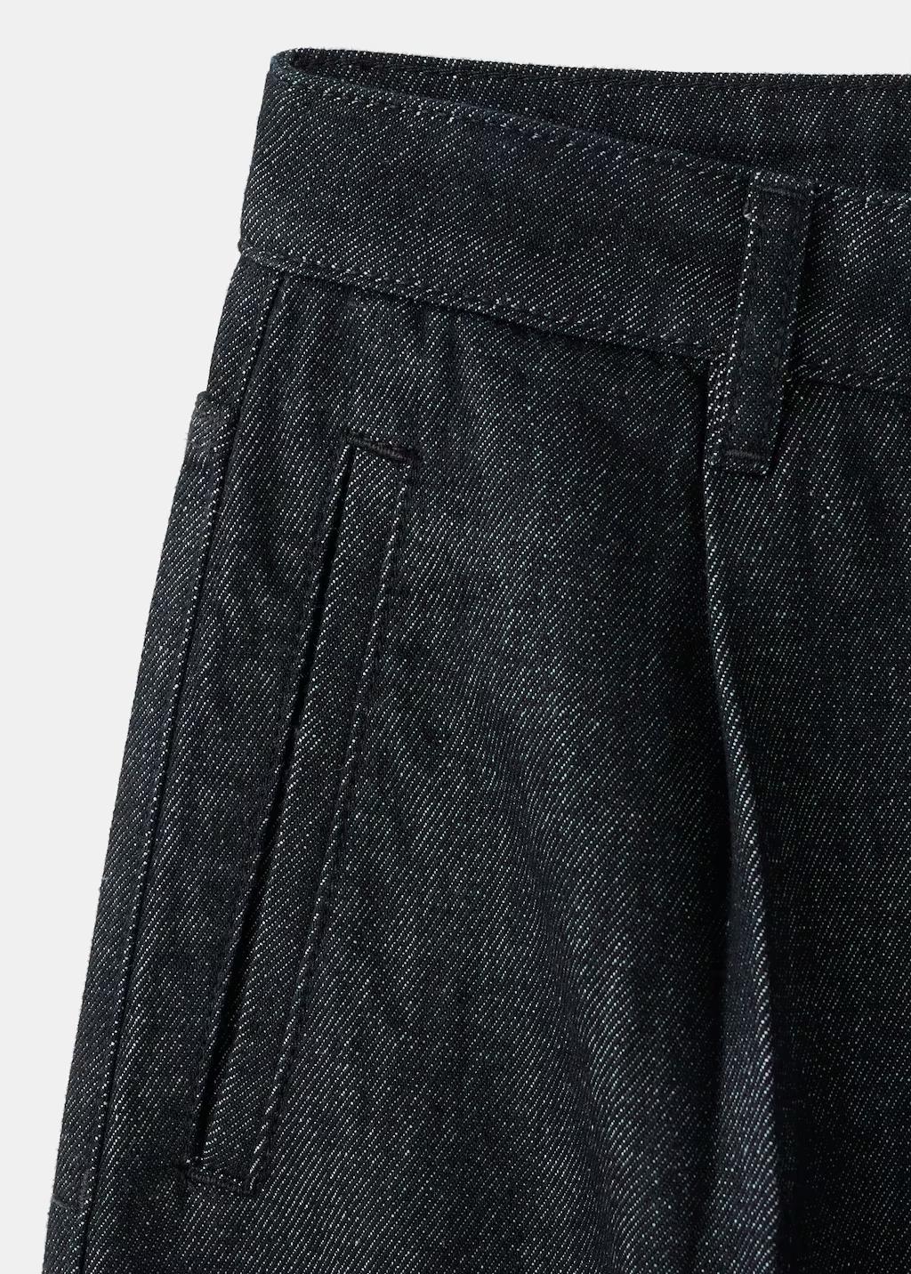 Tejido de algodón estilo tejano vaquero. Diseño largo. Diseño wide leg. Tiro medio. Trabillas. Detalle de pinzas. Dos bolsillos laterales. Dos bolsillos de parche en la parte posterior. Cierre oculto de botón, gancho y cremallera