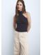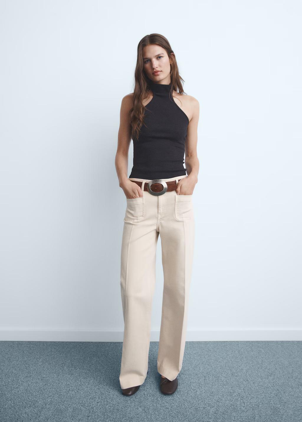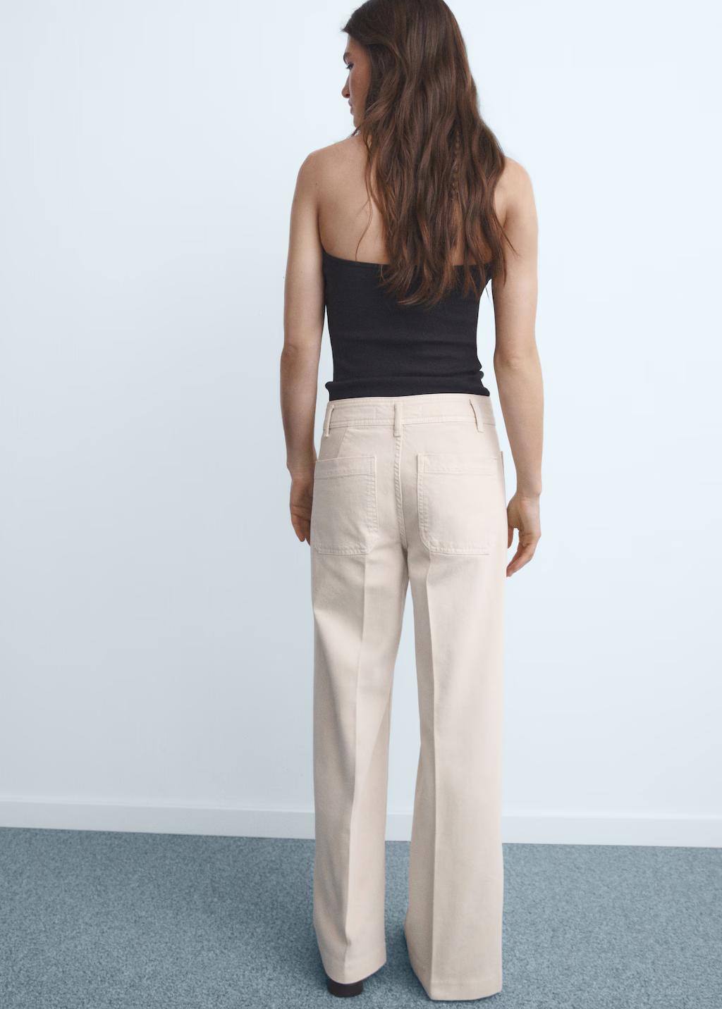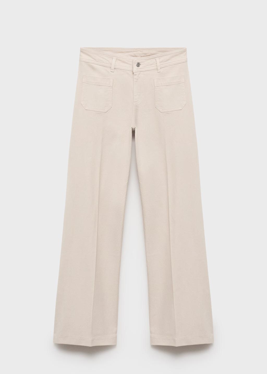 Tejido de algodón estilo tejano vaquero. Diseño largo. Diseño wide leg. Tiro alto. Trabillas. Dos bolsillos de parche en la parte delantera. Cierre delantero de cremallera y botón. Tejido confort con elasticidad