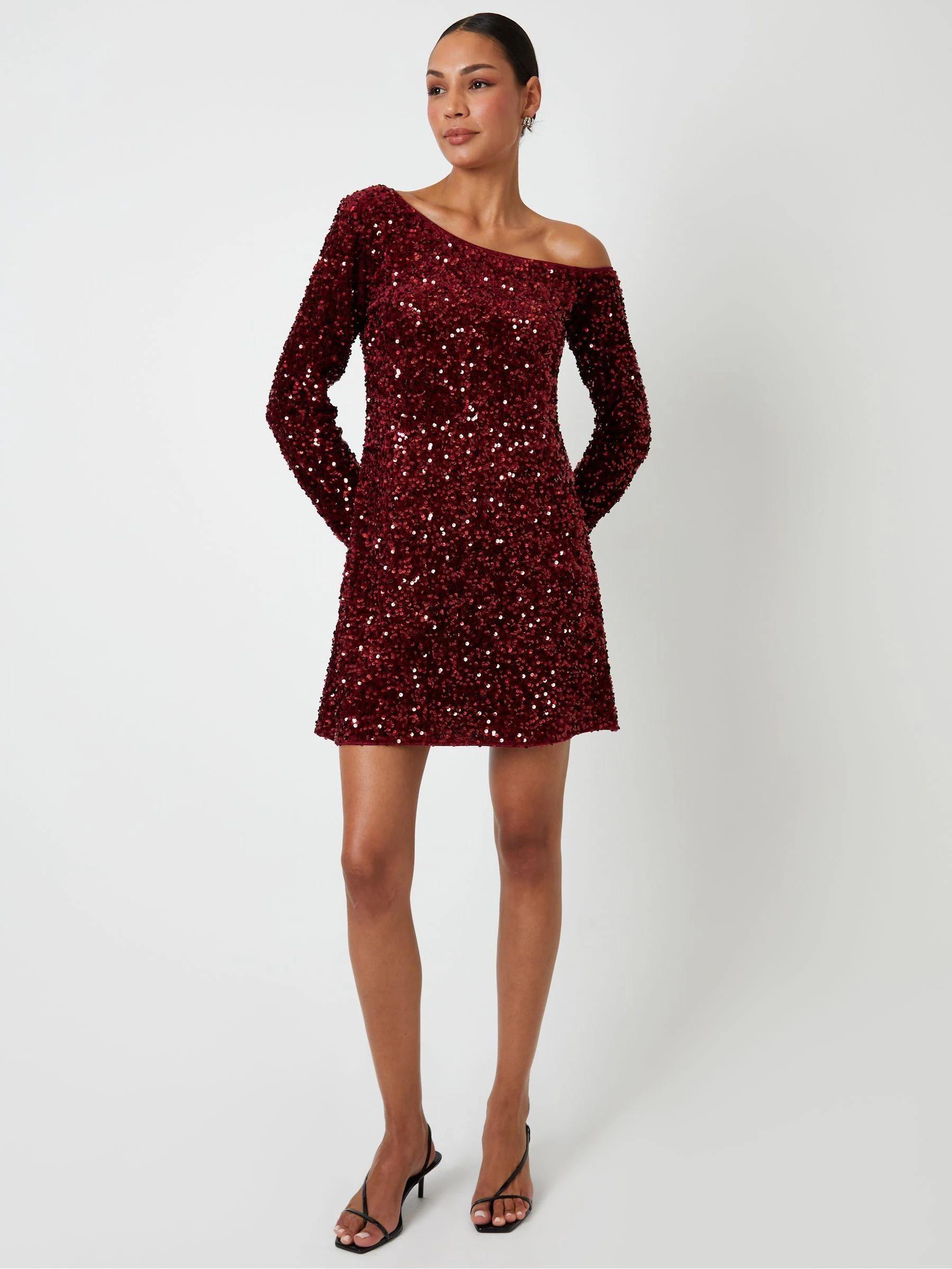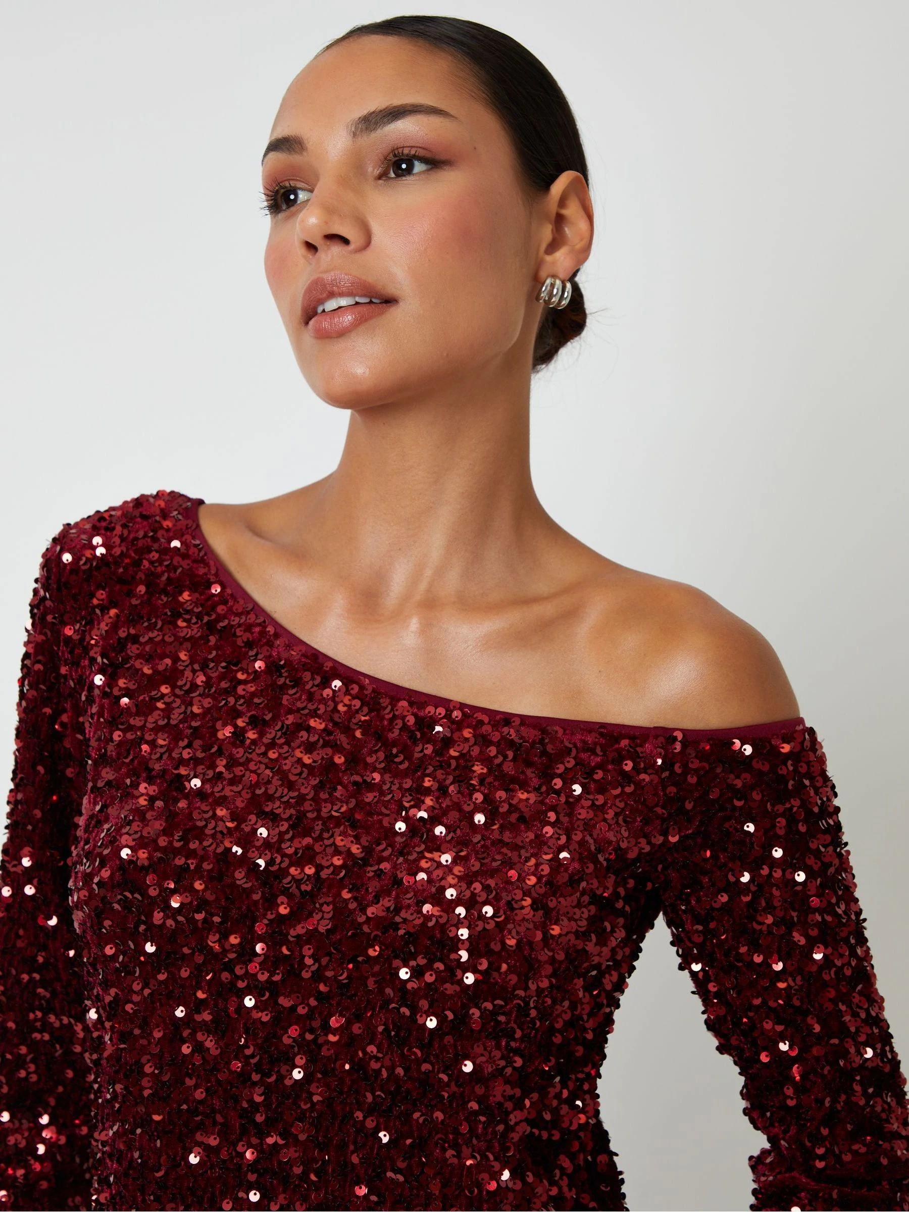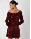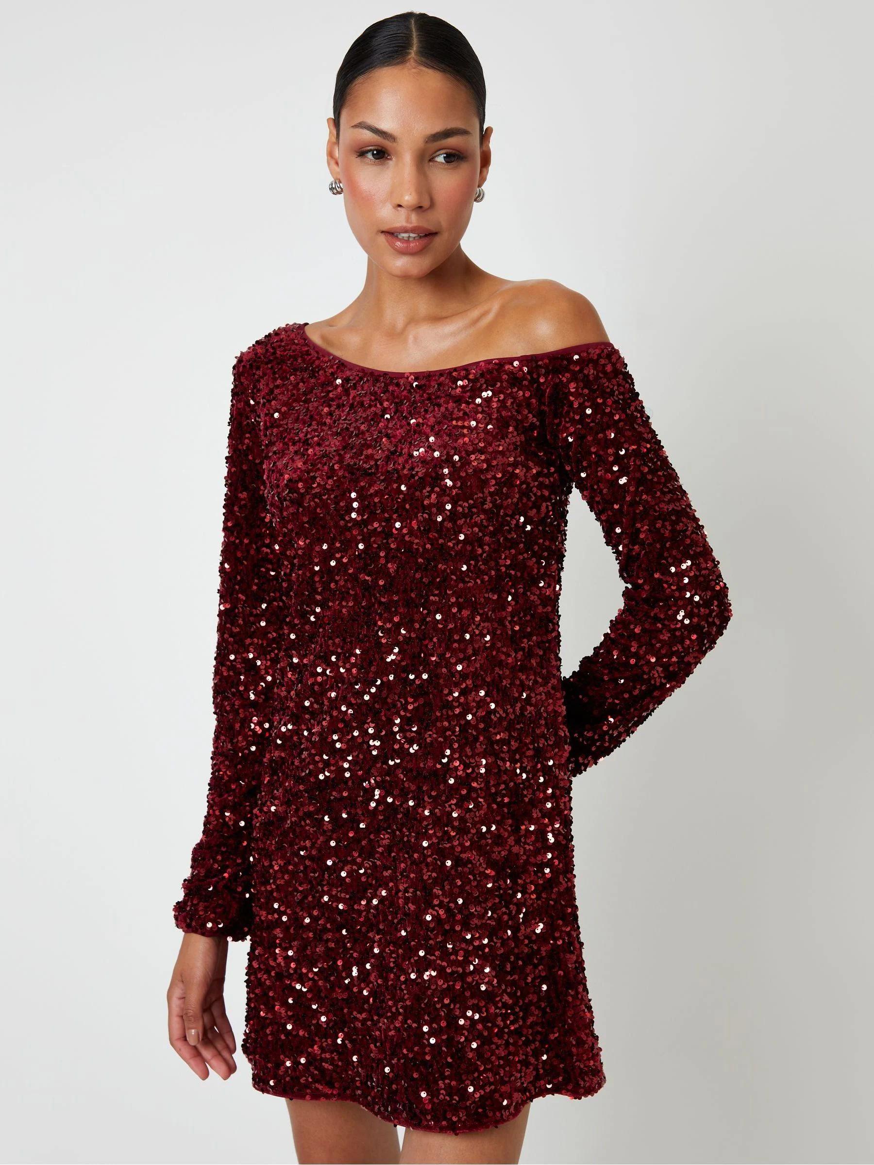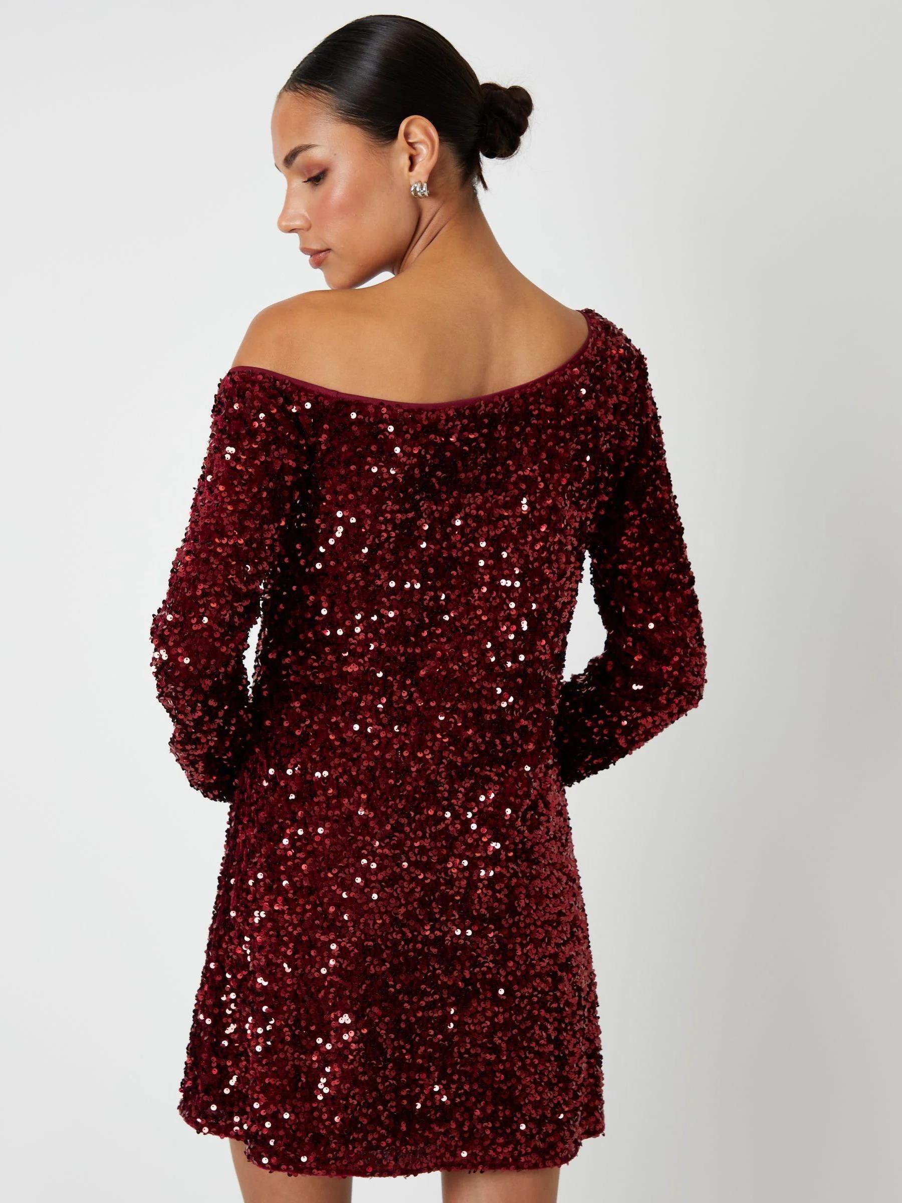 Threadbare Red Sequin Velour Slash Neck Mini Dress