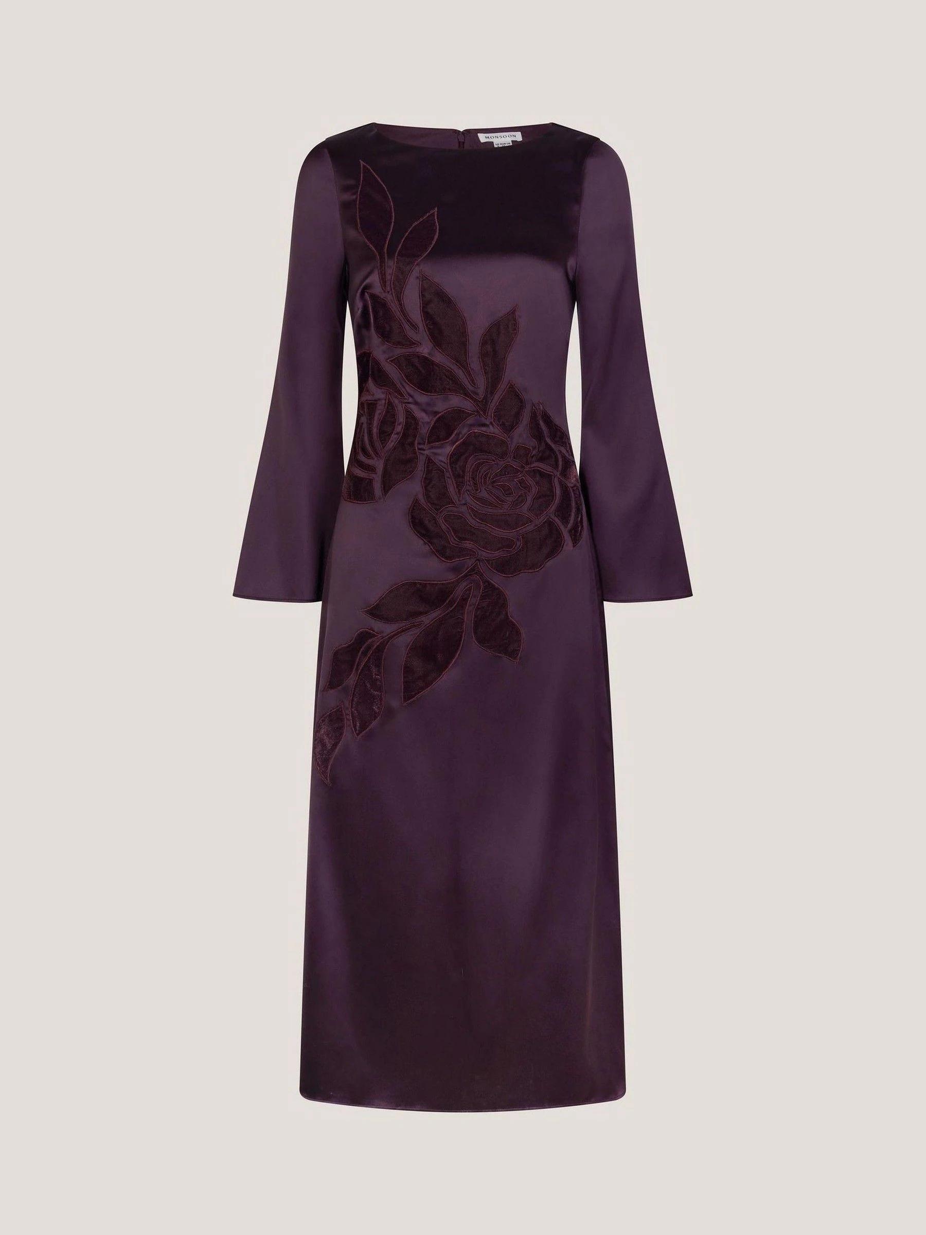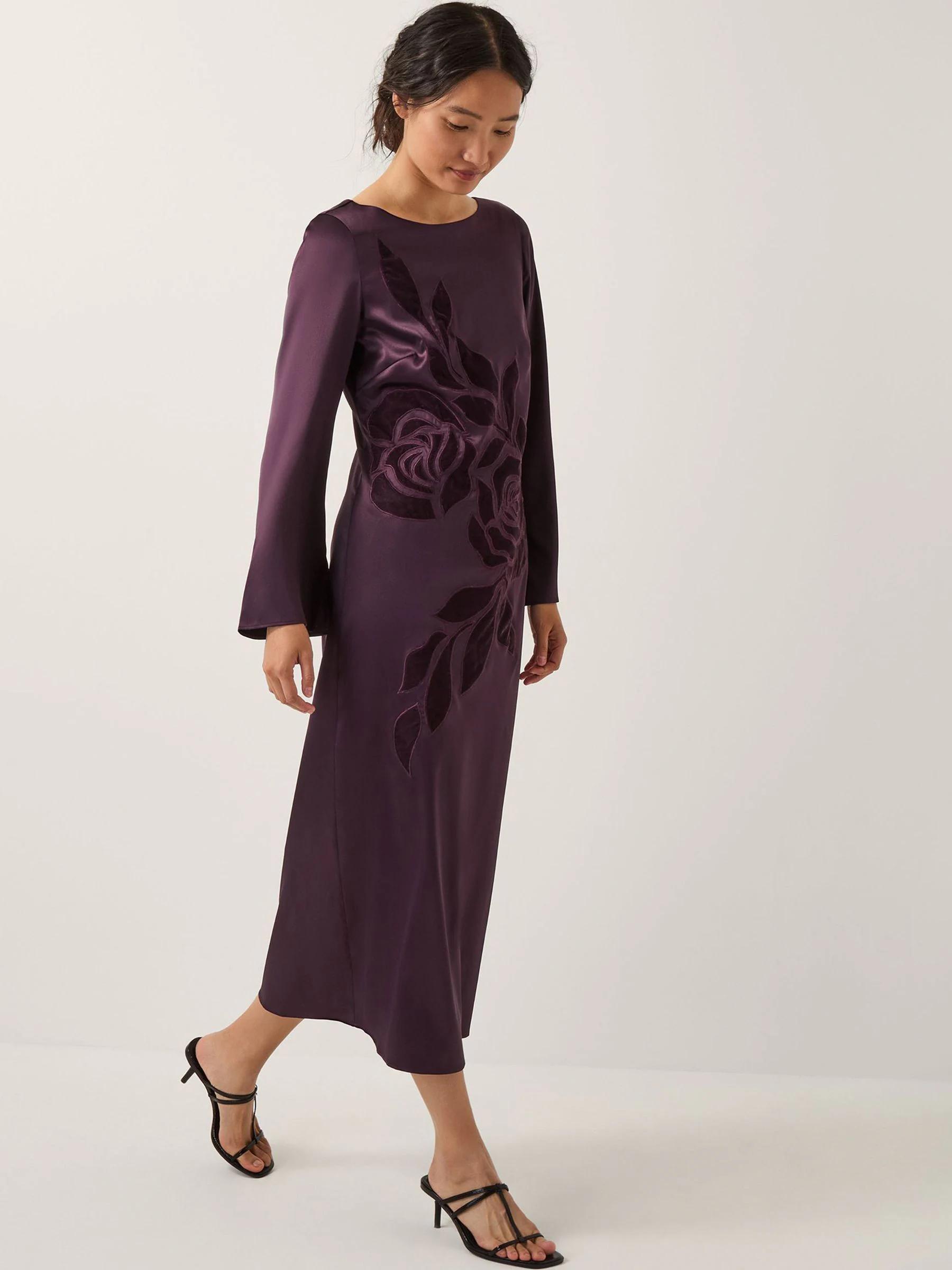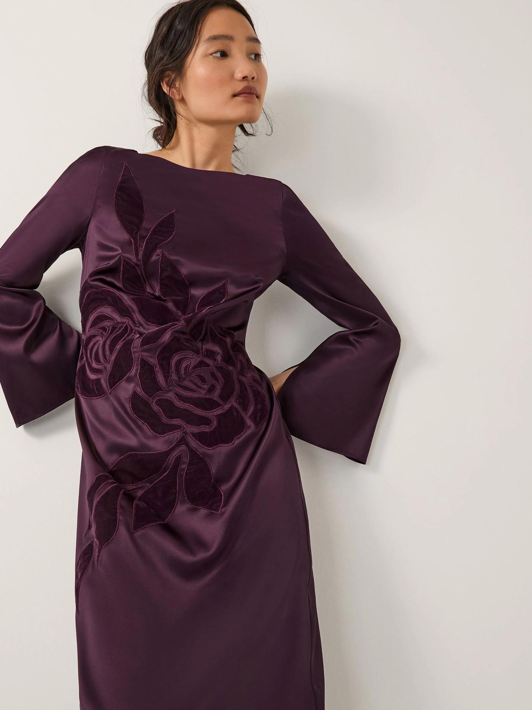 Monsoon Purple Callie Floral Satin Long Sleeve Midi Dress