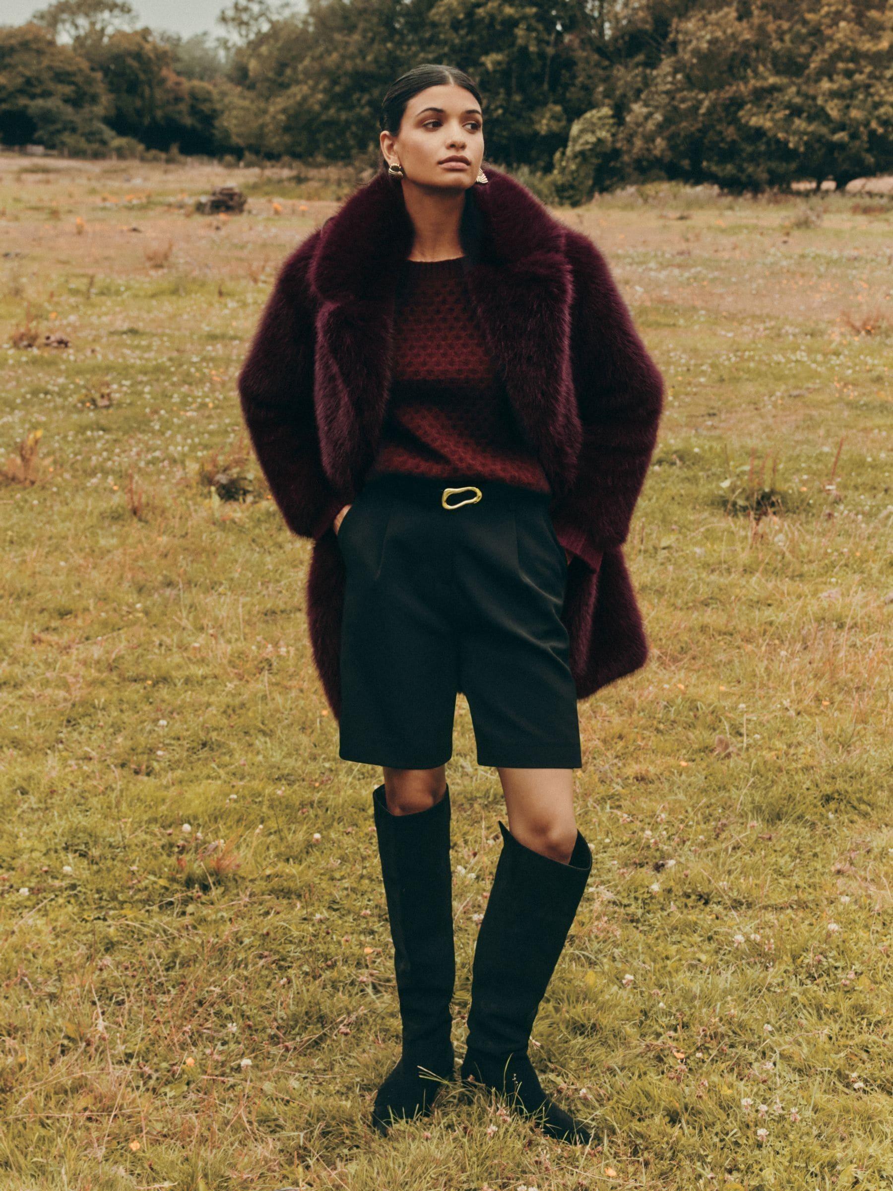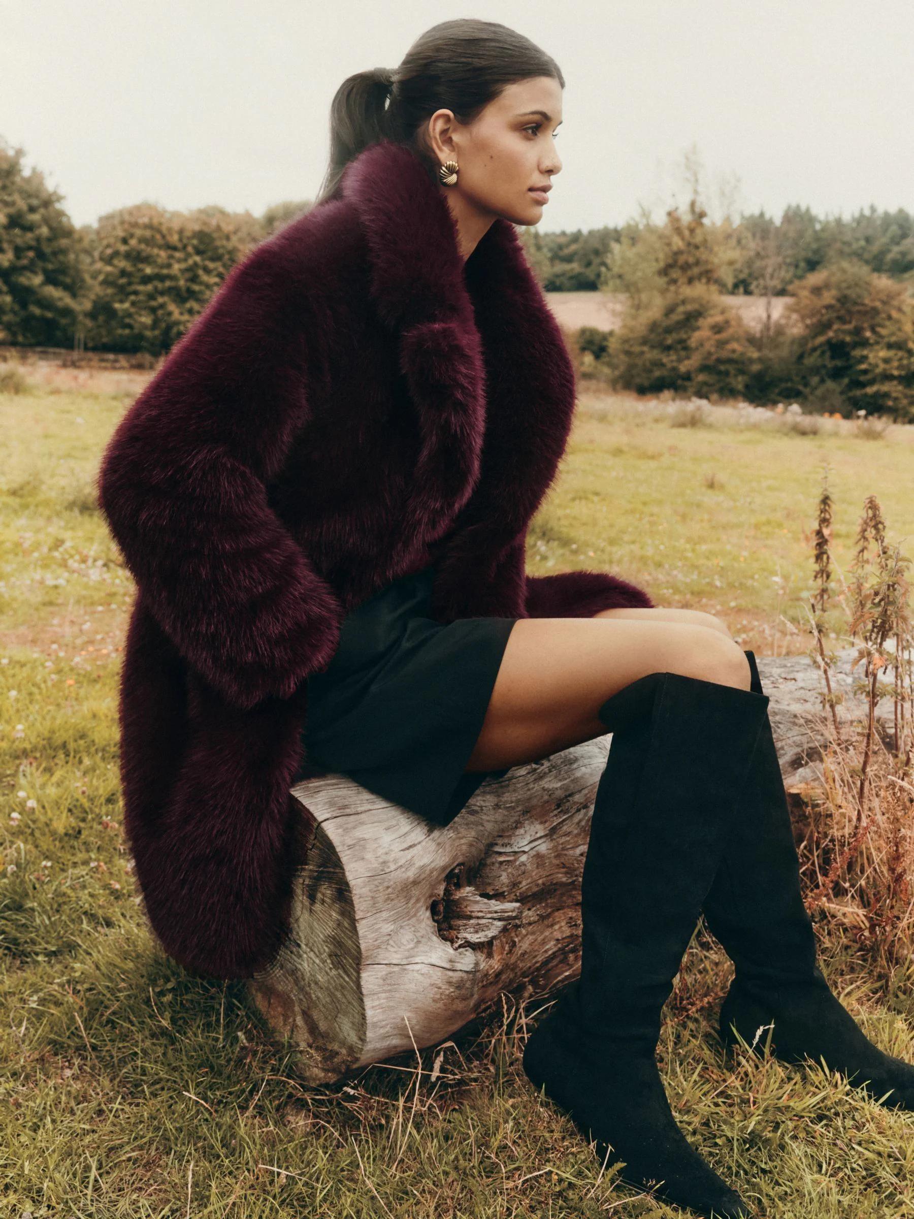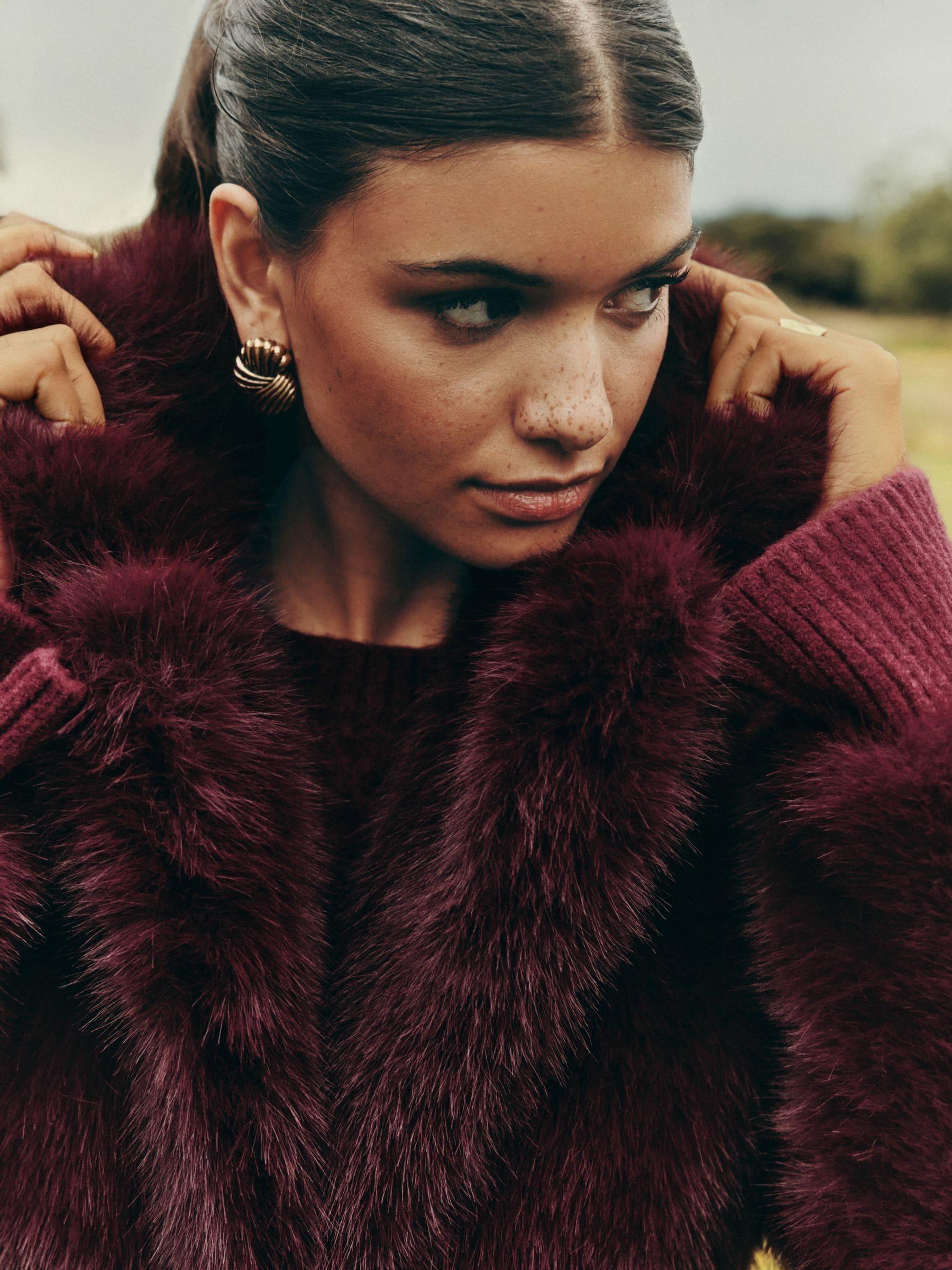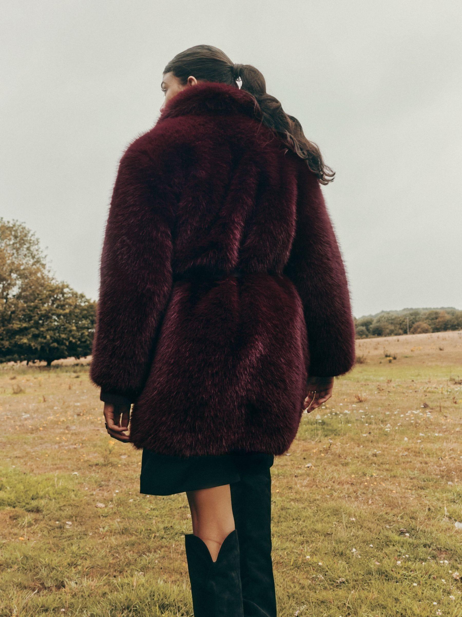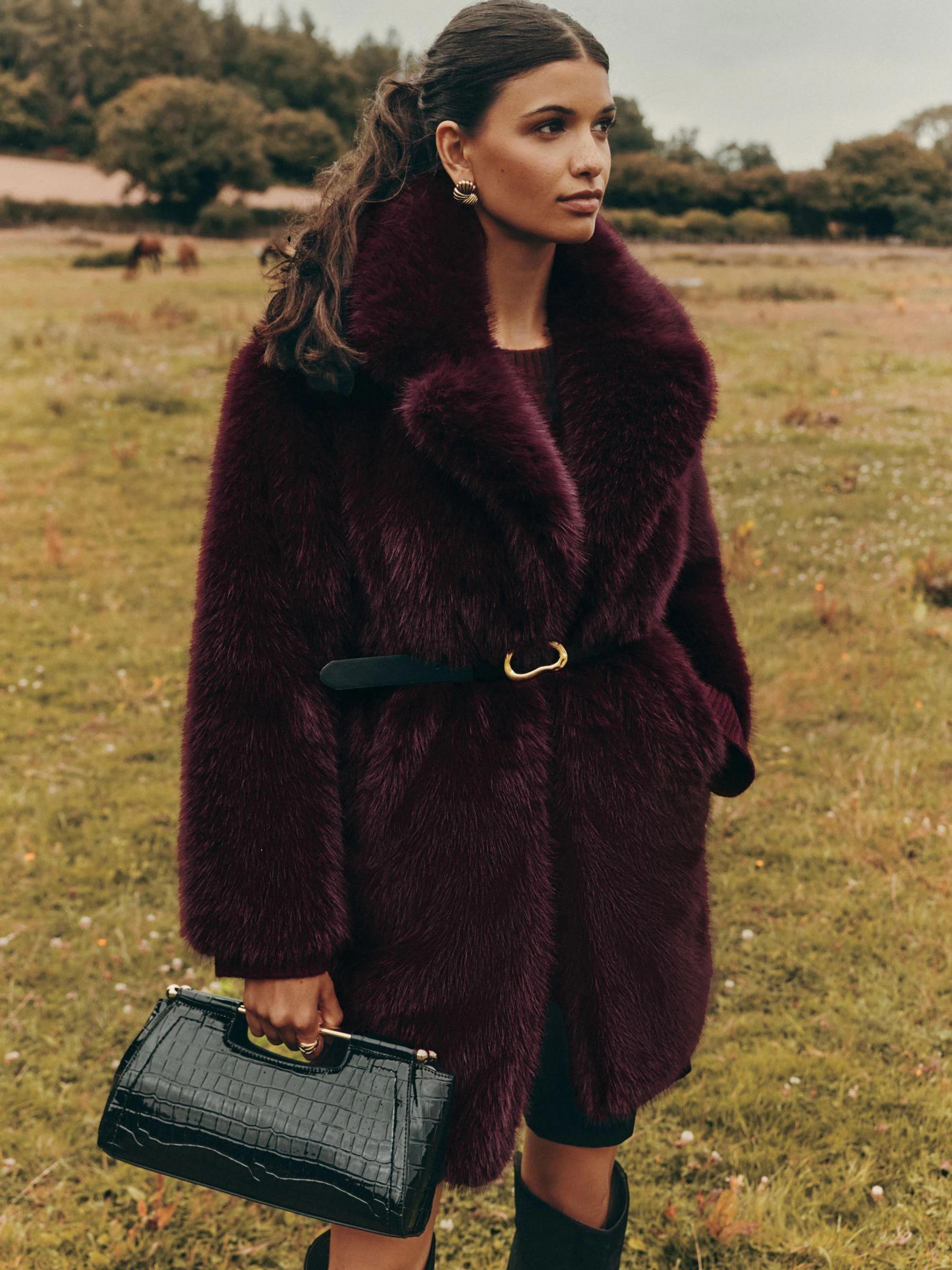 Friends Like These X Lucy Mecklenburgh Burgundy Red Belted Faux Fur Mid Length Coat