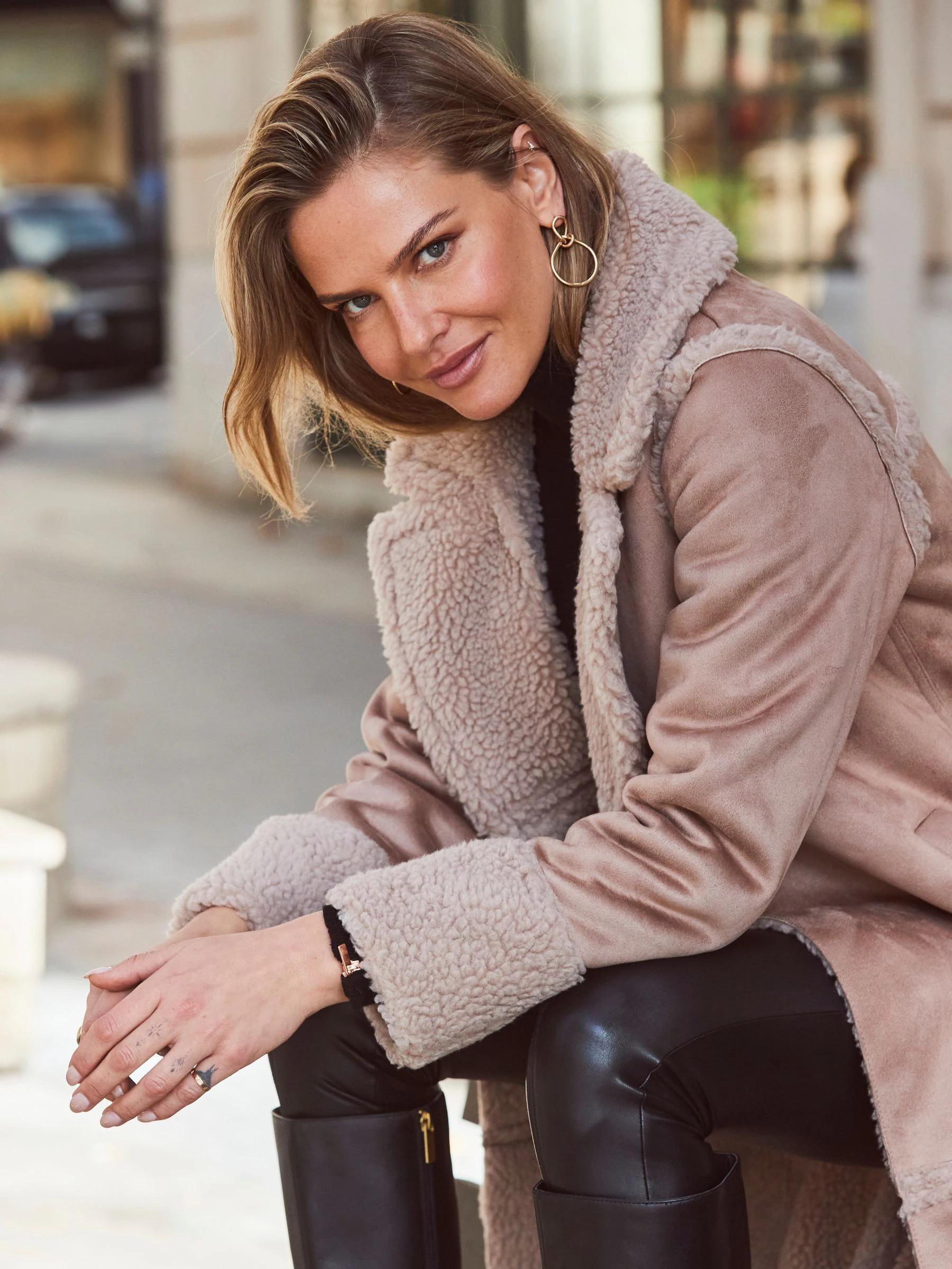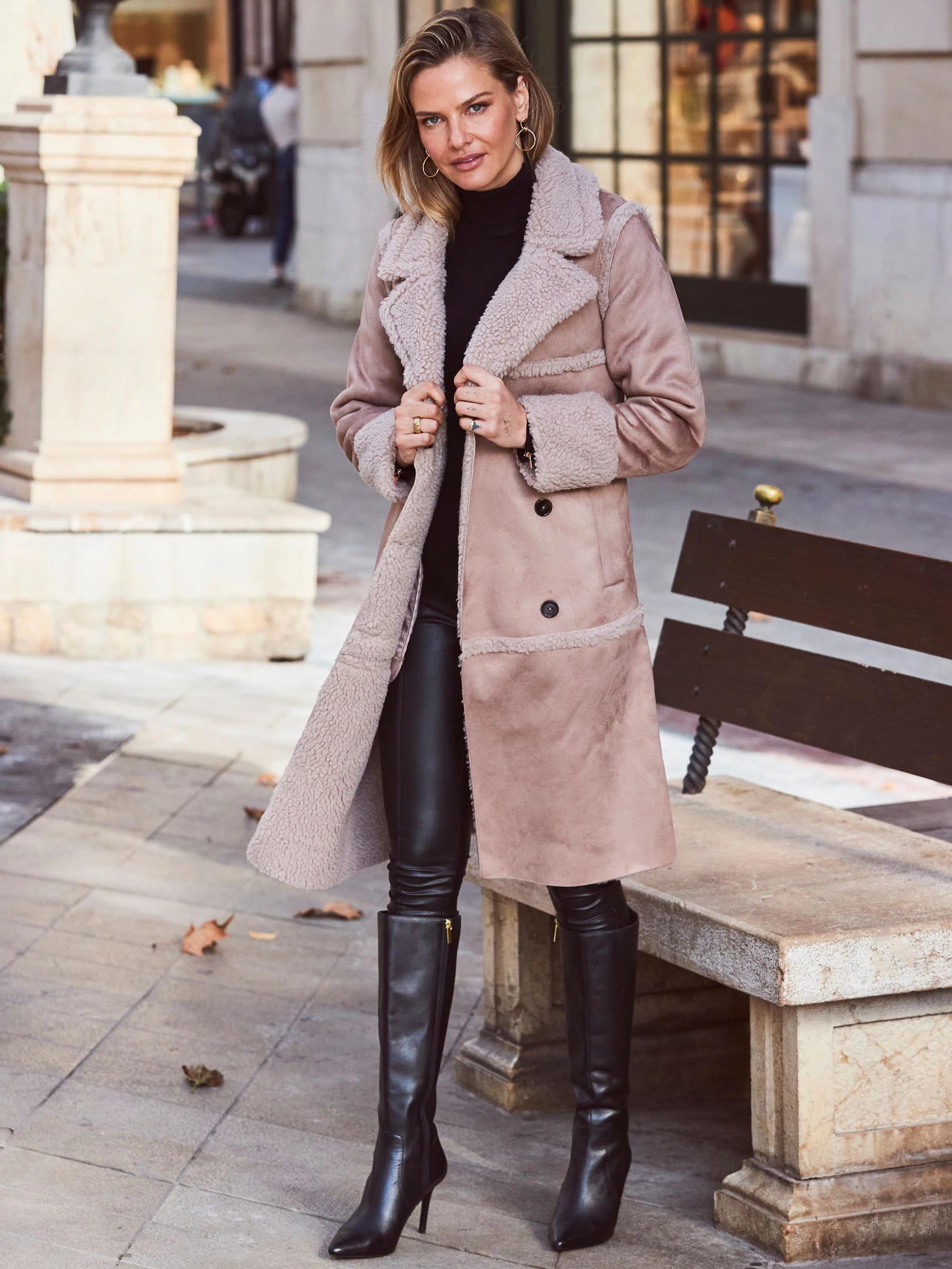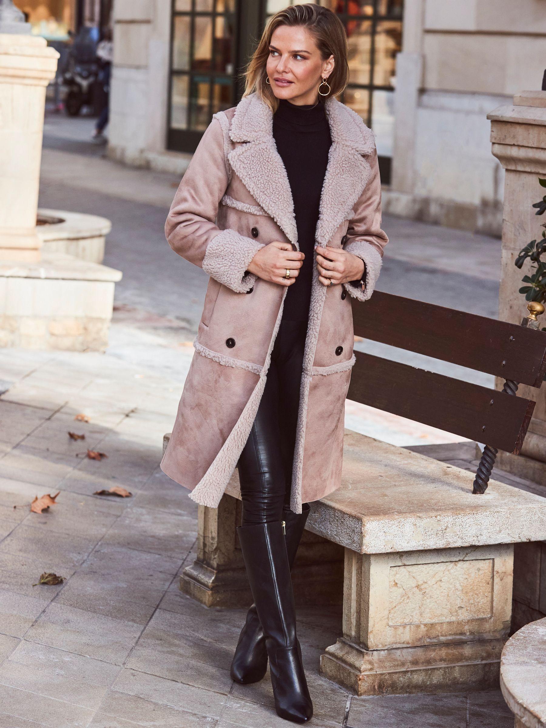 Sosandar Natural Faux Suede & Shearling Double Breasted Coat