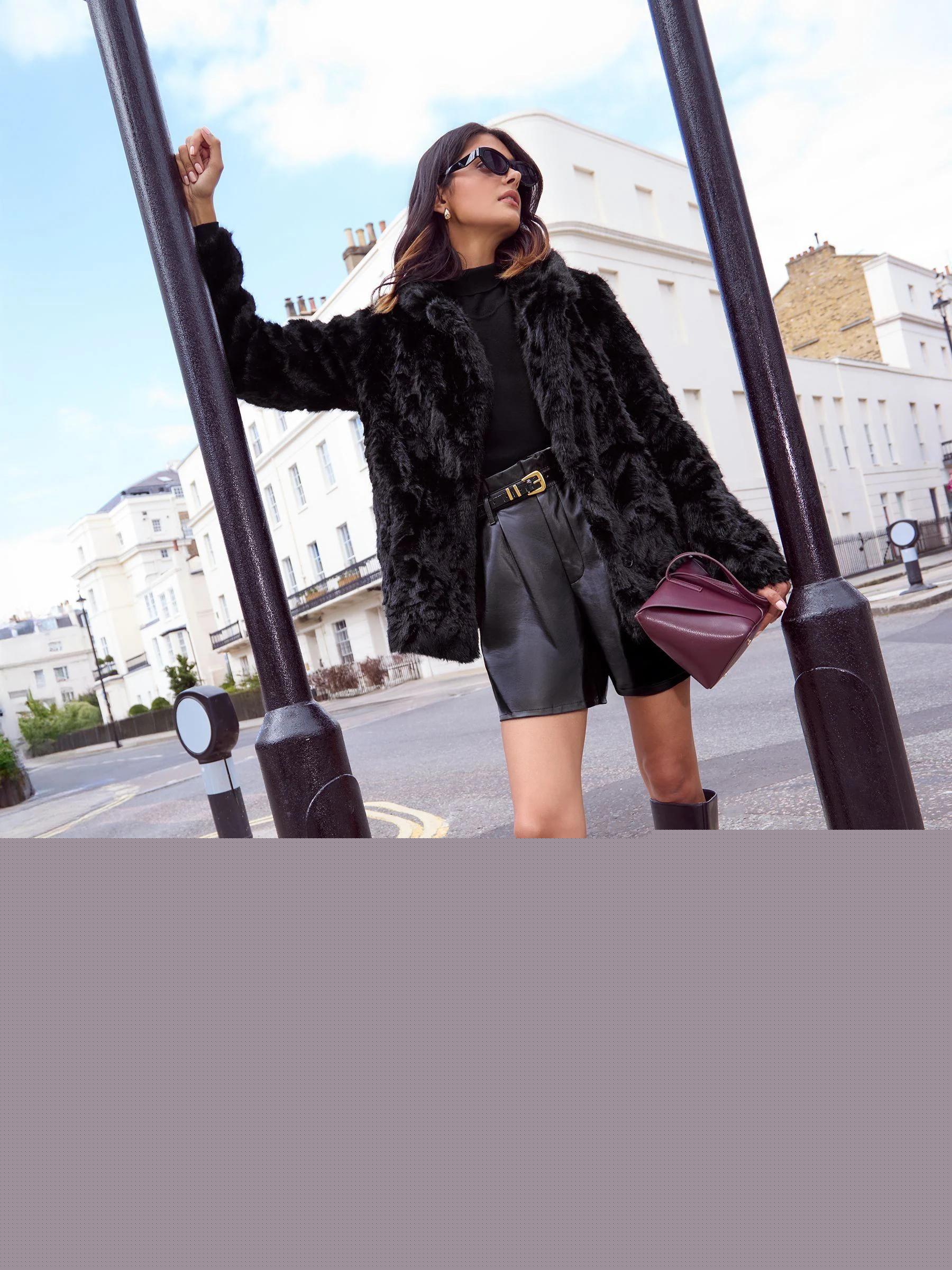 Friends Like These Black Textured Faux Fur Mid Length Coat