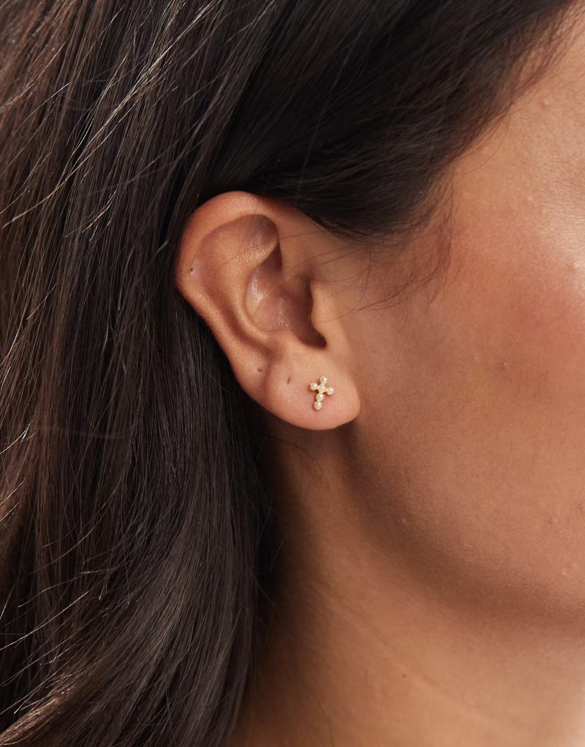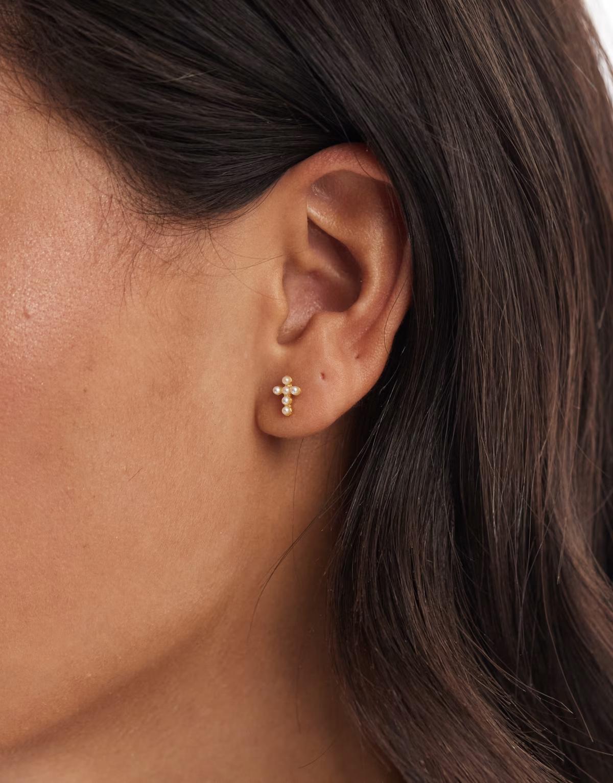 Kingsley Ryan gold plated faux pearl cross stud earrings