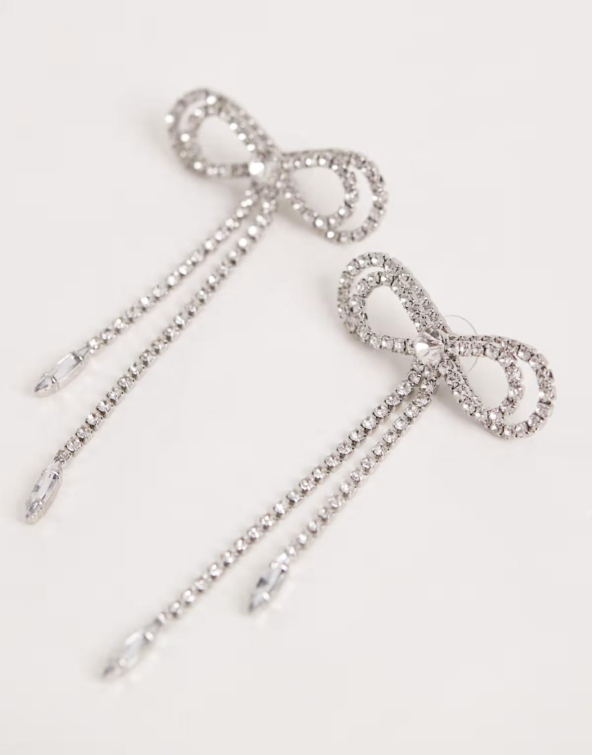 ASOS DESIGN stud earrings with diamante bow design in silver tone