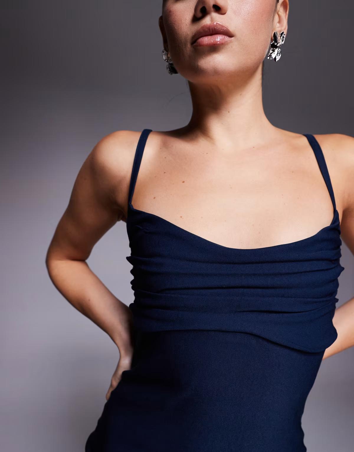Vesper bengaline cami strappy ruched bust midaxi dress in navy