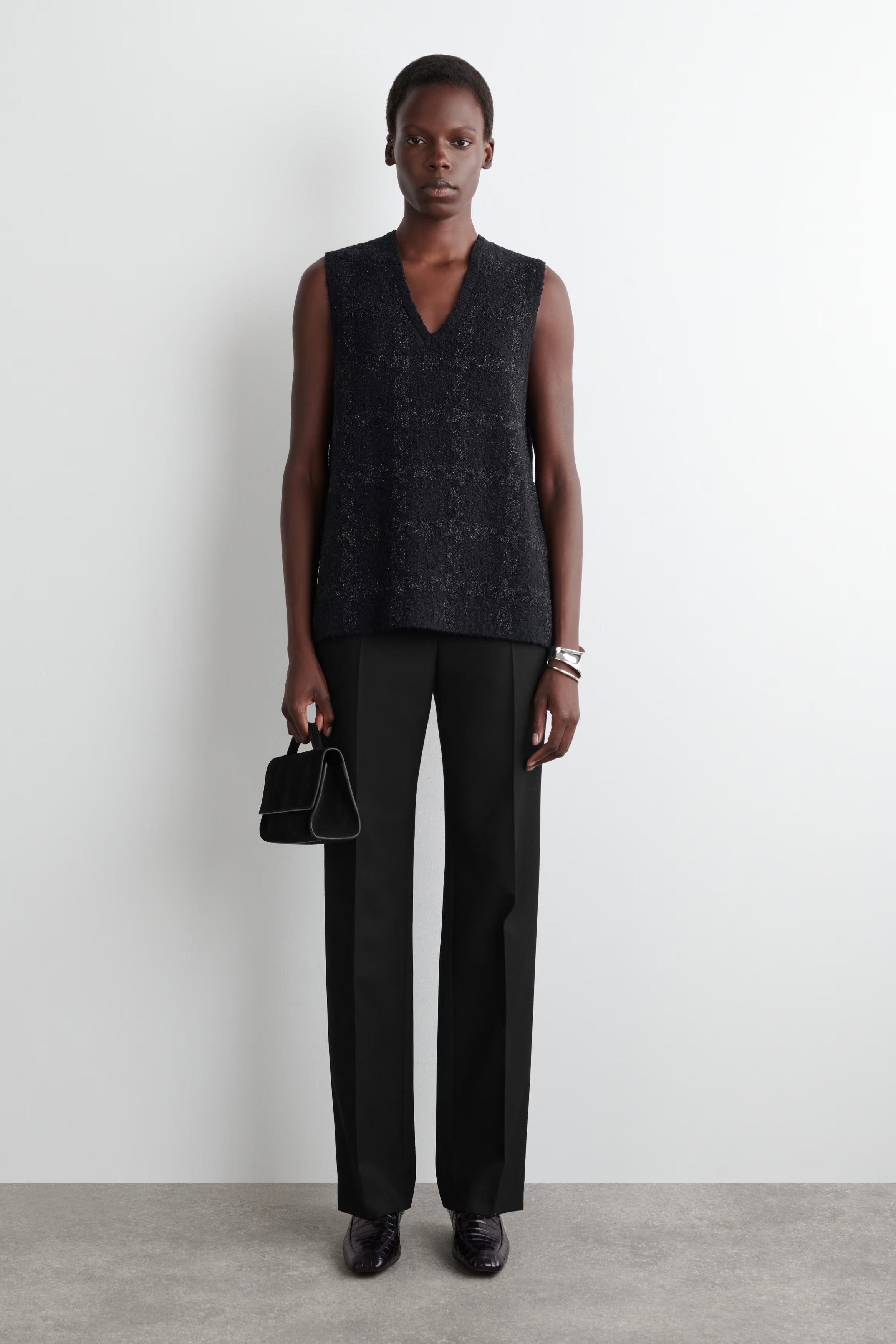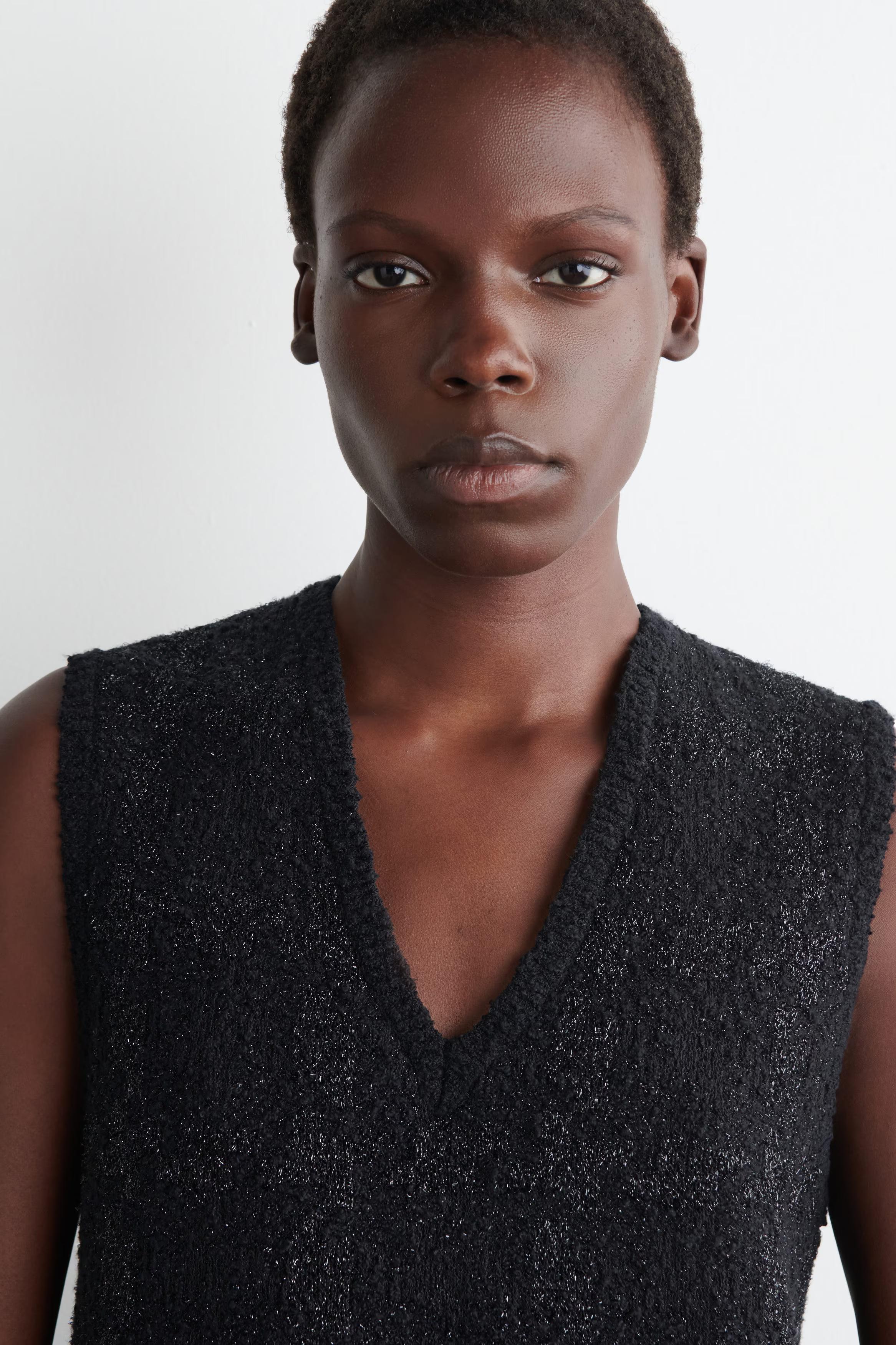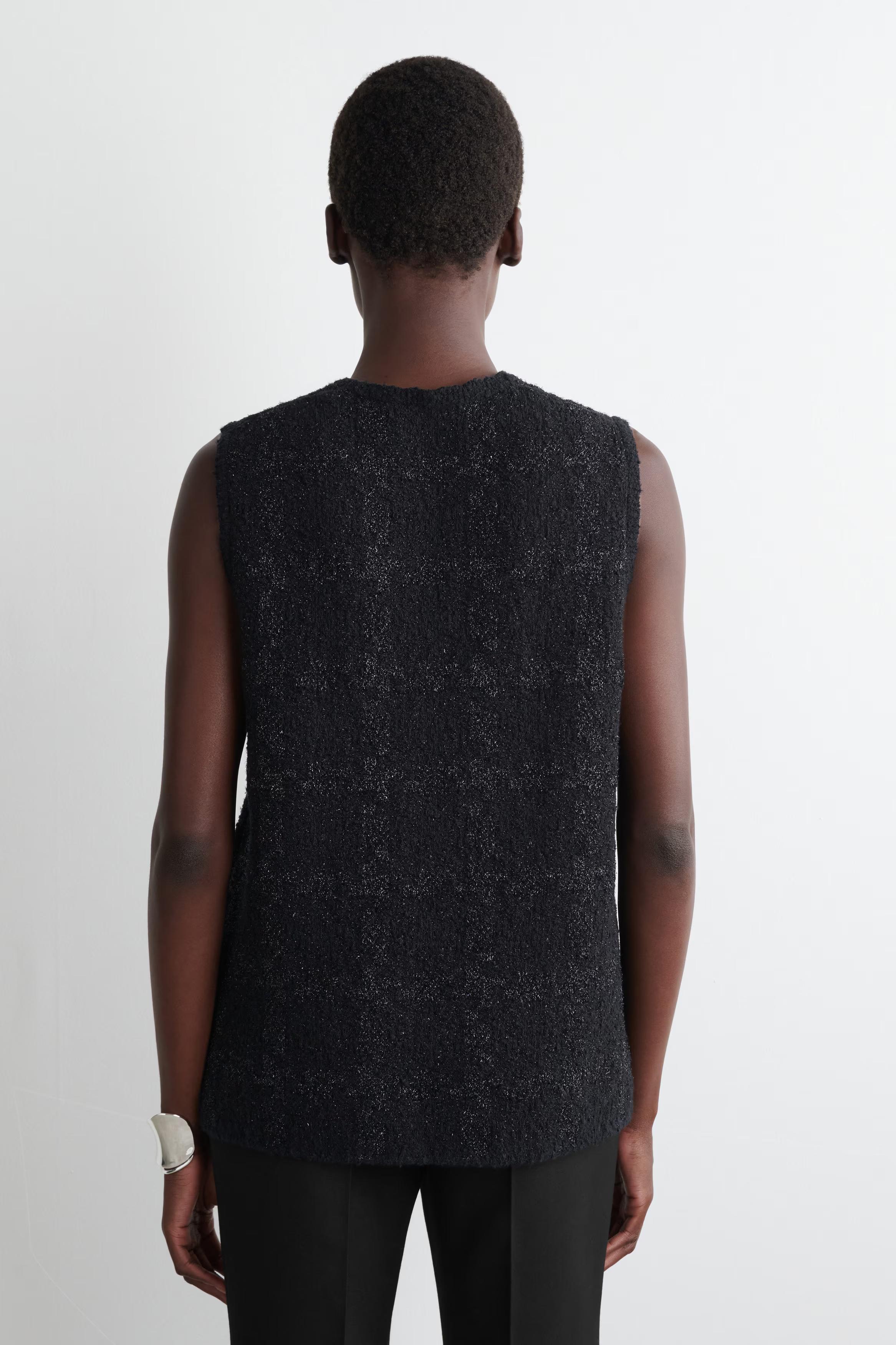 Heritage codes are interpreted through a distinctly modern lens for AW25. Patterned in a classic windowpane check, this V-neck vest is crafted from a tactile boucl\u0026eacute; knit with metallic threads that catch the light. Style it as a co-ord with the matching cardigan\u0026nbsp;and skirt.\u0026nbsp;Regular fitRecycled polyester is polyester made from PET bottles or end-of-life textile waste. The PET bottles or textile waste is mechanically recycled and processed into new yarn\u0026nbsp;Shell: 57% Cotton, 17% Recycled polyester, 14% Recycled polyamide (Recycled nylon), 12% Metallised fibre. Excluding trims / Machine wash\u0026nbsp;Back length of size S is 67cm / Model wears a size S