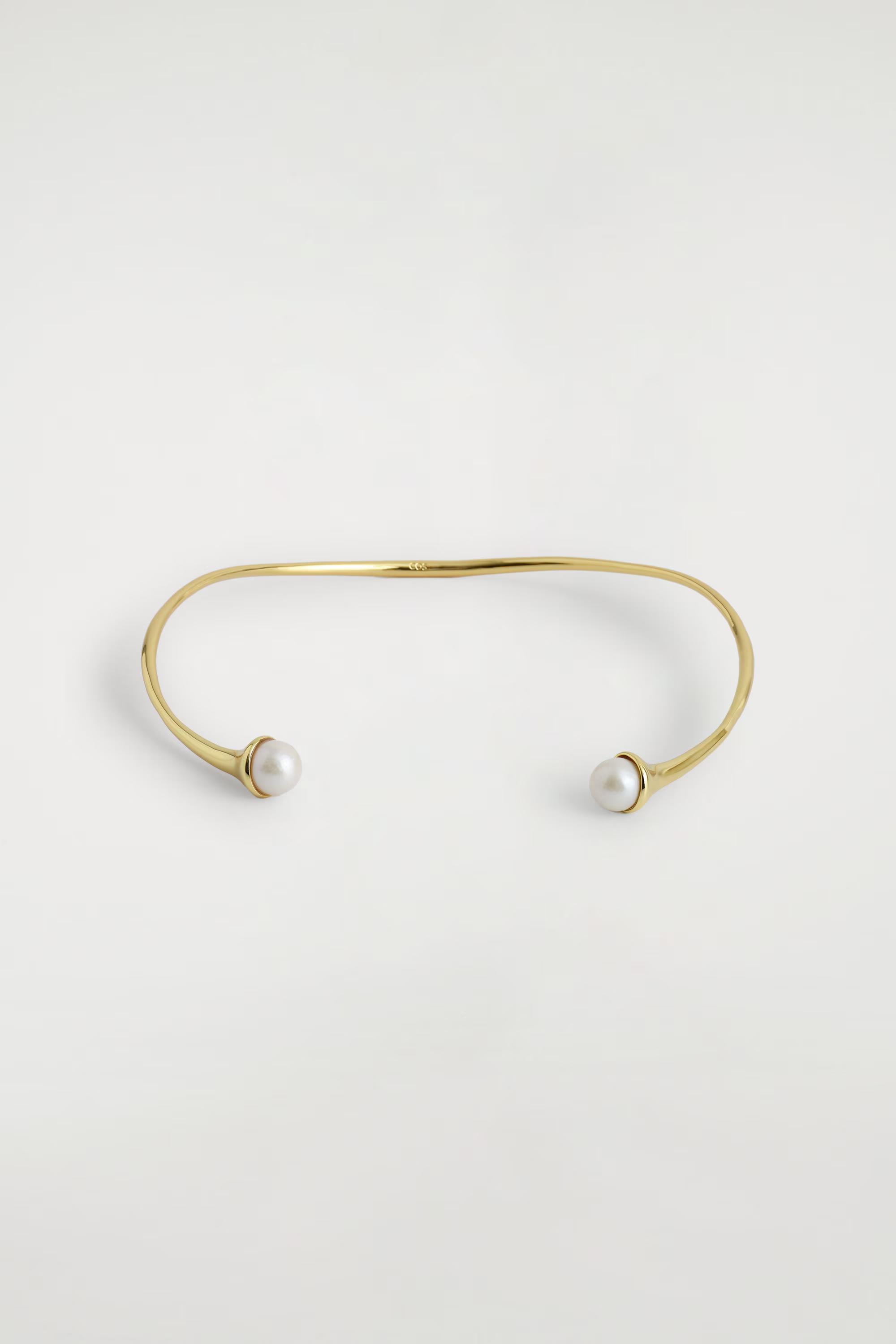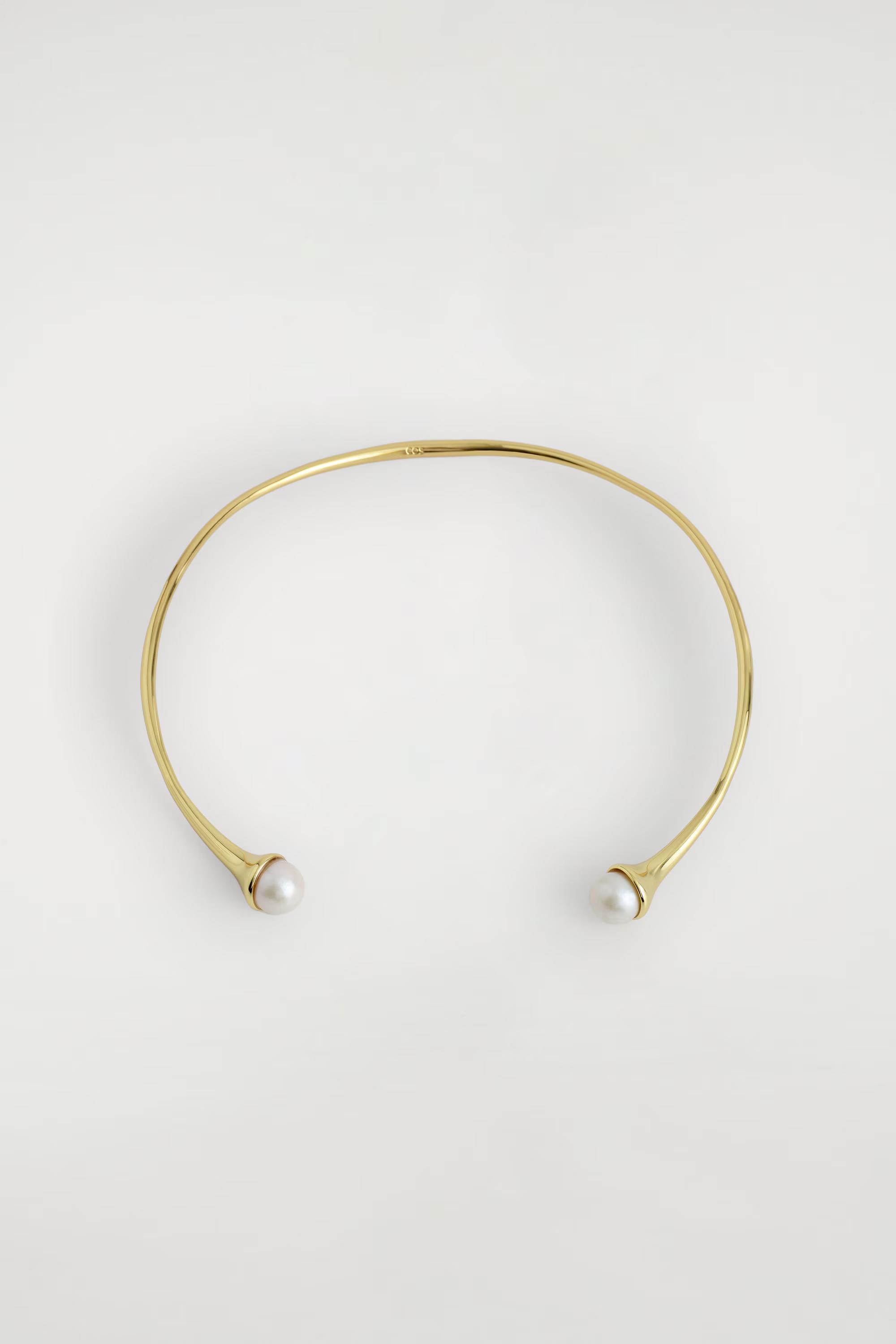 Talking-point accessories lend personality to even the most pared-back looks. Crafted from gold-plated recycled brass, this striking cuff necklace is sculpted in a curved silhouette and tipped with a freshwater pearl at either end.\u0026nbsp;Brass is a versatile material that can be recycled numerous times without losing any of its properties\u0026nbsp;\u0026nbsp;Shell: 95% Post-consumer recycled brass, 5% Freshwater pearl. Plating: 100% Gold. Excluding trims\u0026nbsp;Internal width is 12.5cm