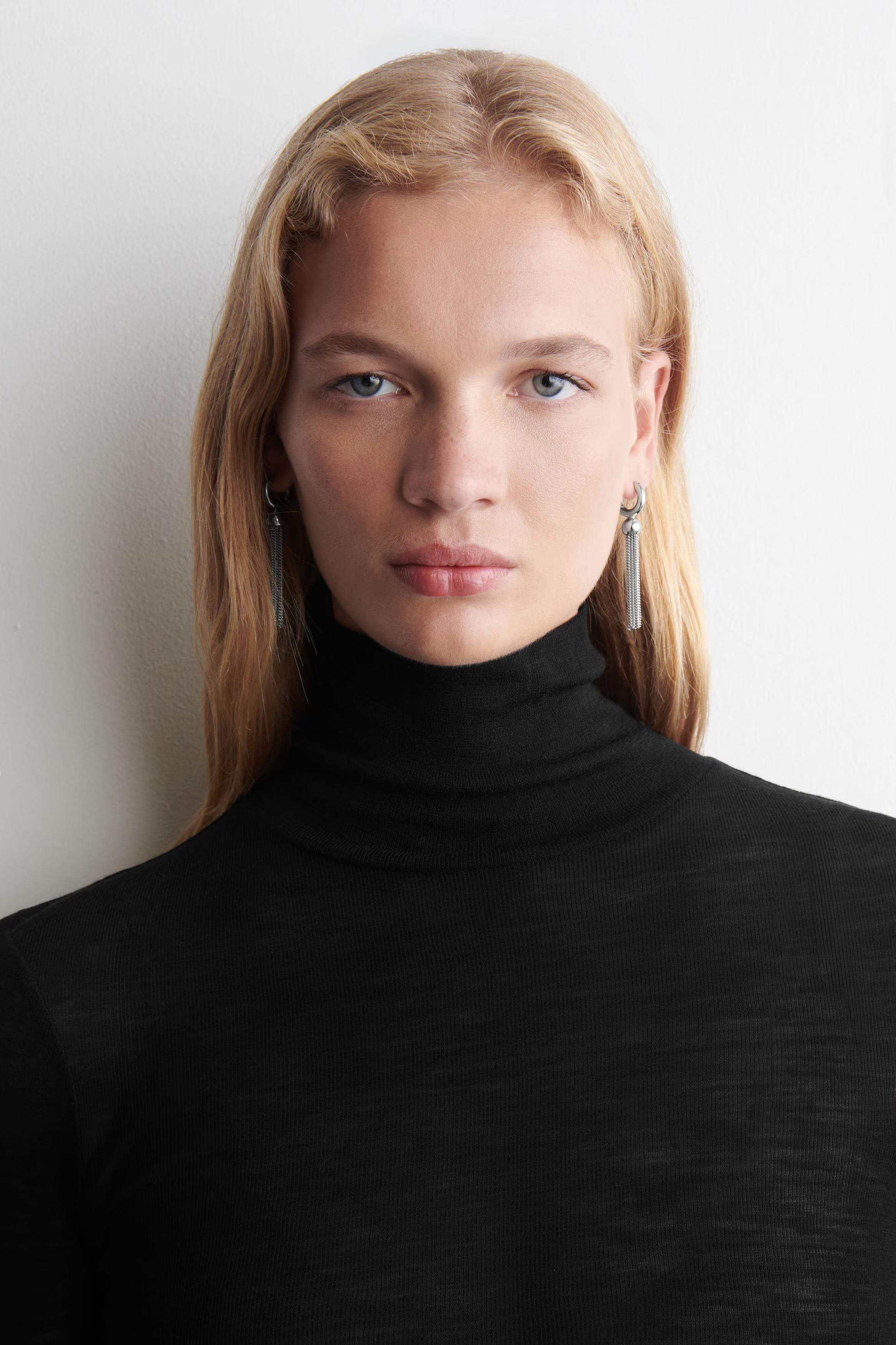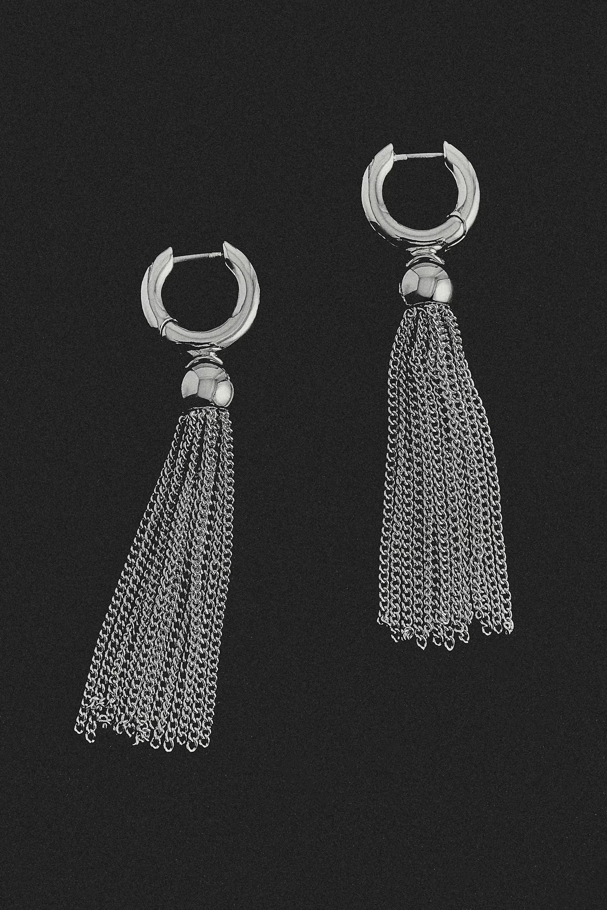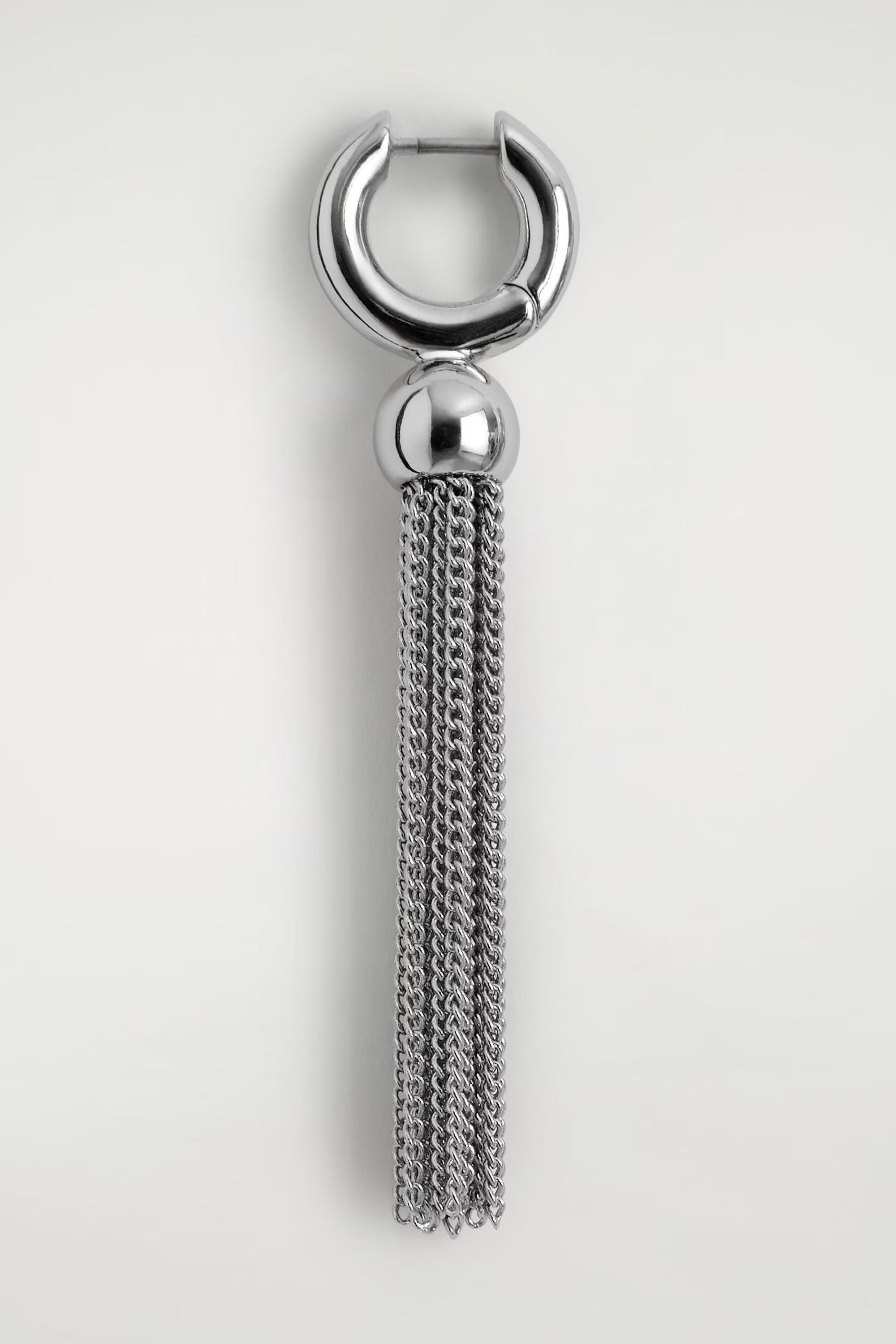 This season, the COS jewellery designers capture the art of simple yet impactful silhouettes. Crafted from silver-plated recycled brass, these striking hoop earrings are detailed with tasselled chains that cascade from a tonal sphere. Style them with your hair tied back.\u0026nbsp;Hinge closureBrass is a versatile material that can be recycled numerous times without losing any of its properties\u0026nbsp;\u0026nbsp;Shell: 100% Post-consumer recycled brass. Plating: 100% Silver. Excluding trims