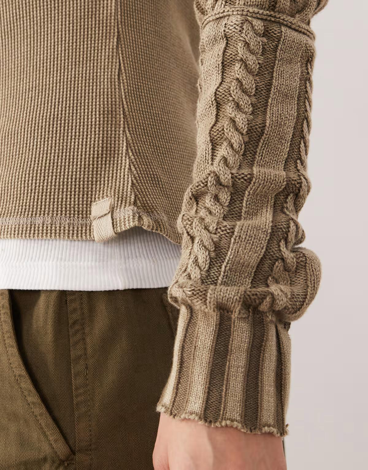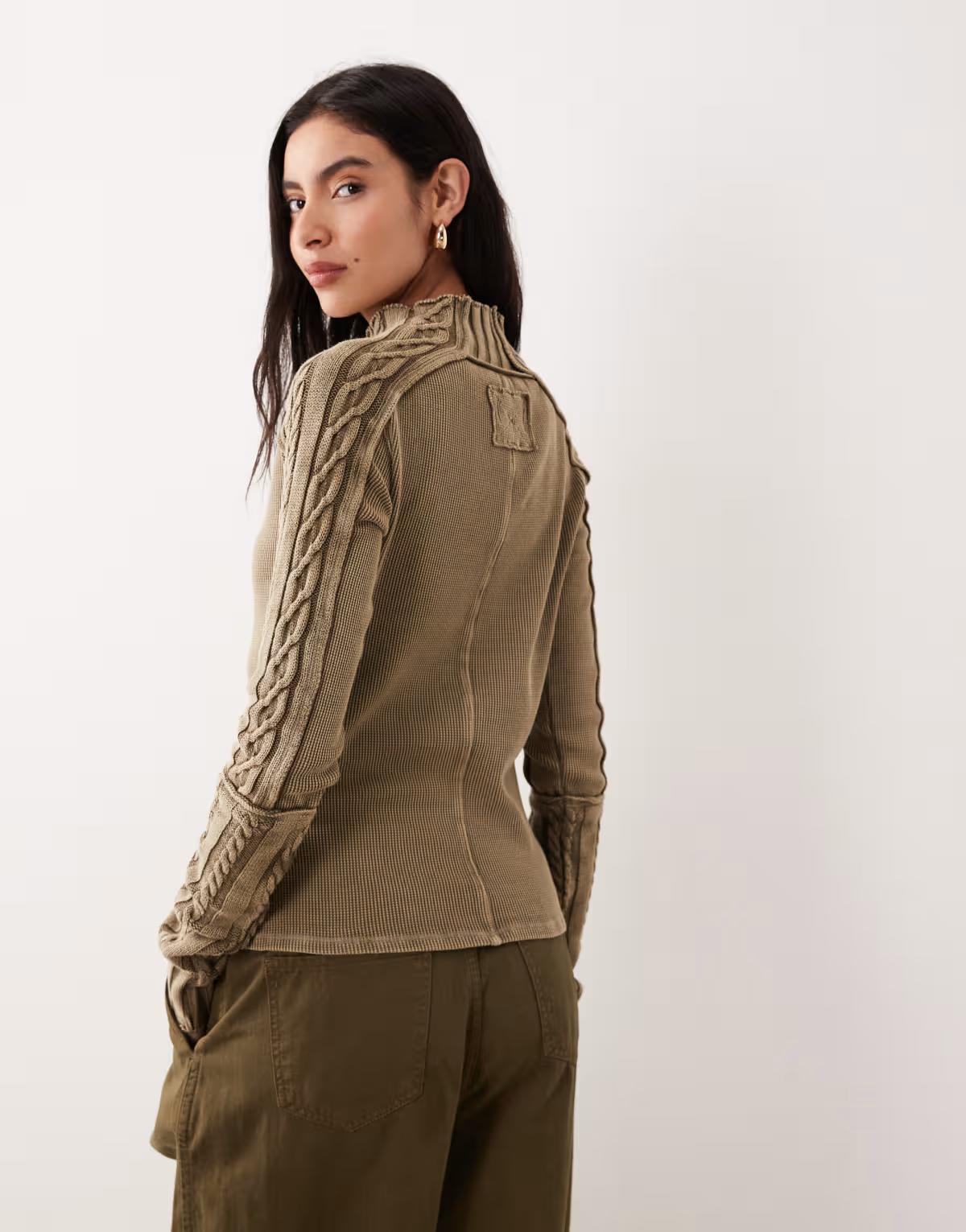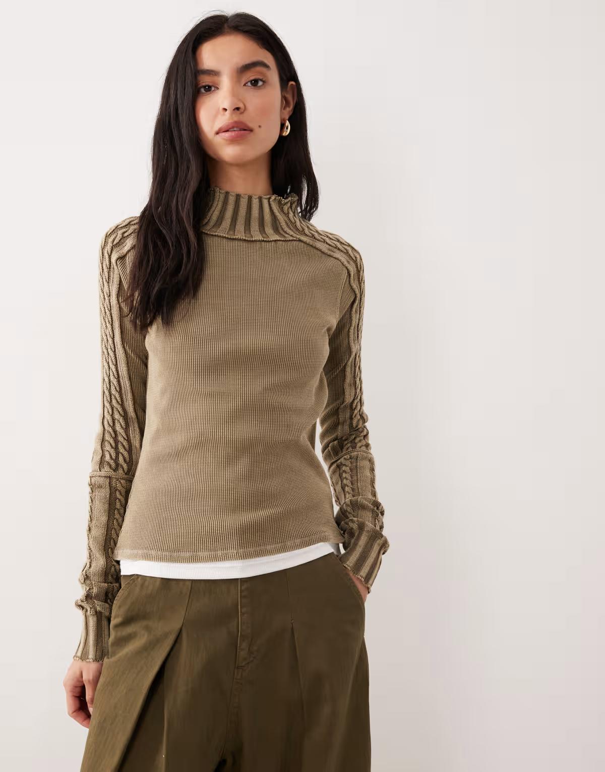 Free People breezy high neck ribbed long sleeve knit in khaki fossil dune