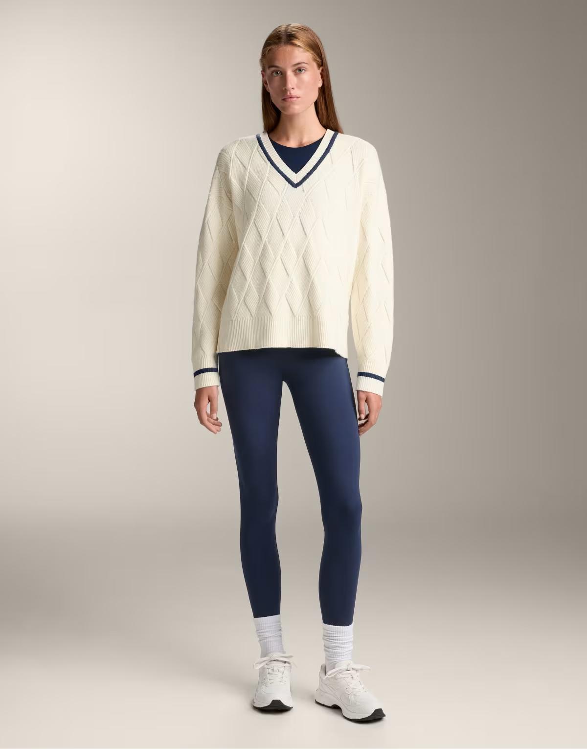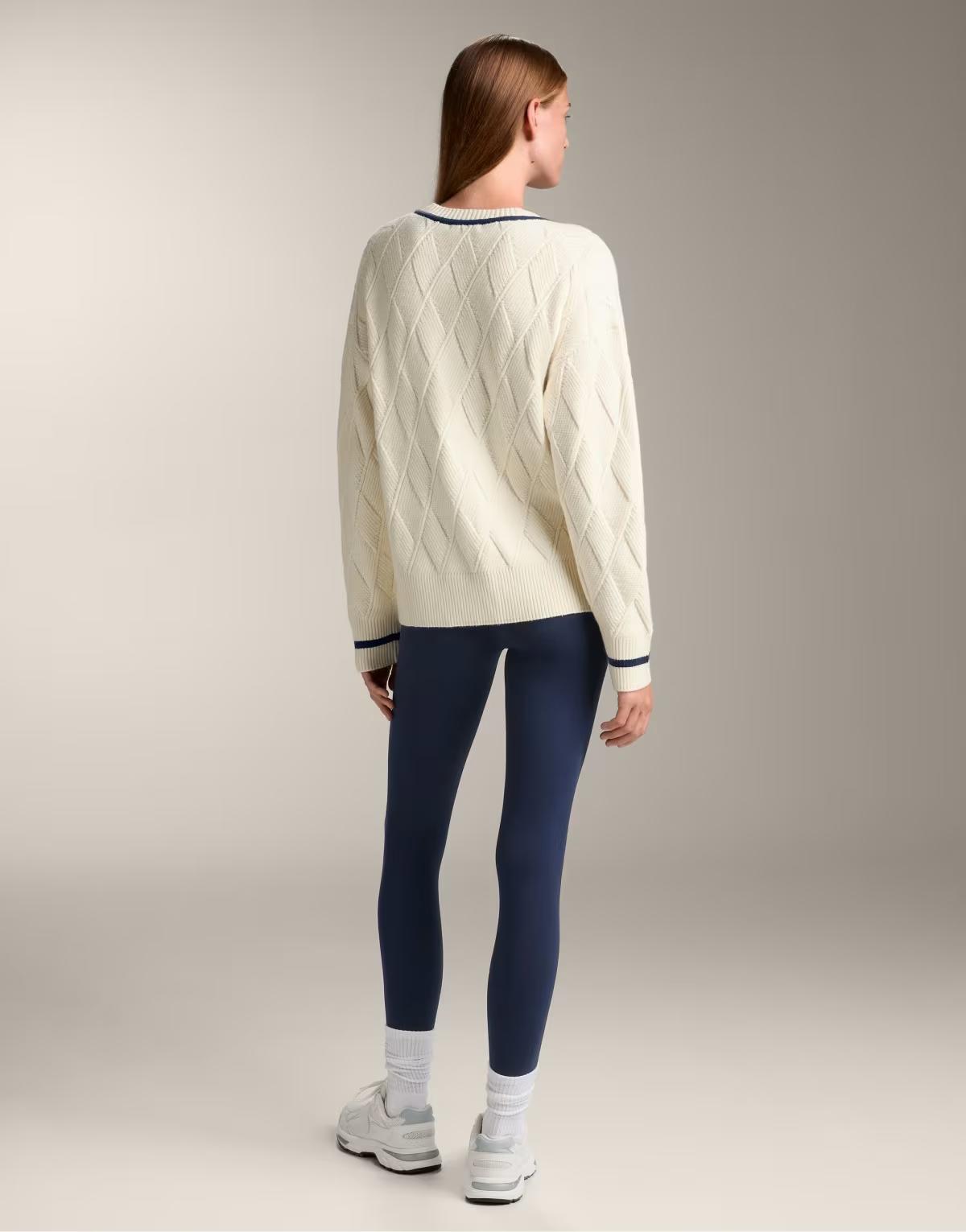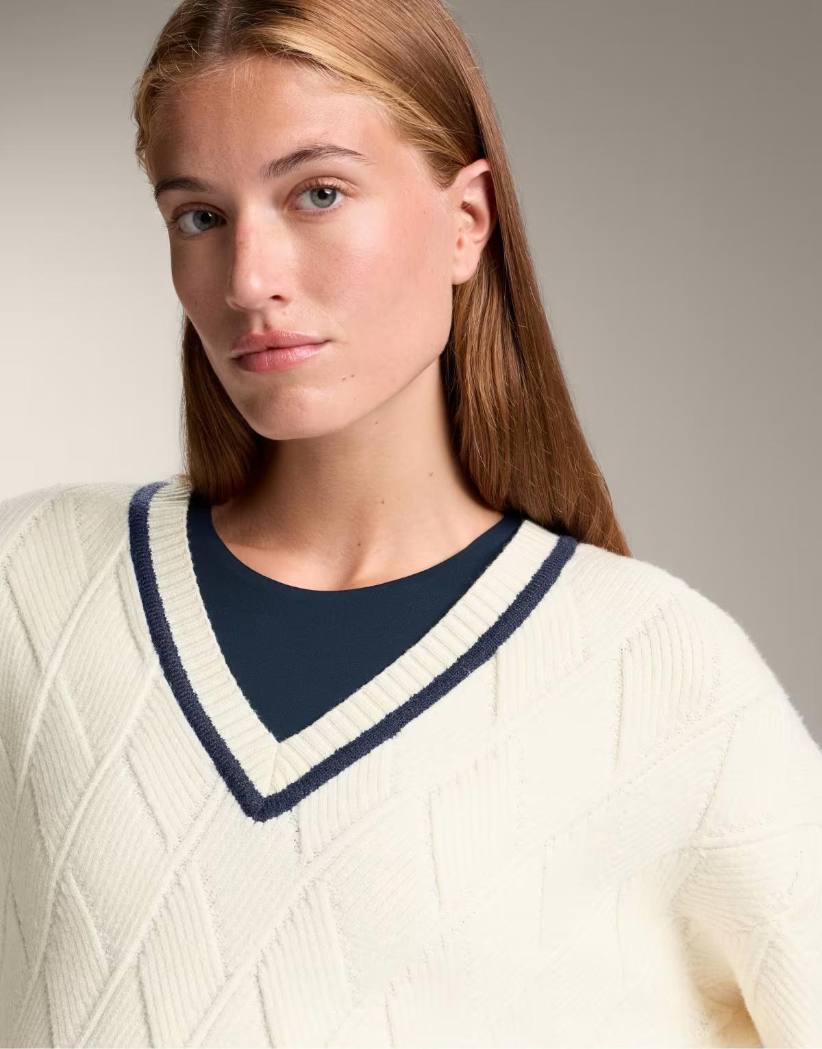 OYSHO V-neck textured knit jumper with diamond pattern in ecru