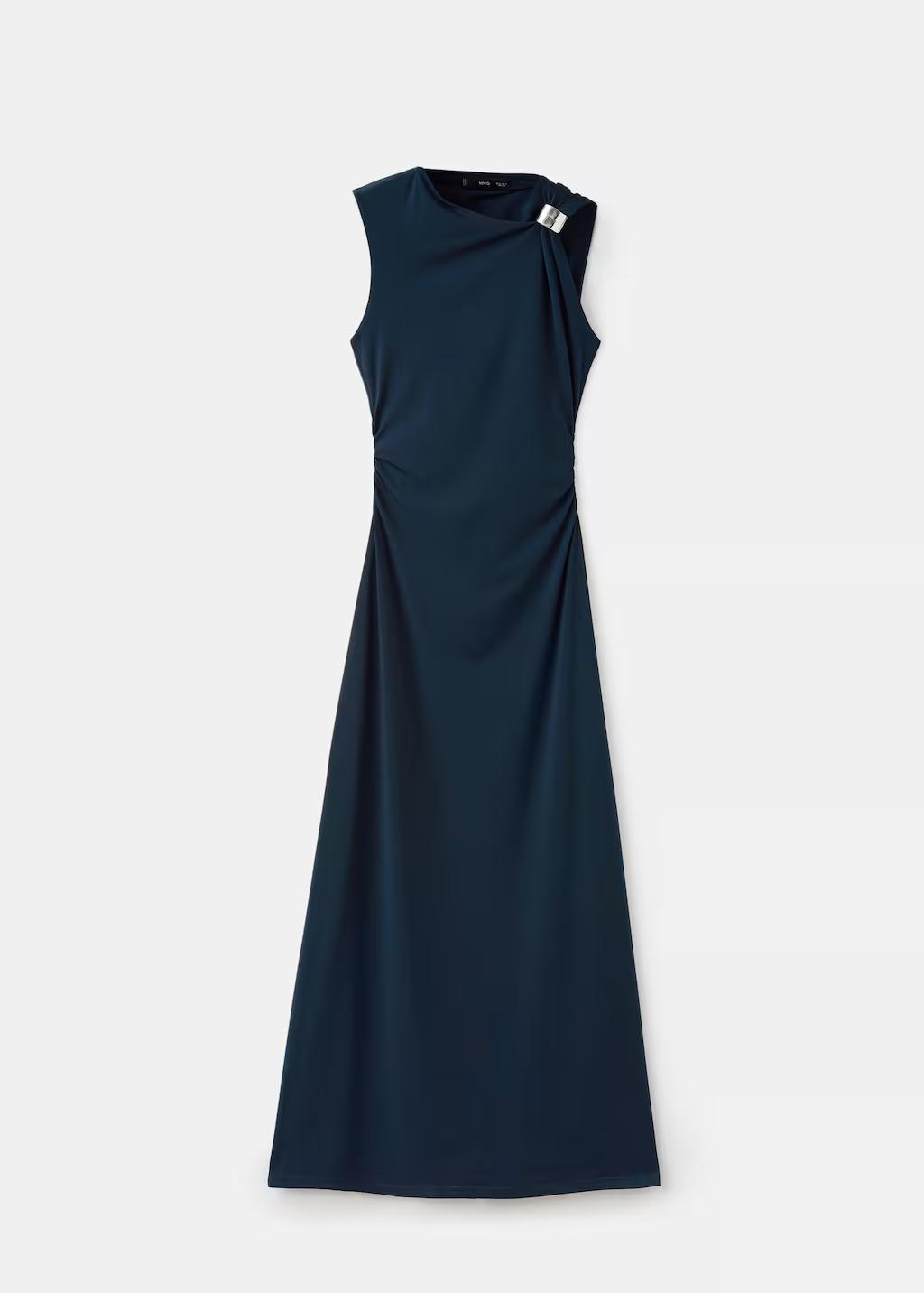 Diseño largo. Diseño entallado. Cuello redondo. Sin mangas. Tirantes anchos. Tirante con detalle metálico. Fruncidos laterales. Esta prenda pertenece a nuestra colección de fiesta y evento, diseñada para elevar tus looks en ocasiones especiales