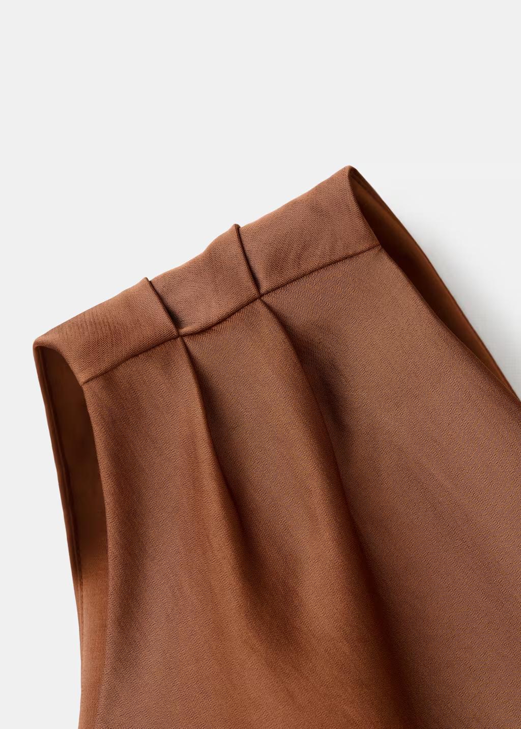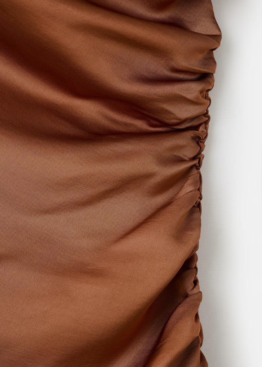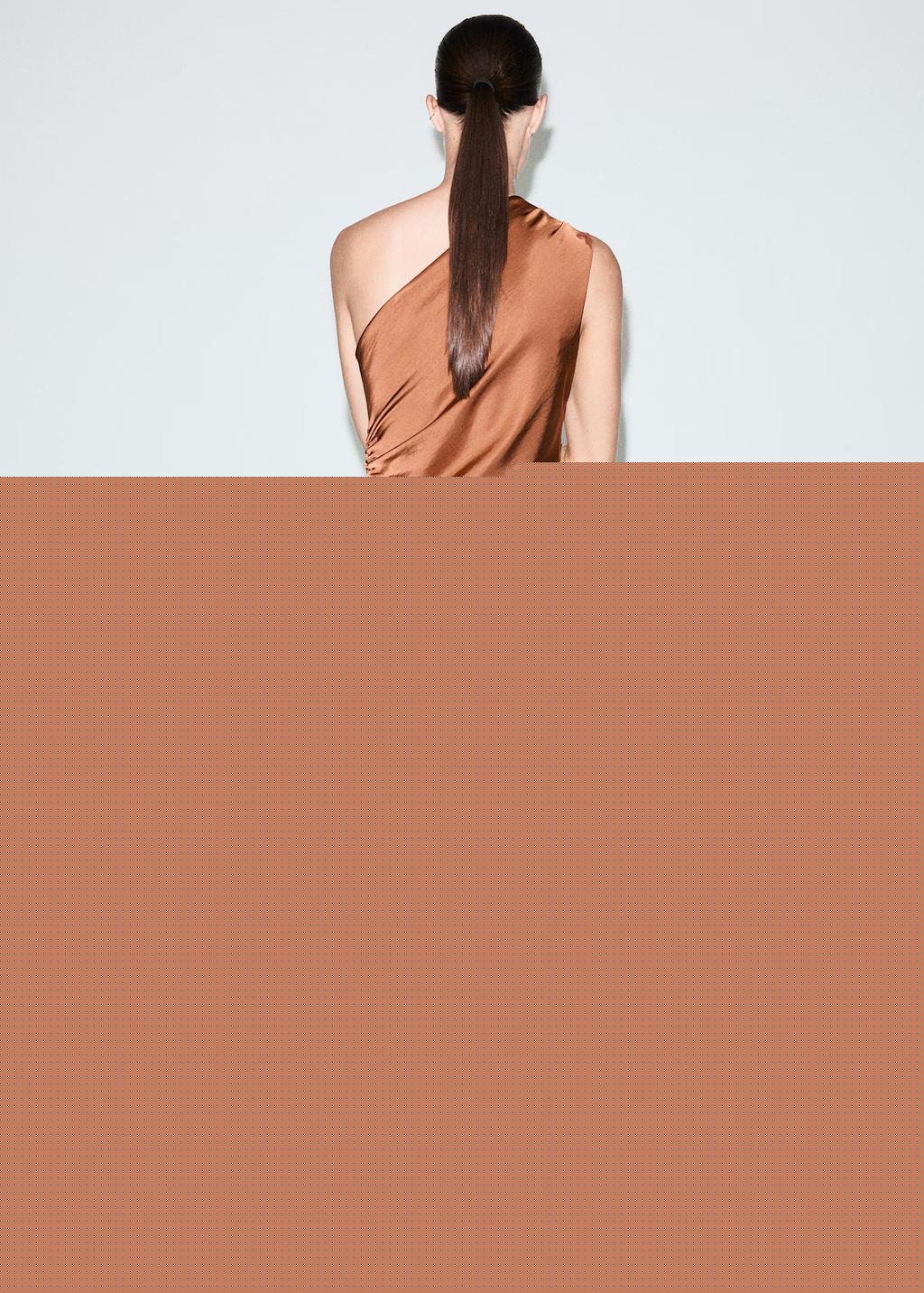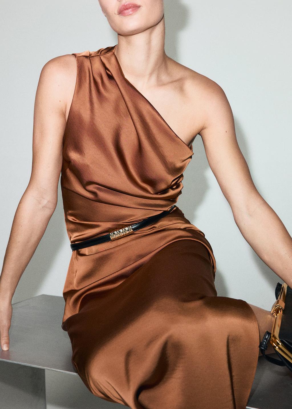 Tejido satinado. Diseño midi. Diseño entallado. Cuello asimétrico. Sin mangas. Fruncido lateral. Abertura latera en el bajo. Cierre de cremallera lateral. Esta prenda pertenece a nuestra colección de fiesta y evento, diseñada para elevar tus looks en ocasiones especiales