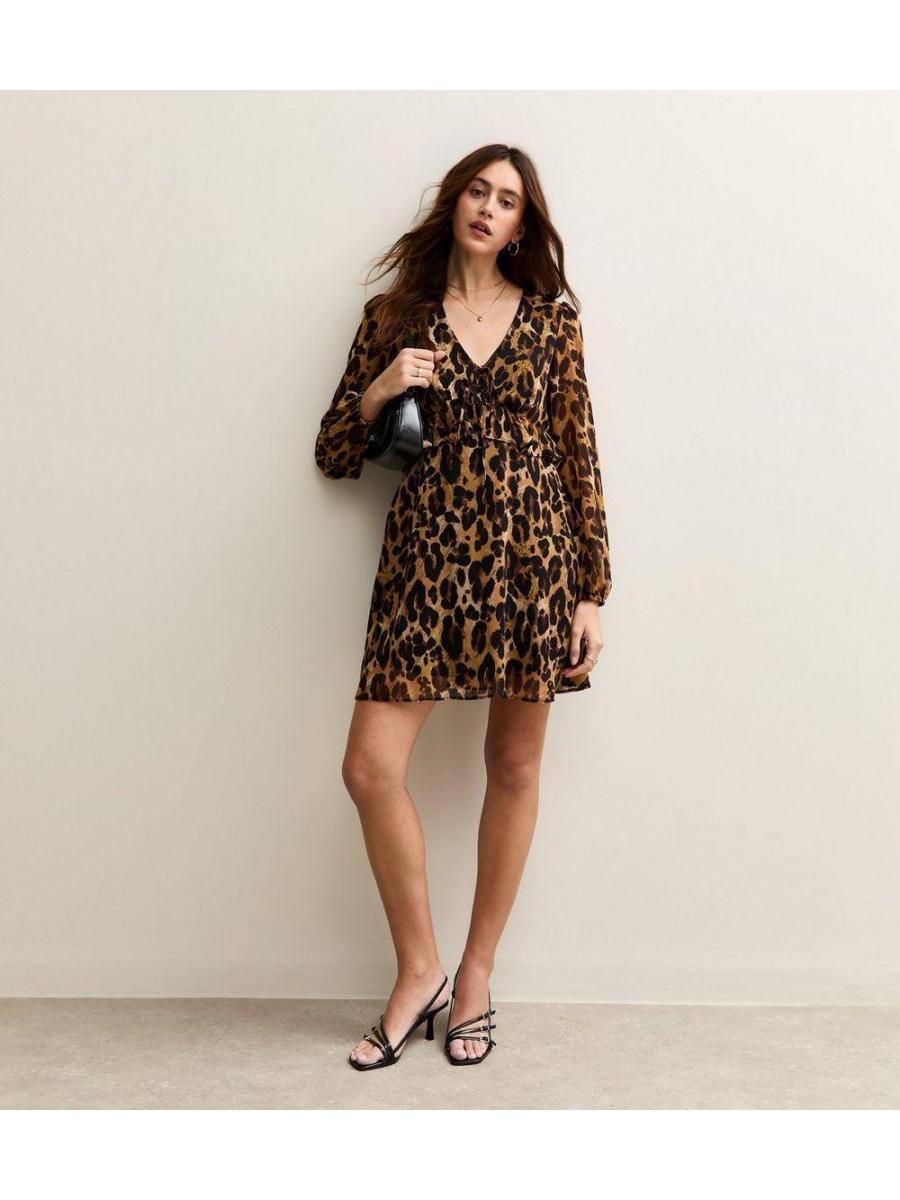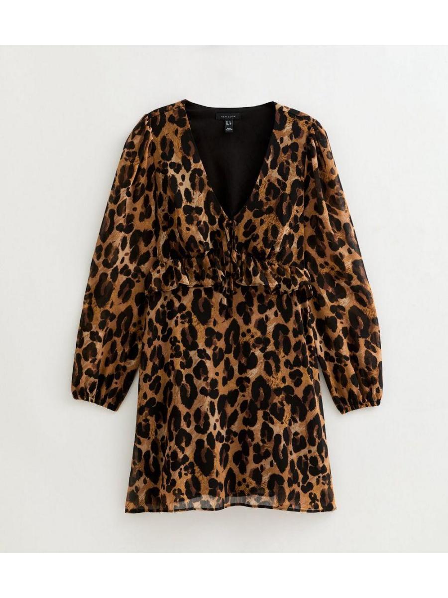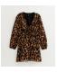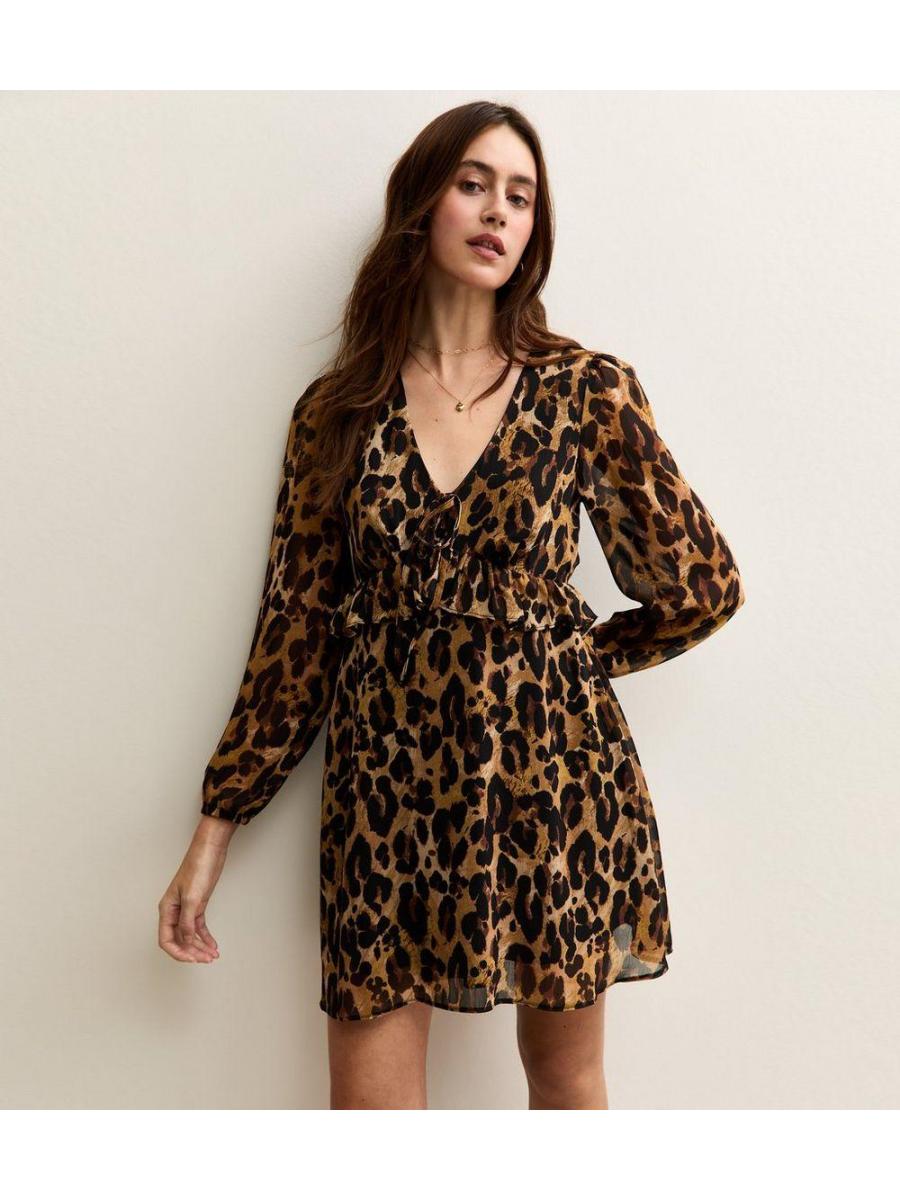 Brown Leopard Print Chiffon Long Sleeve Mini Dress