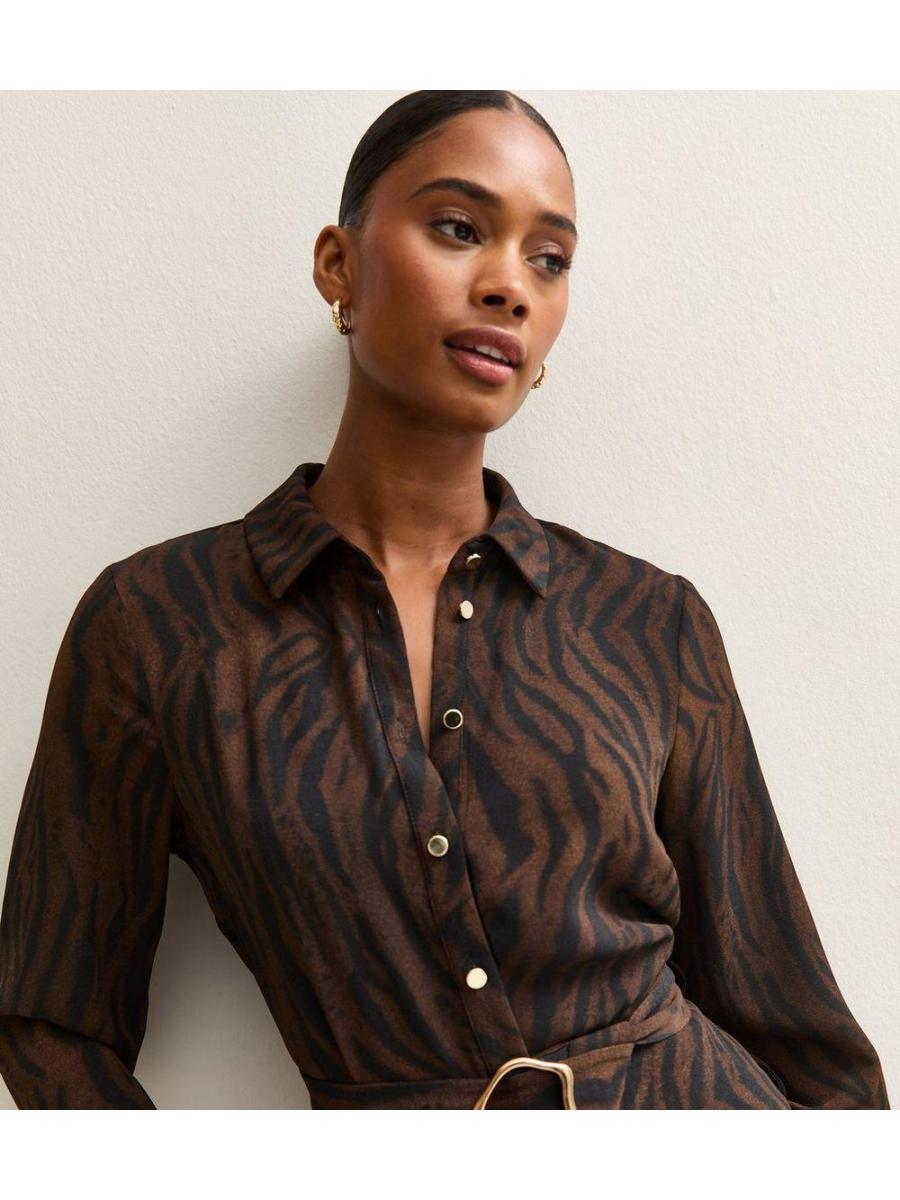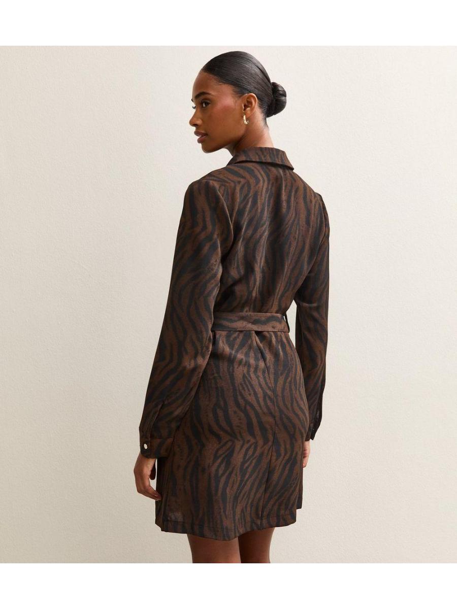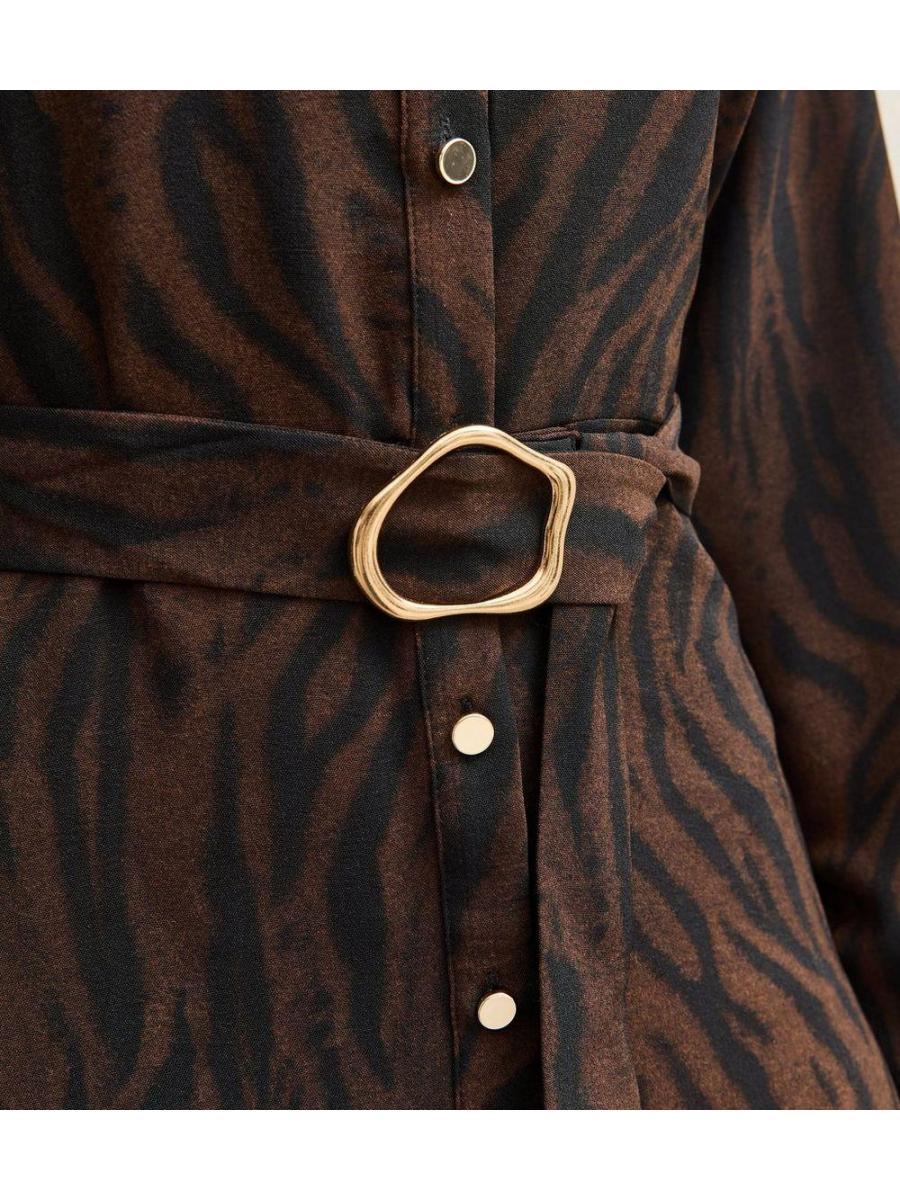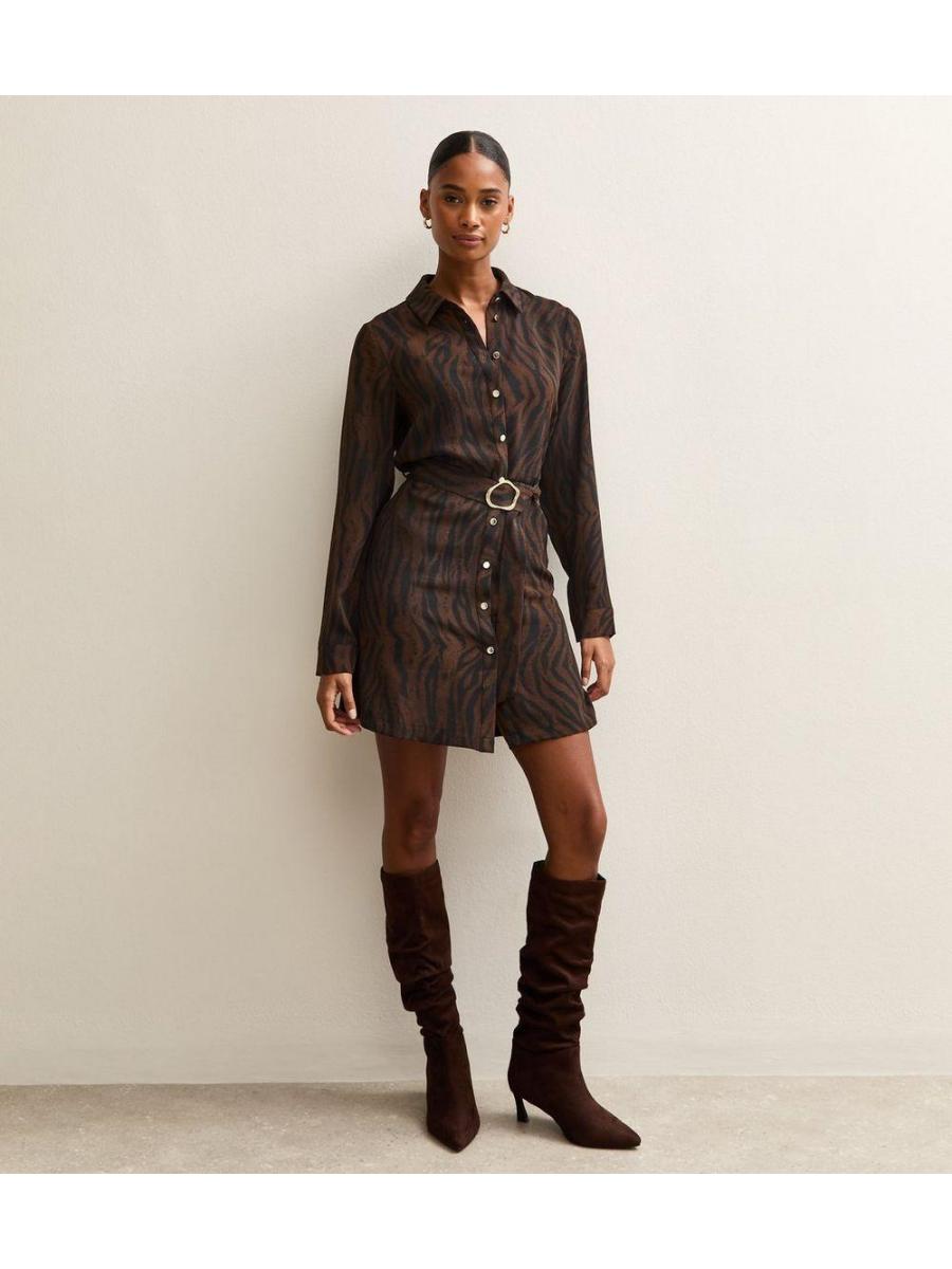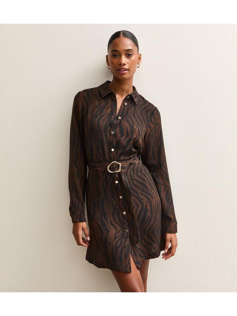 Brown Tiger Print Buckle Detail Mini Shirt Dress
