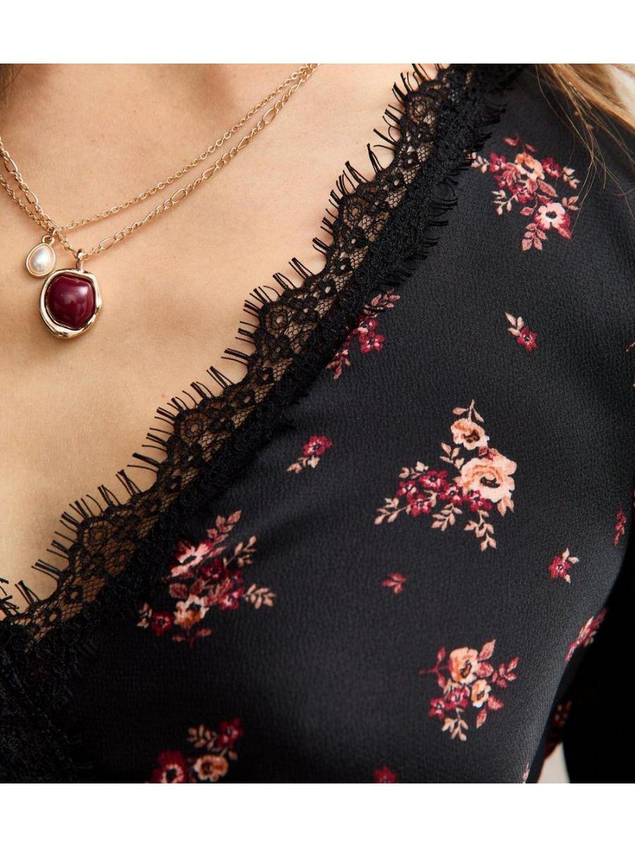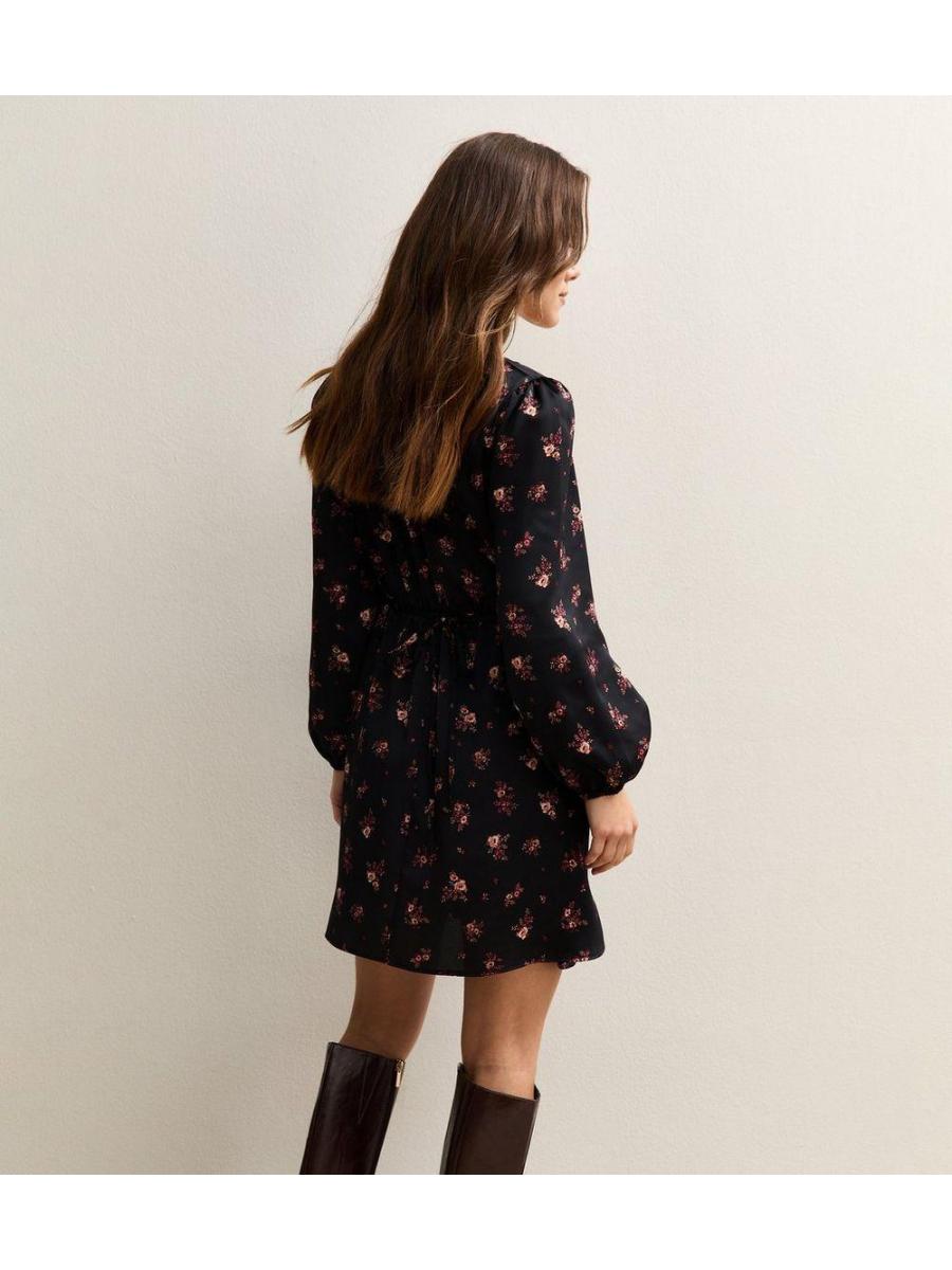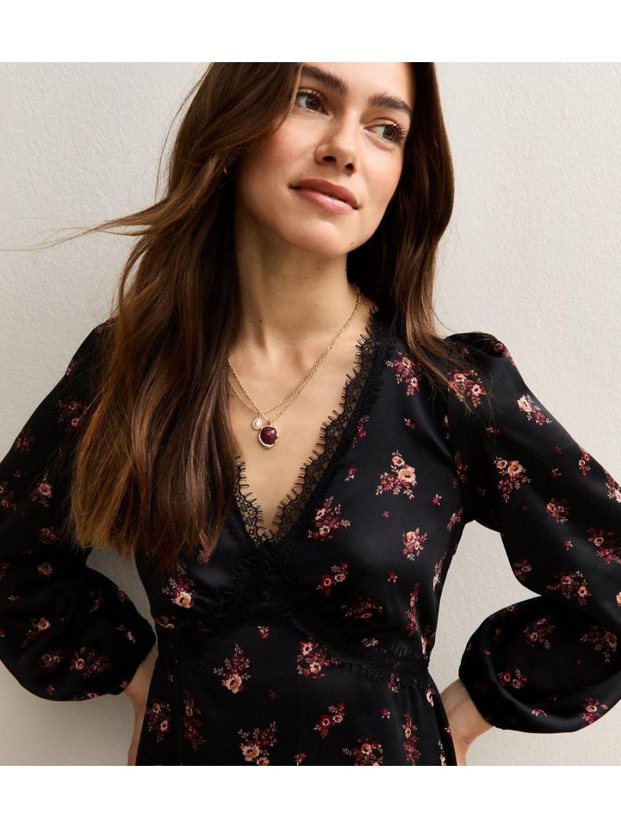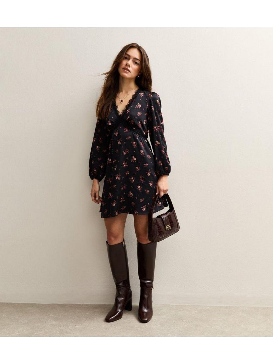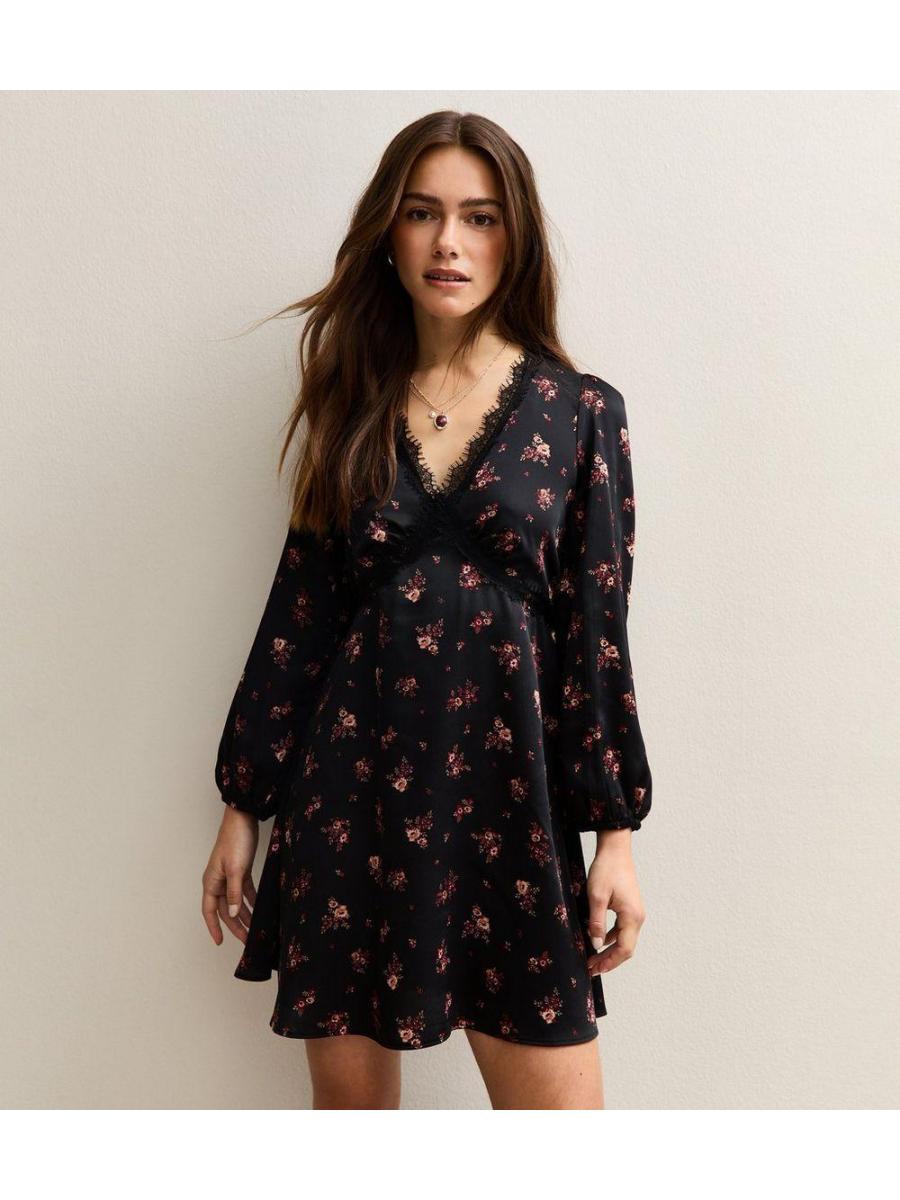 Petite Black Ditsy Print Satin Lace Trim Mini Dress