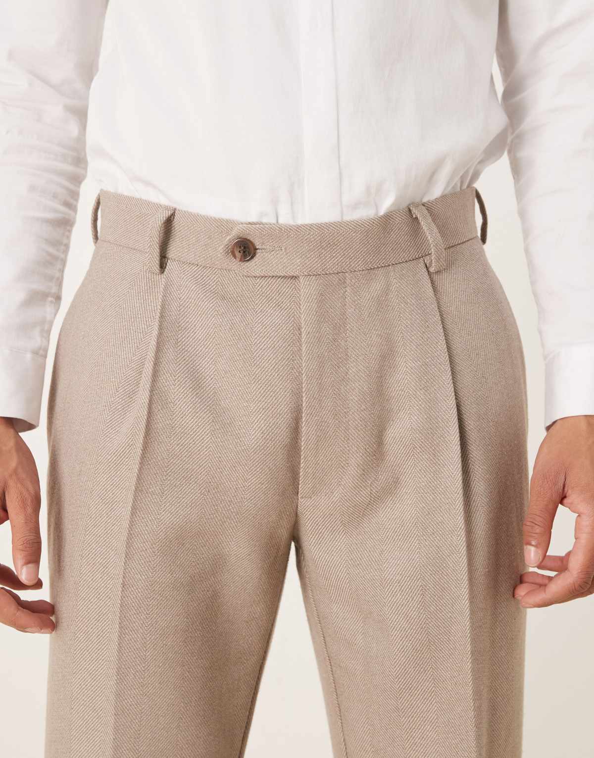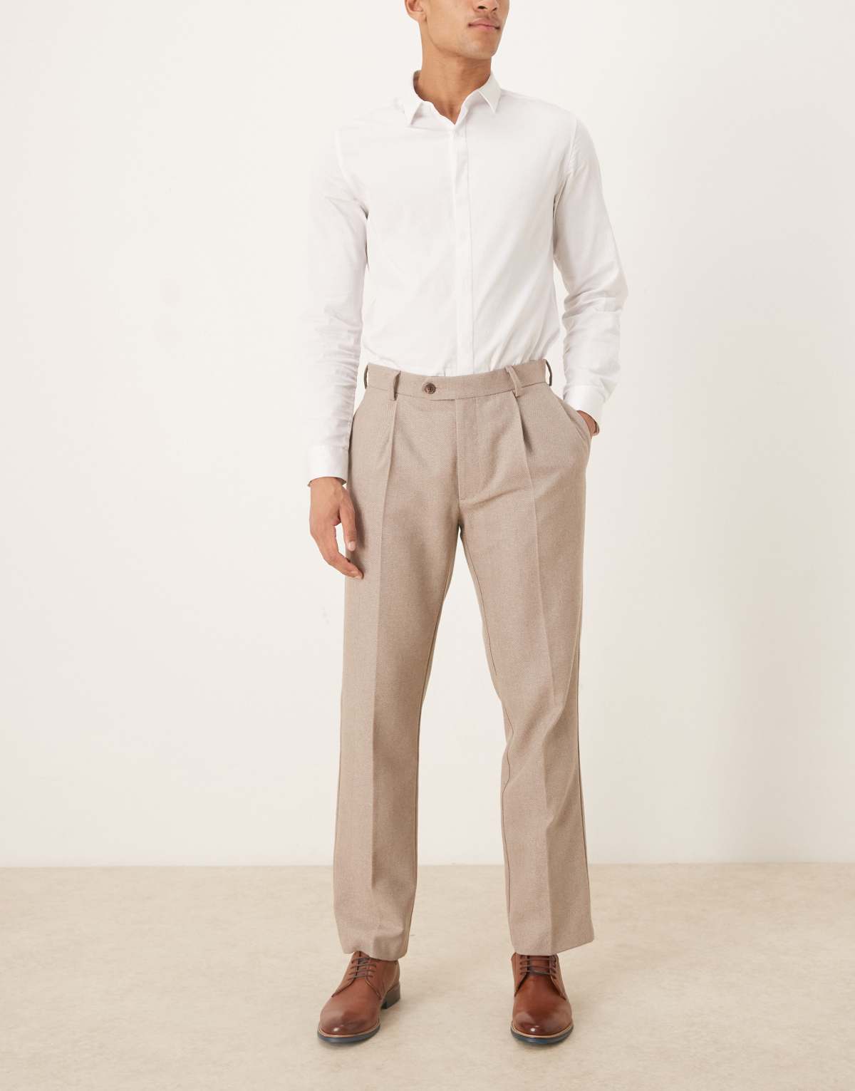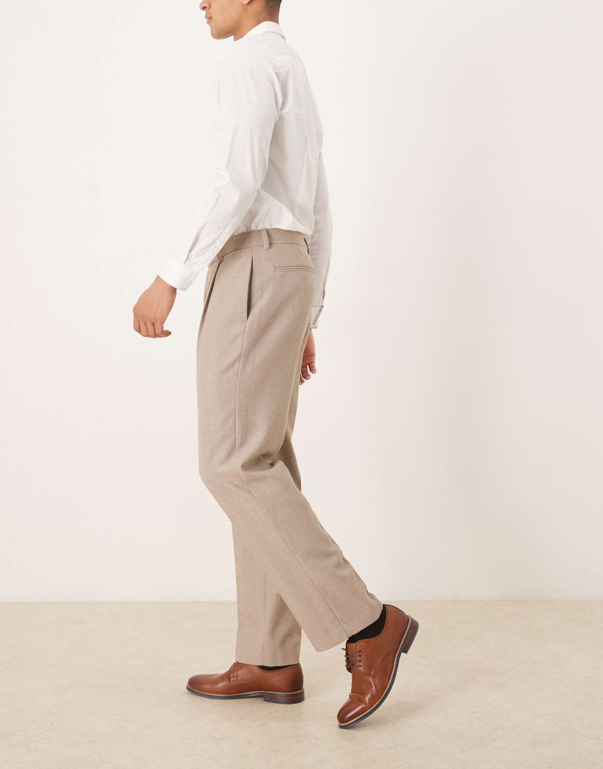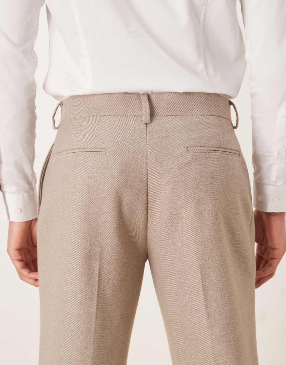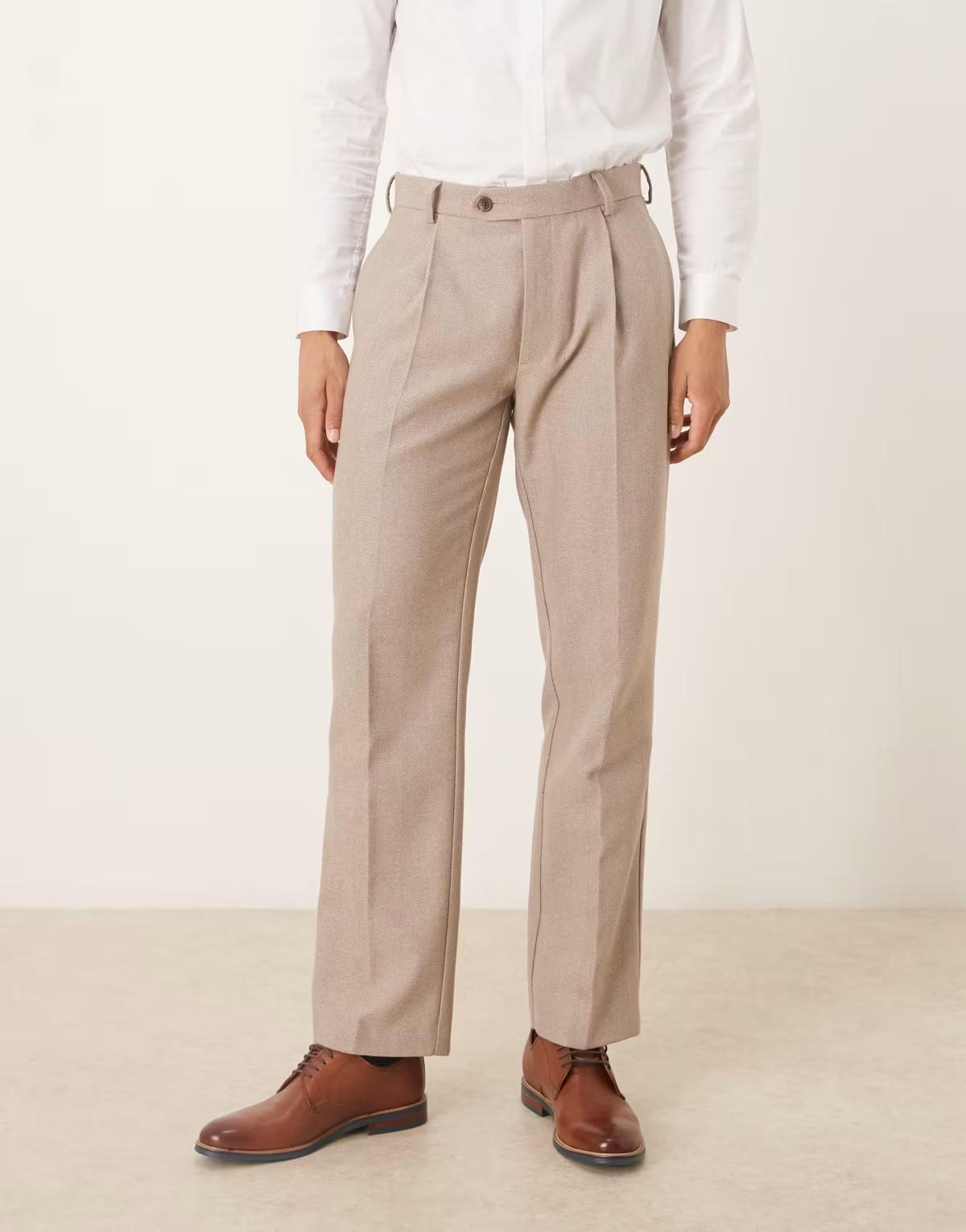 ASOS DESIGN smart pleated straight leg trousers with wool in beige herringbone