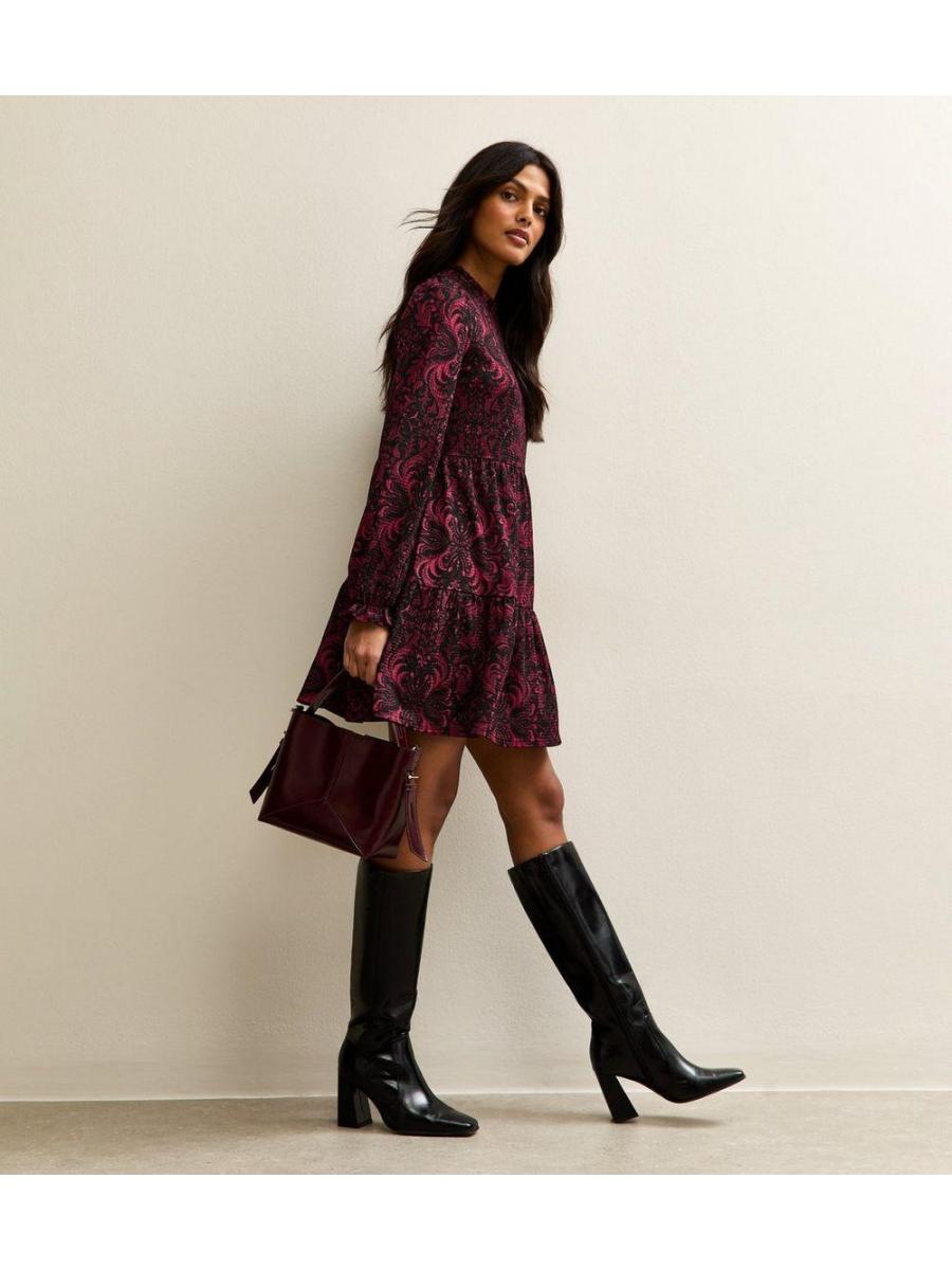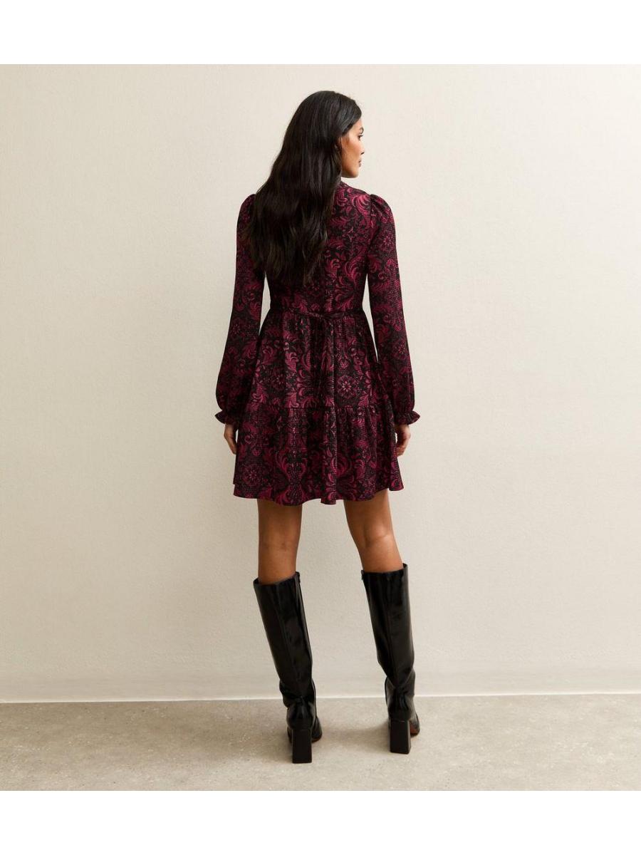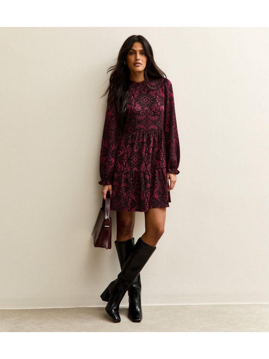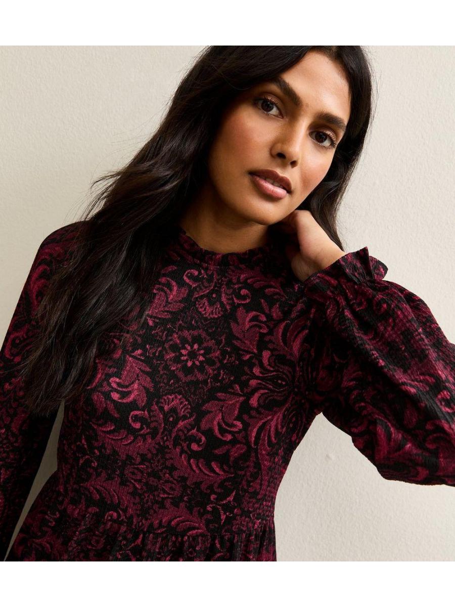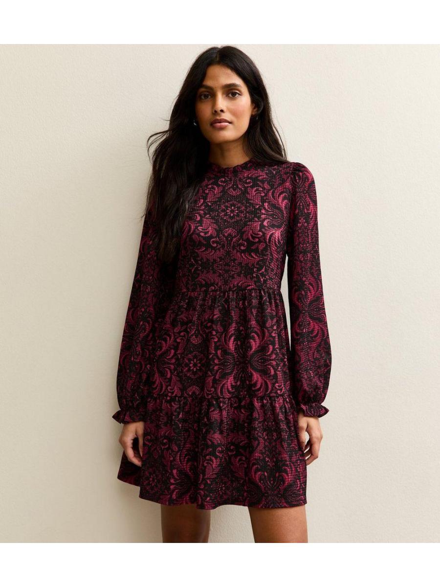Red Crinkle Texture Floral Pattern Smock Mini Dress