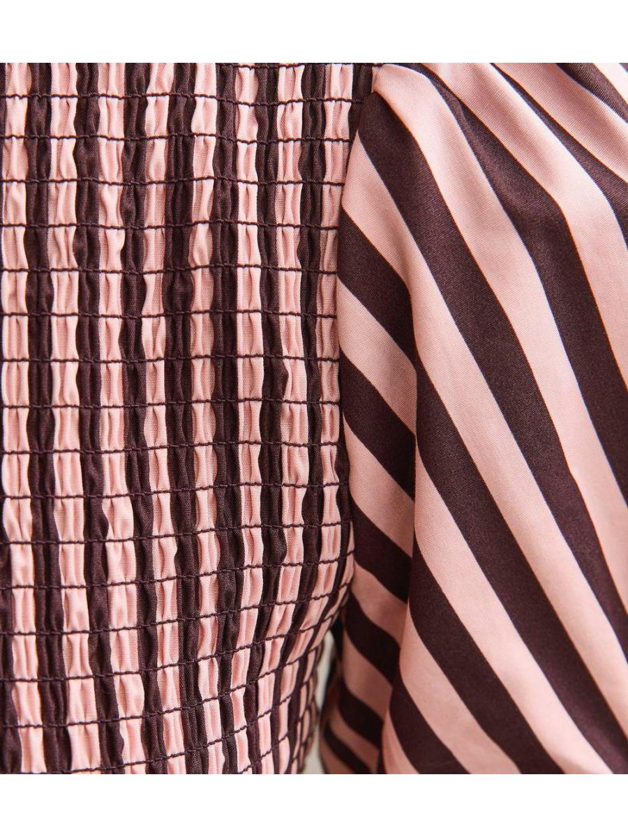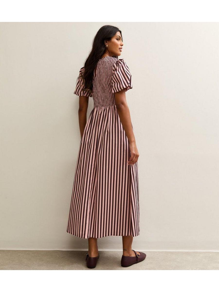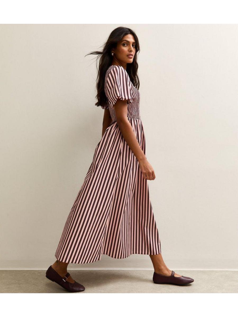 Pink Cotton Striped Shirred Midi Dress
