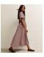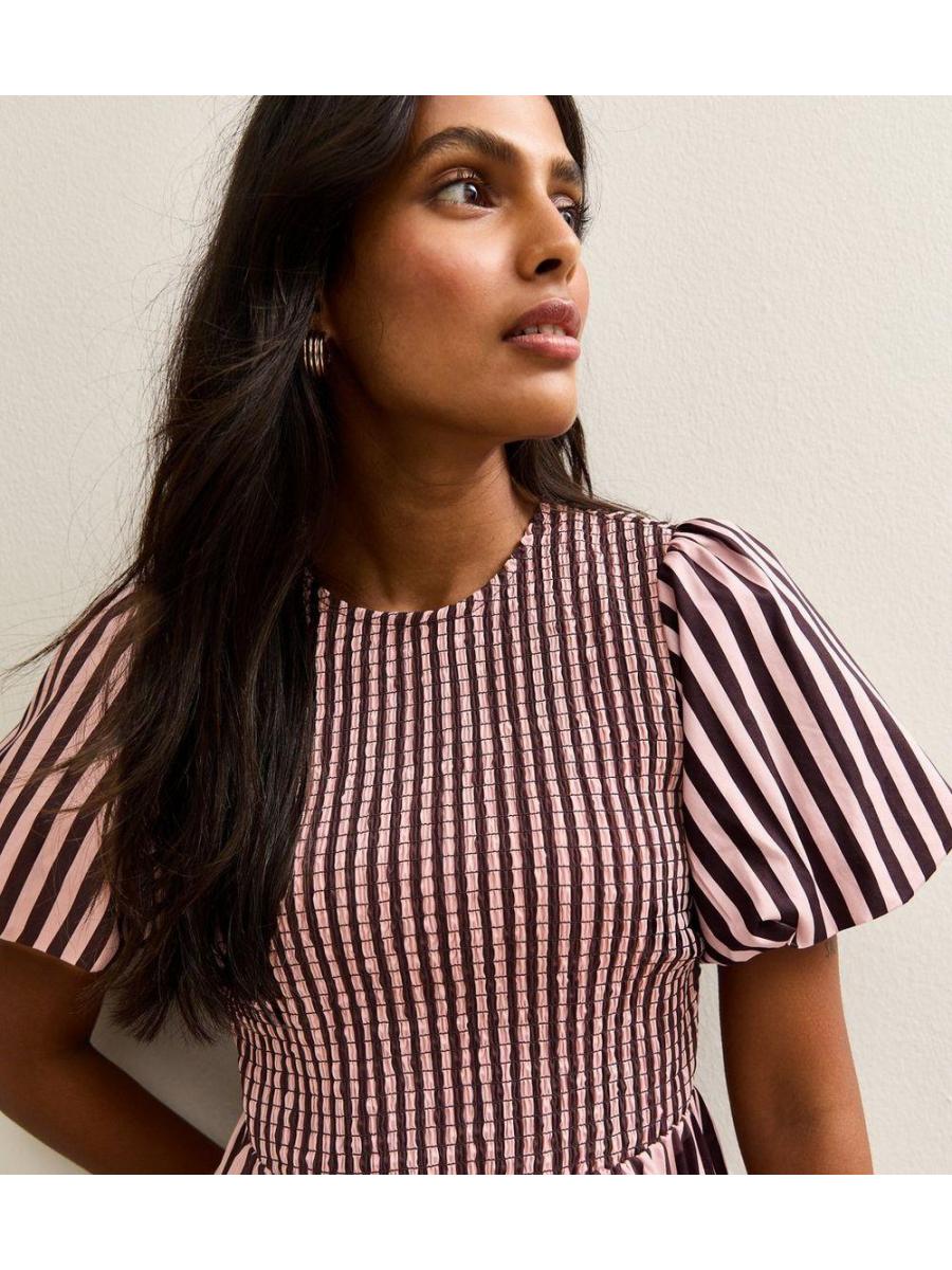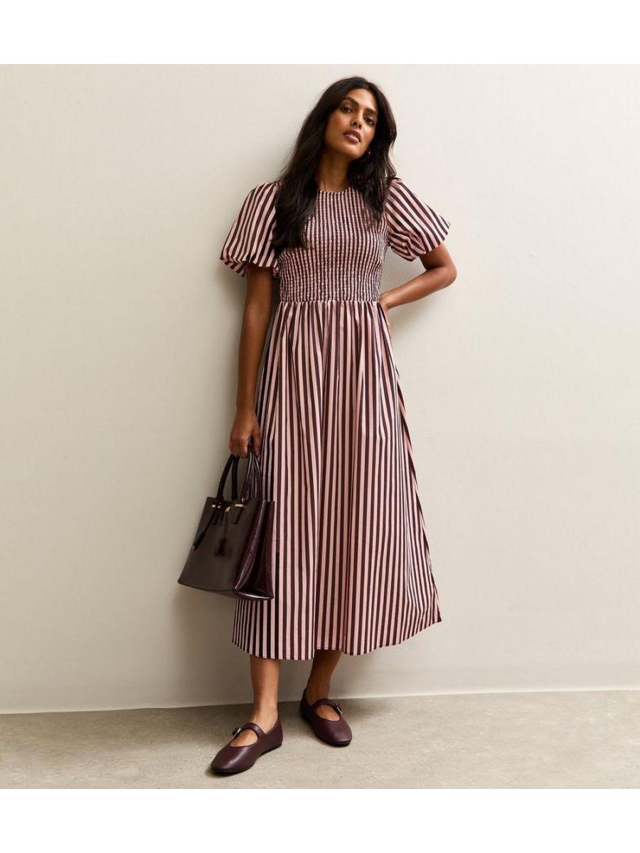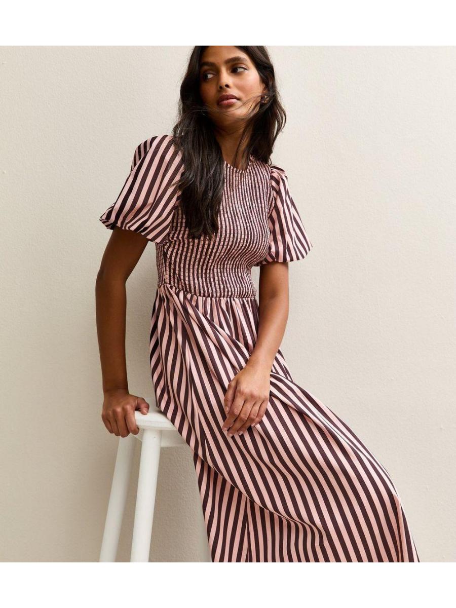 Pink Cotton Striped Shirred Midi Dress