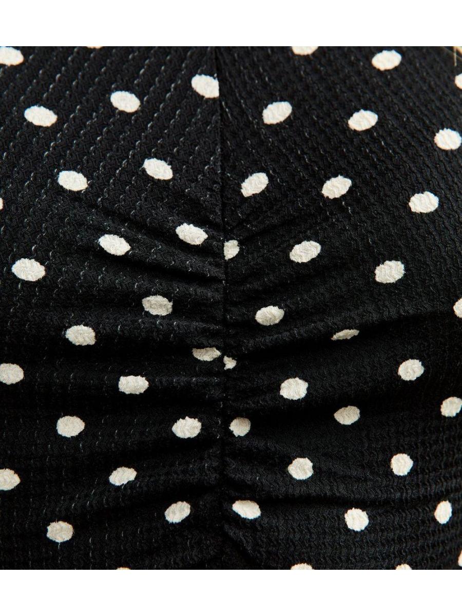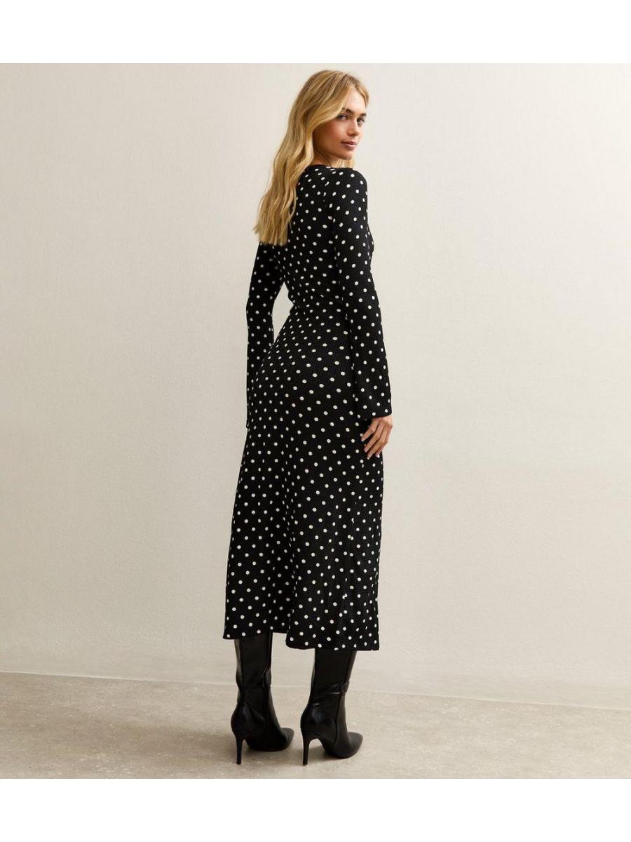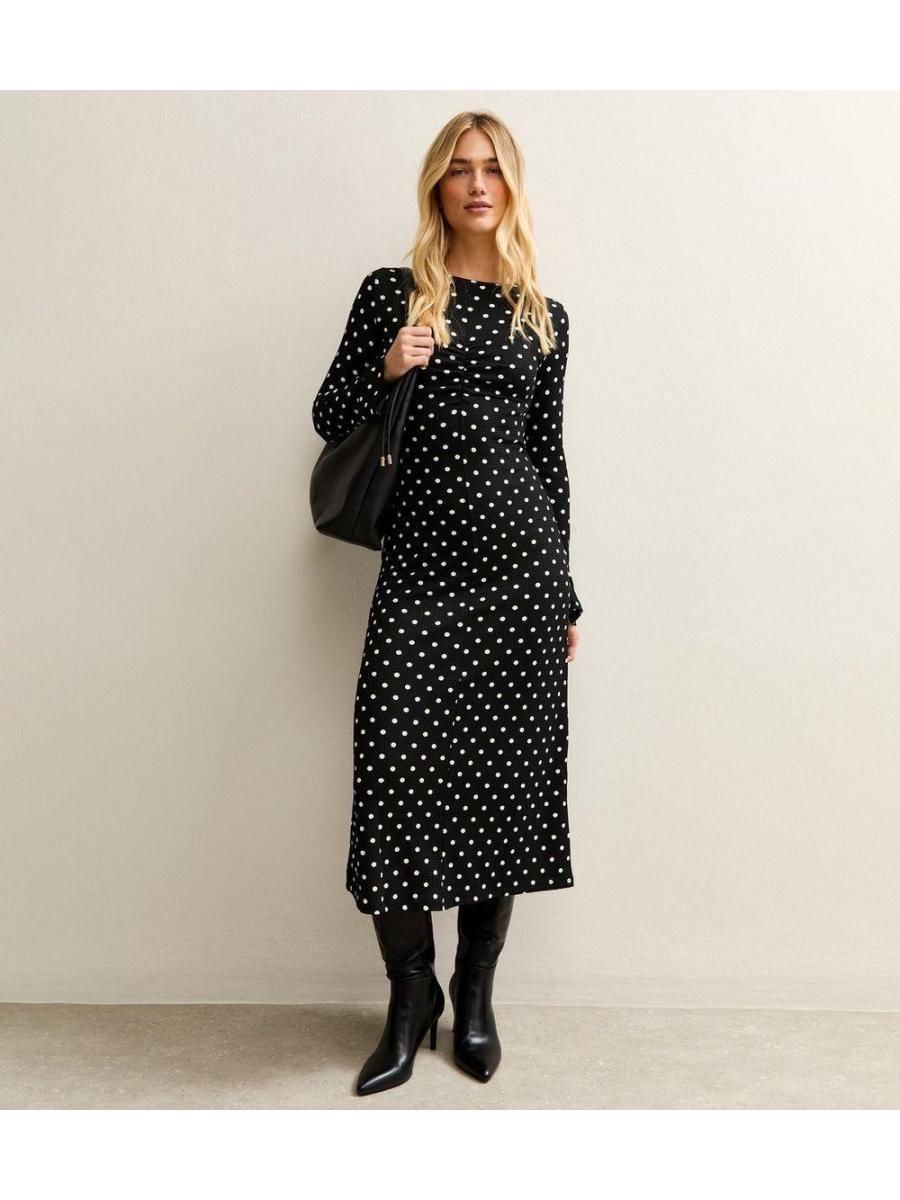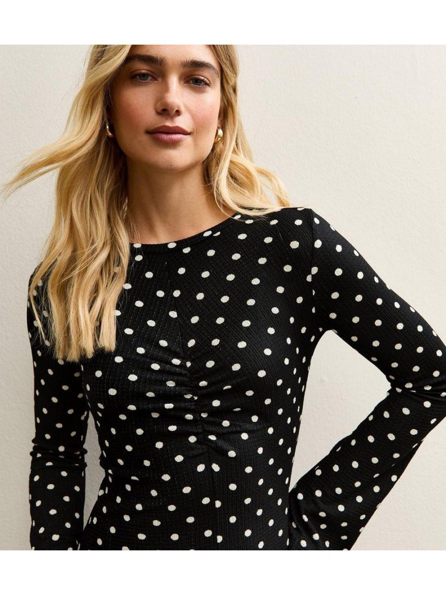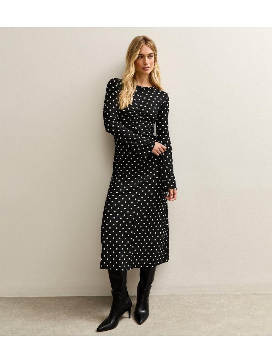 Black Polka Dot Long Sleeve Ruched Midi Dress