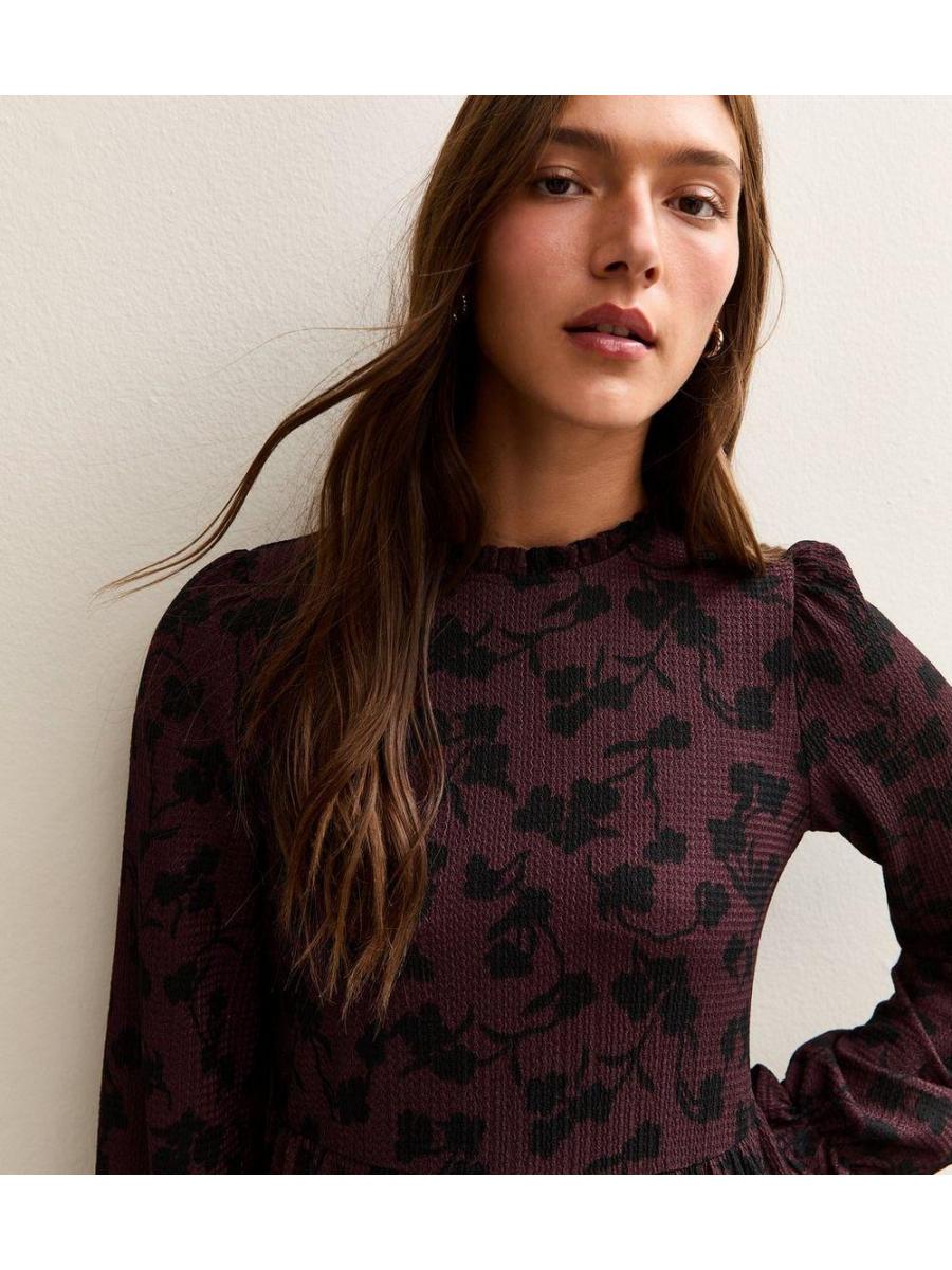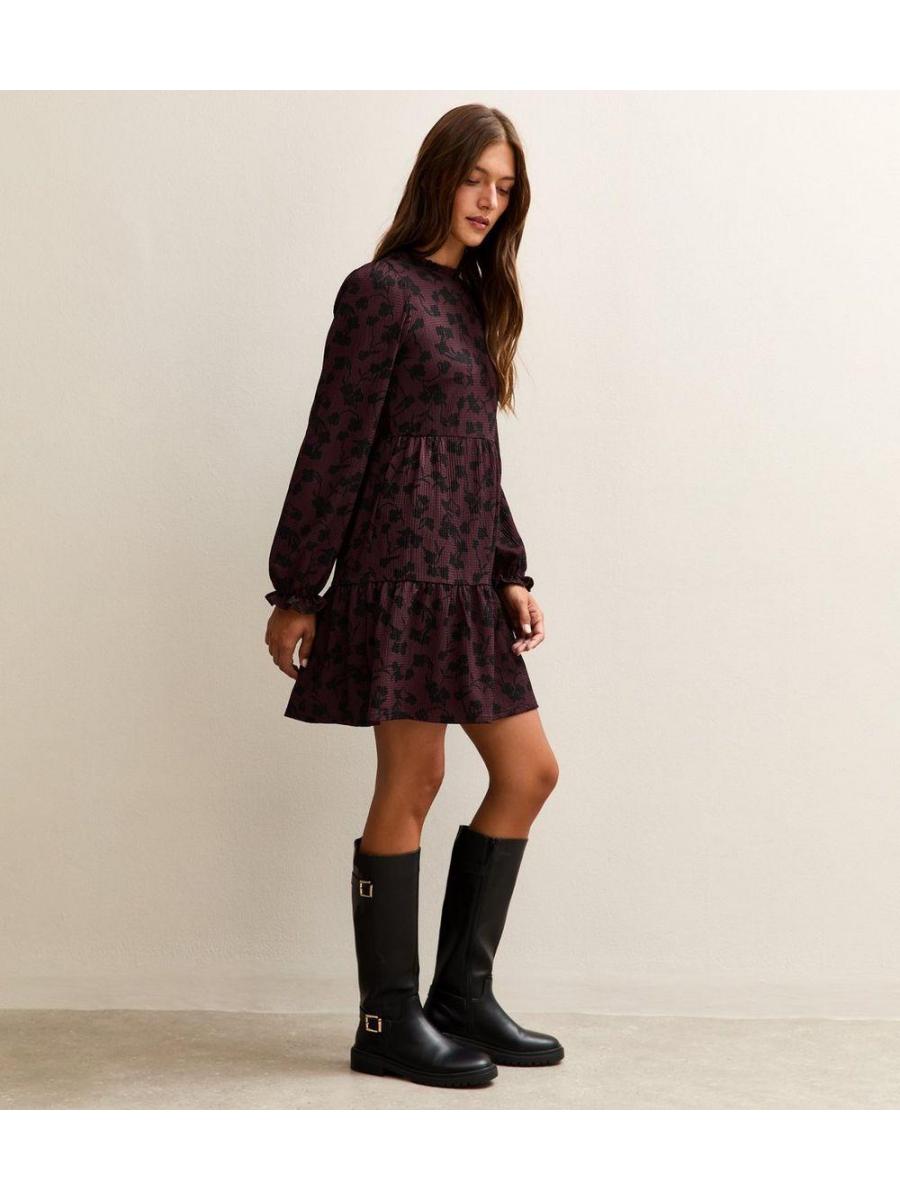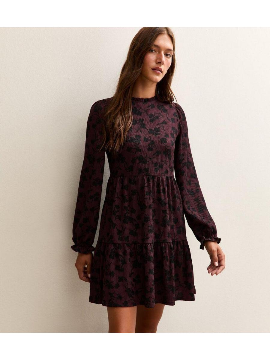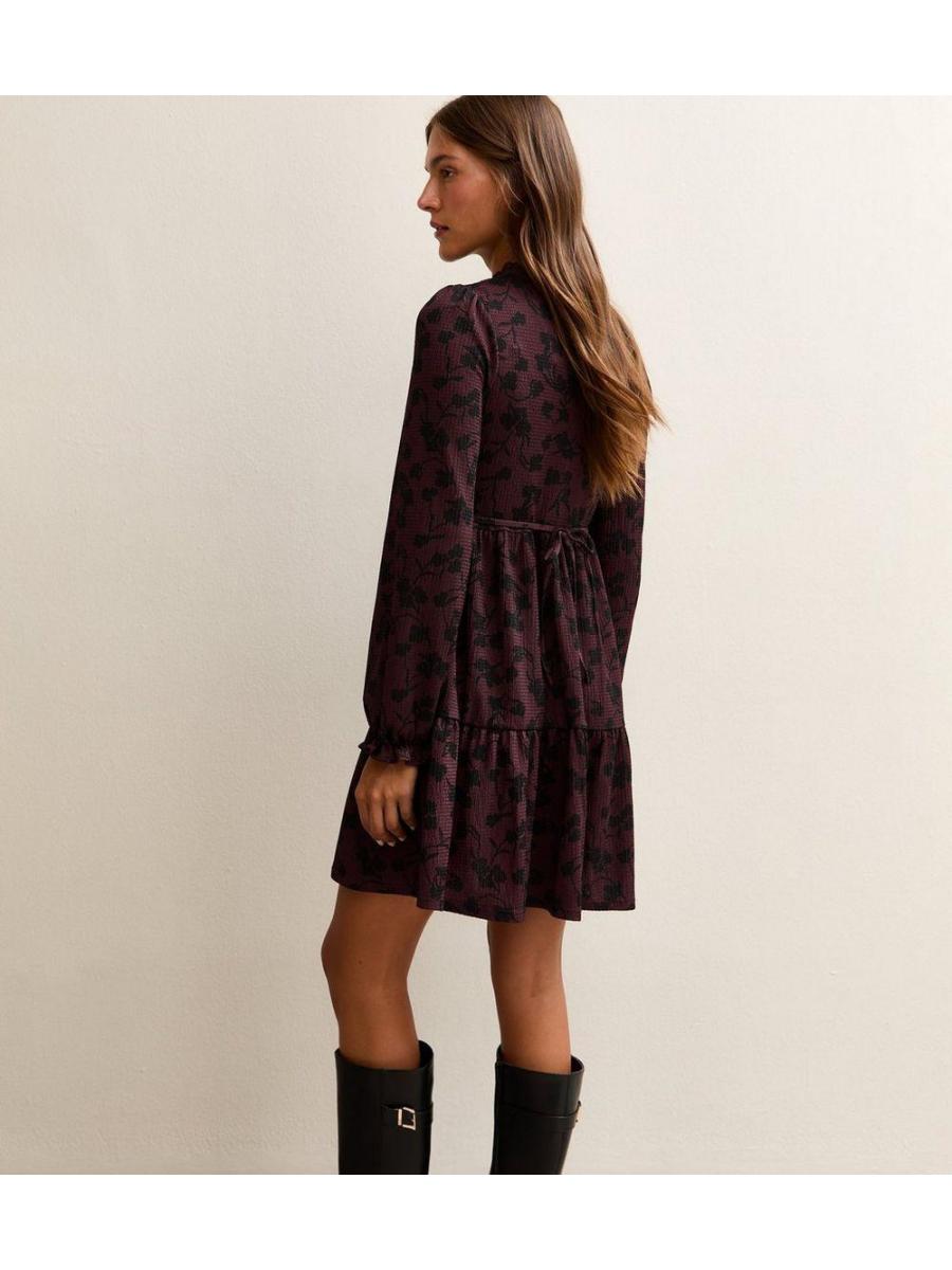 Purple Floral Print Crinkle Texture Smock Dress