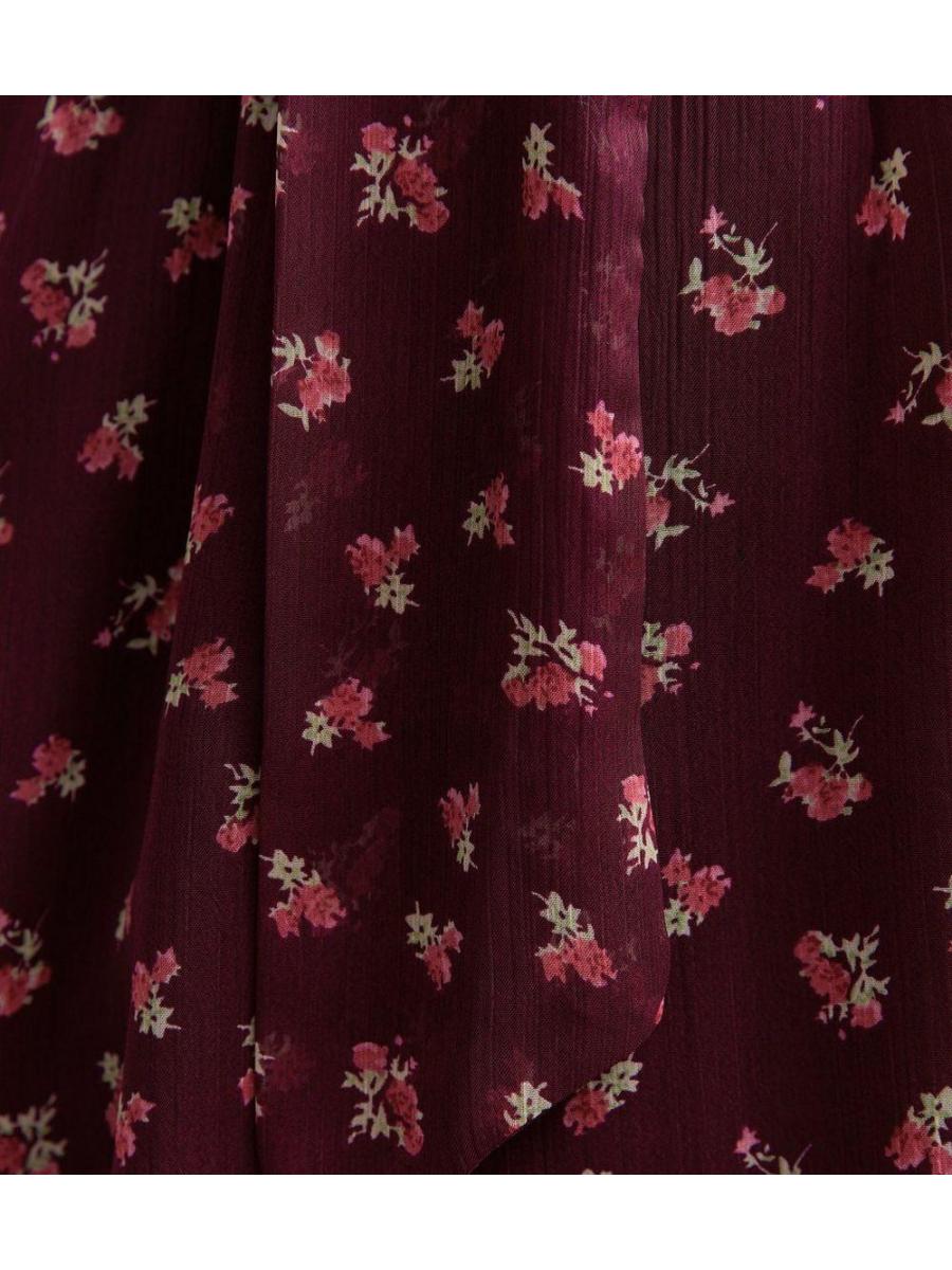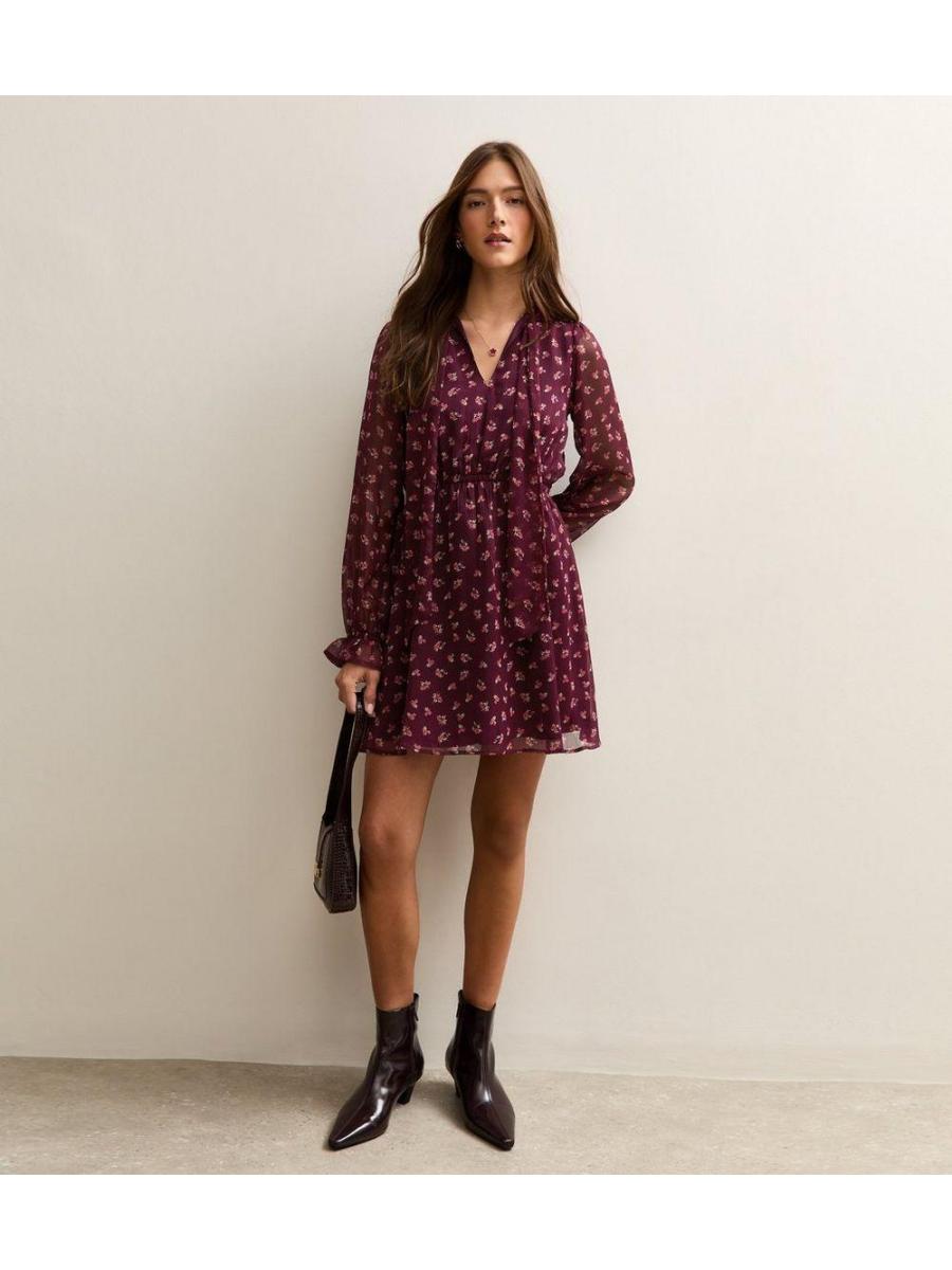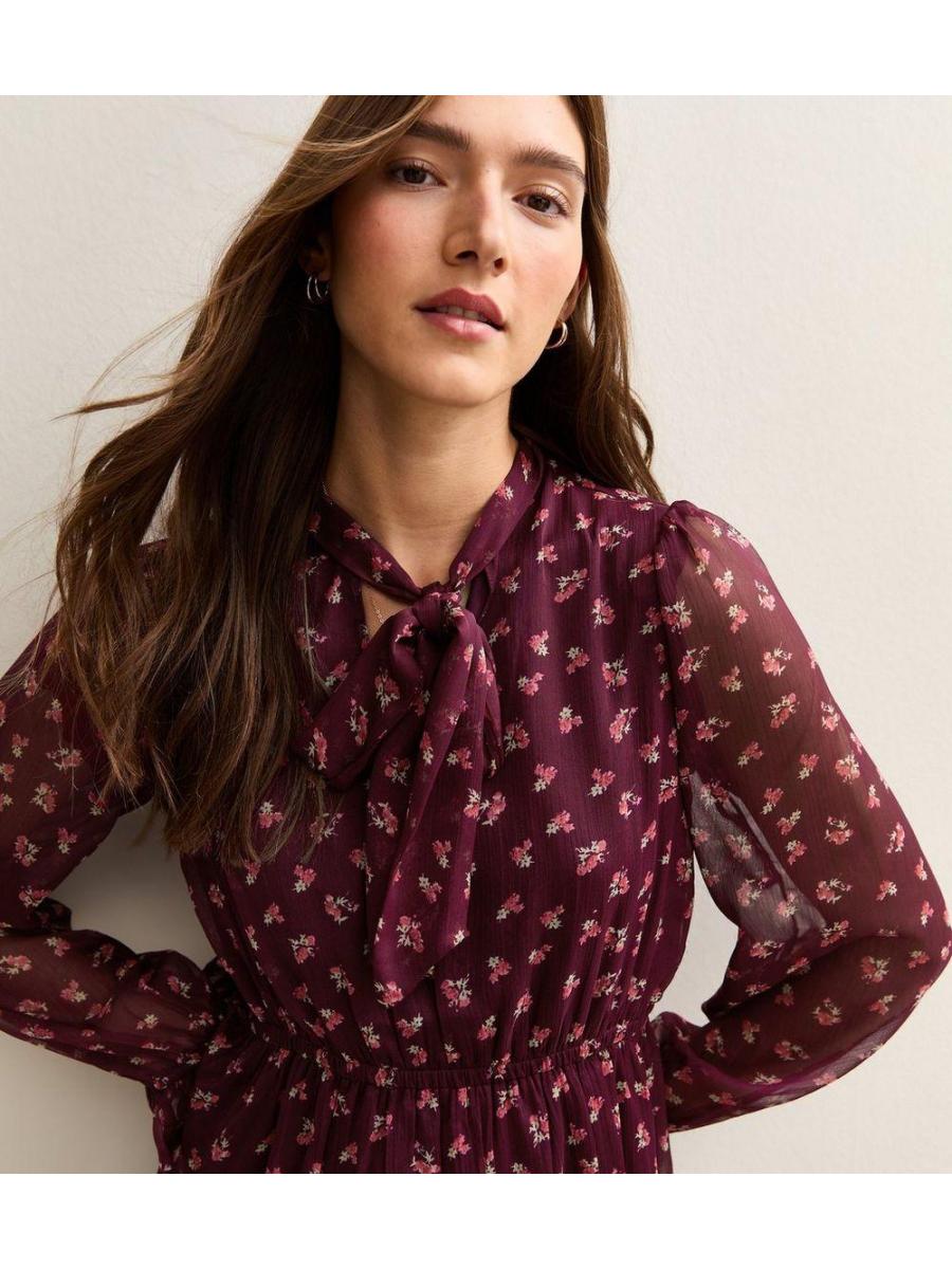 Red Rose Print Chiffon Pussybow Neck Mini Dress