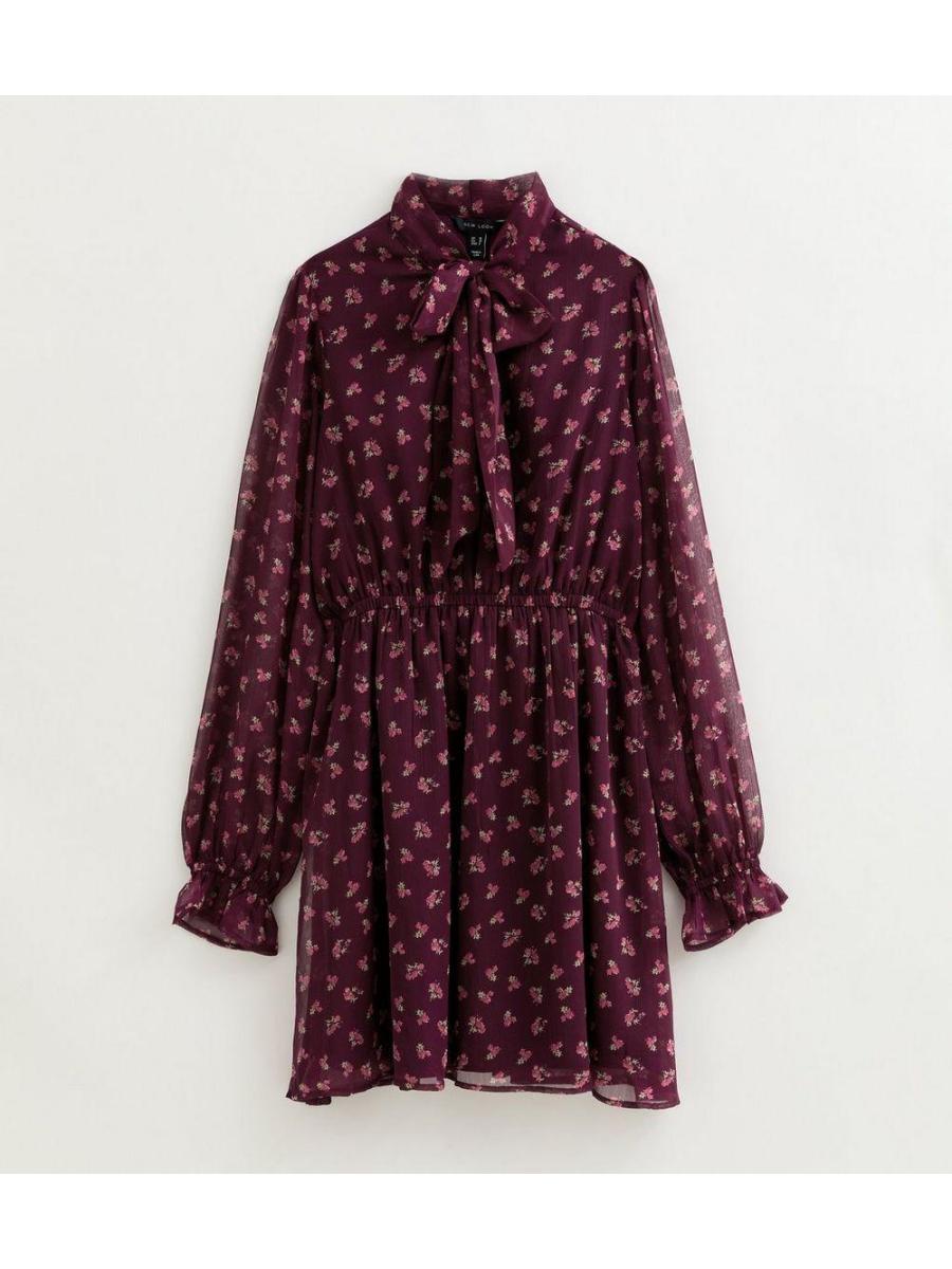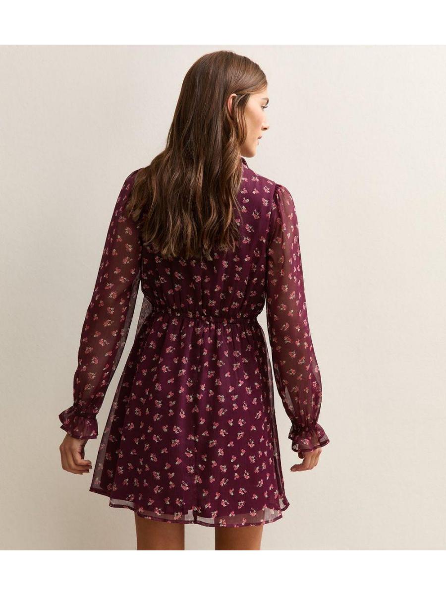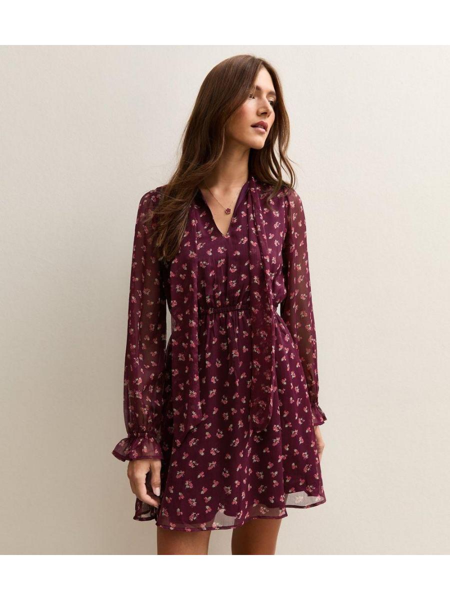 Red Rose Print Chiffon Pussybow Neck Mini Dress