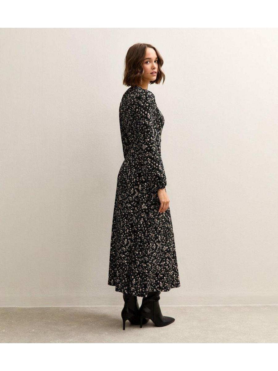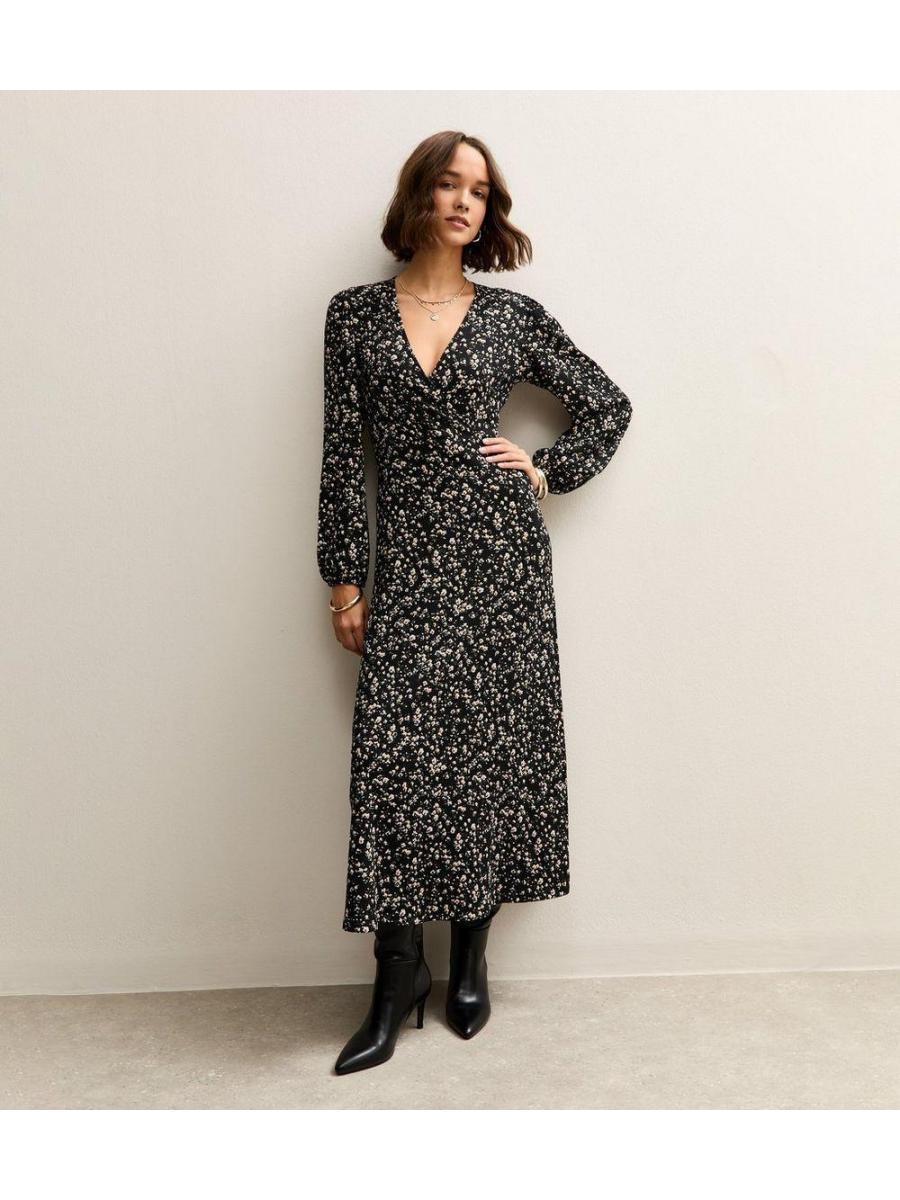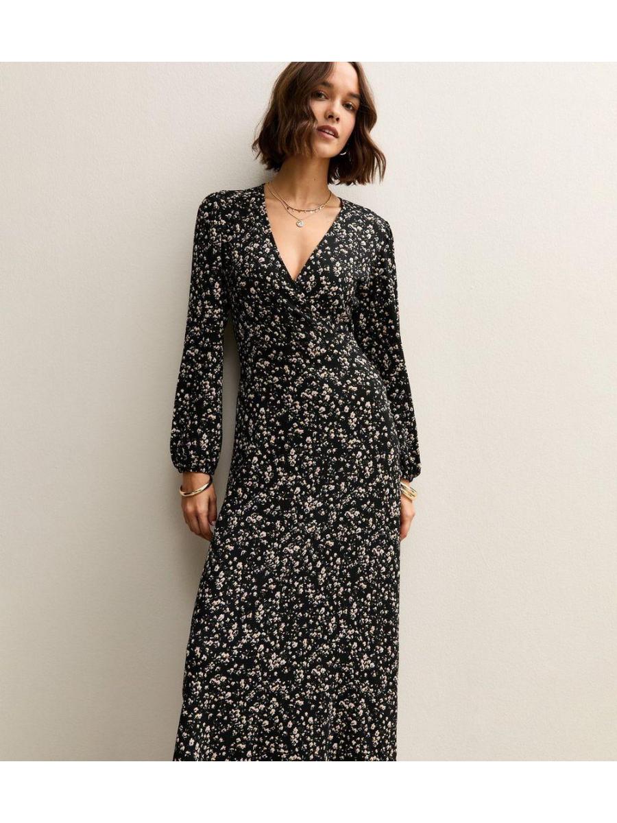 Black Floral Wrap Midi Dress