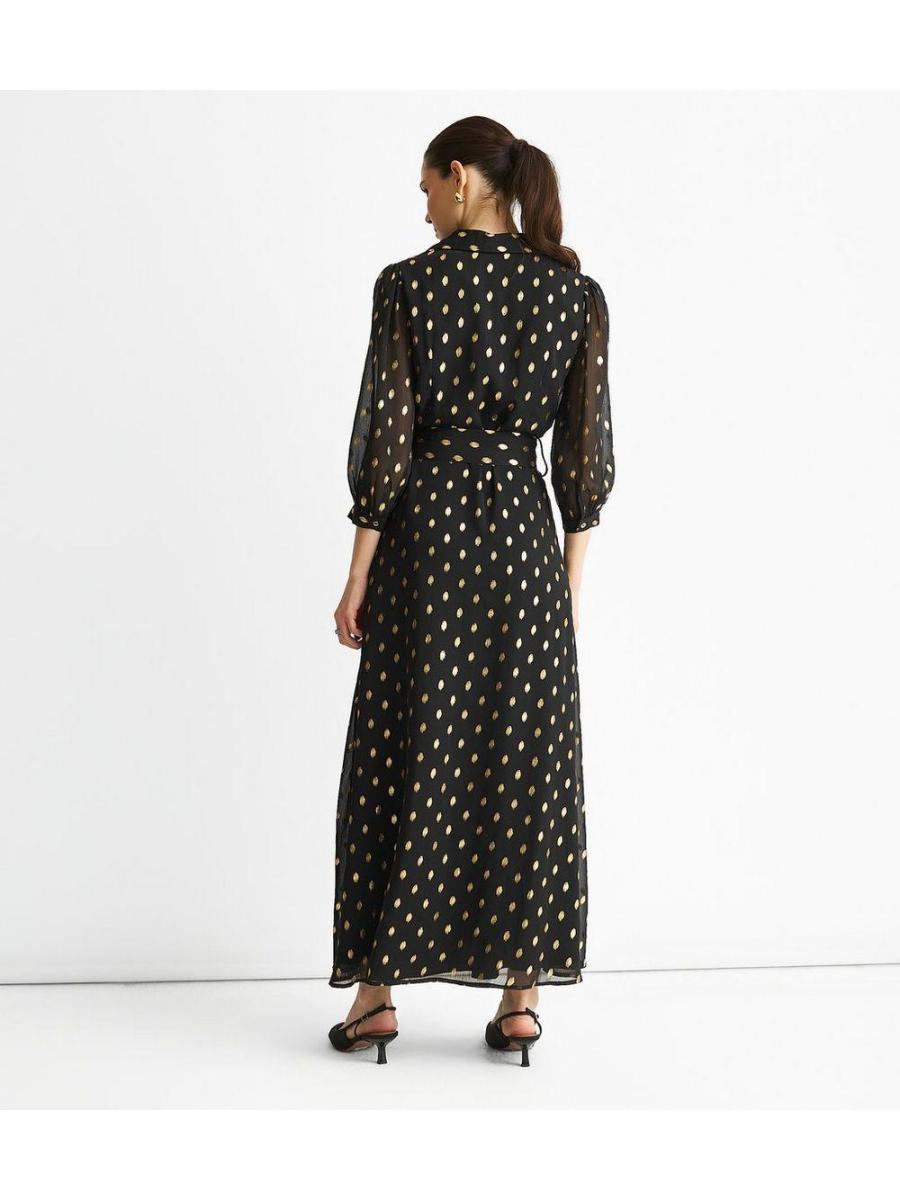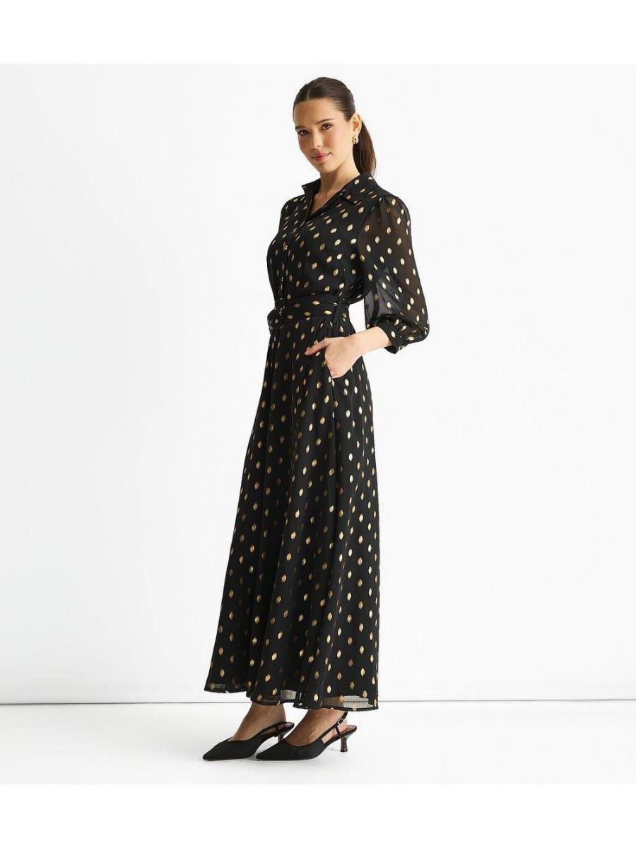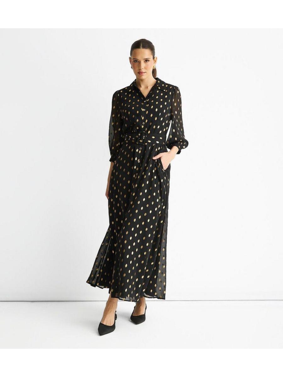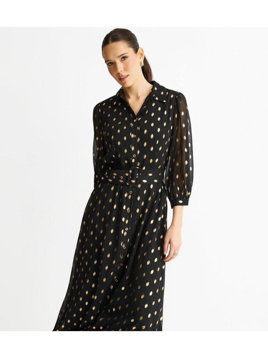 Gini London Black Chiffon Foil Belt Maxi Shirt Dress