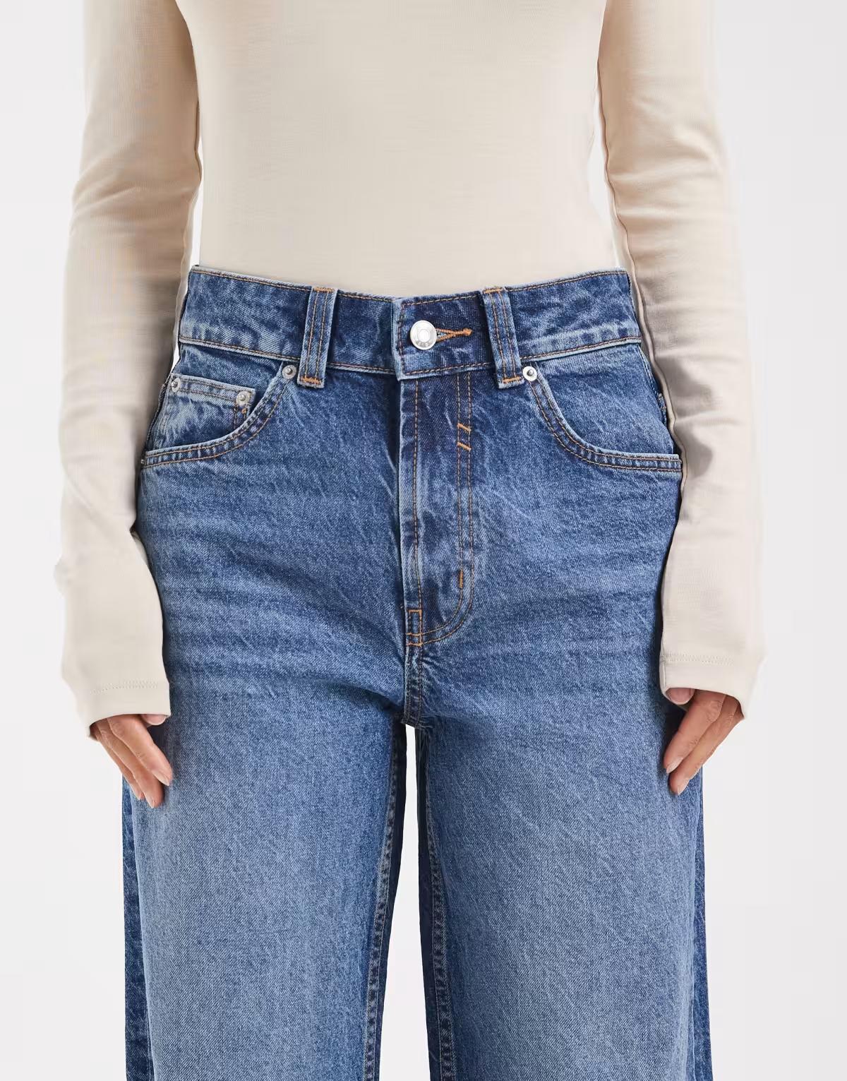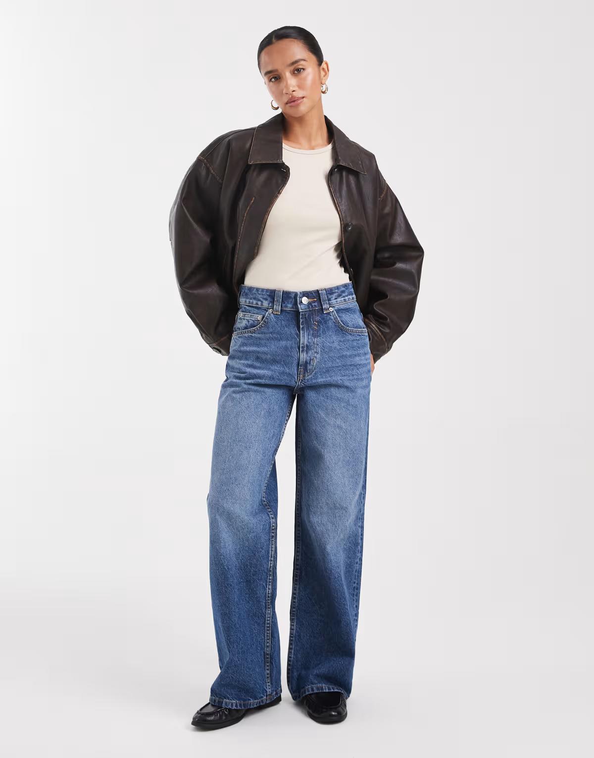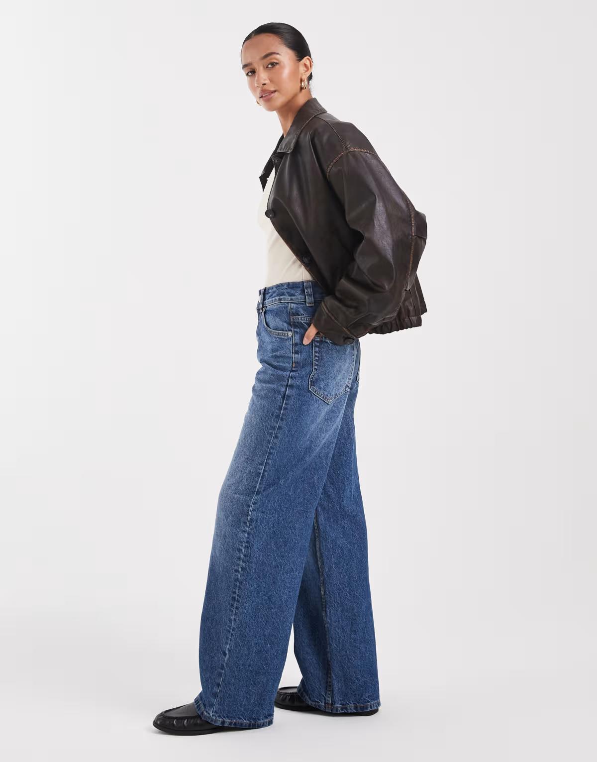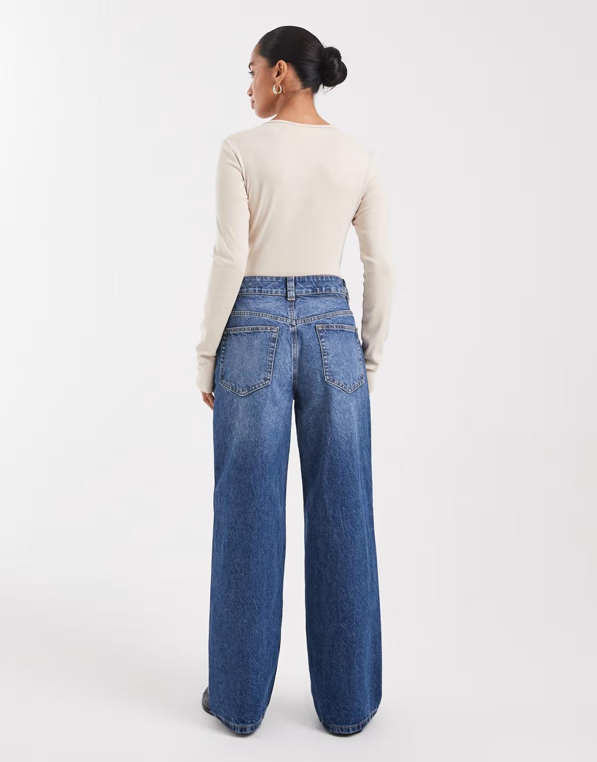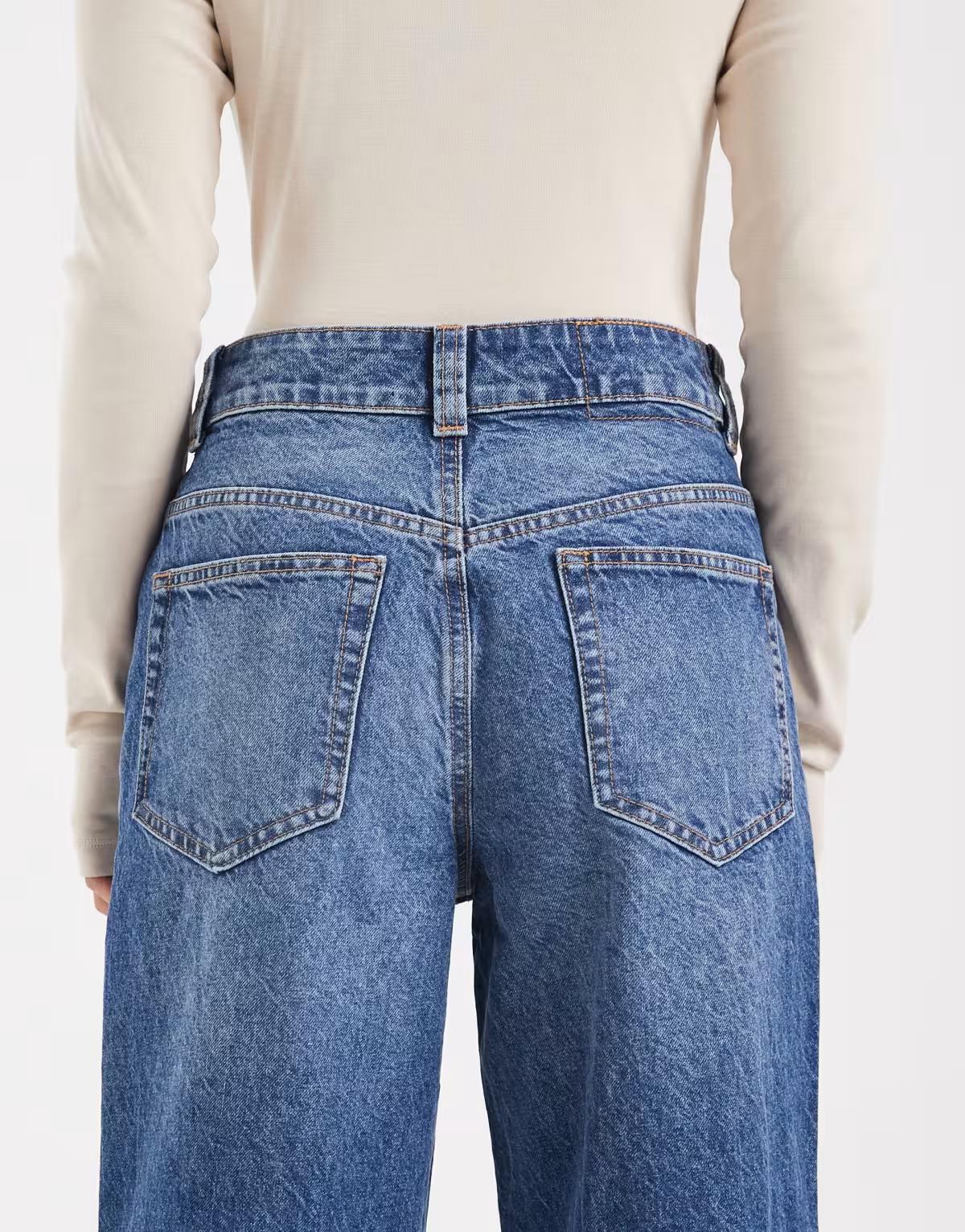 This product, ASOS DESIGN Petite wide leg dad jean in mid blue Circular Design Collection, meets ASOS’ Silver Standard