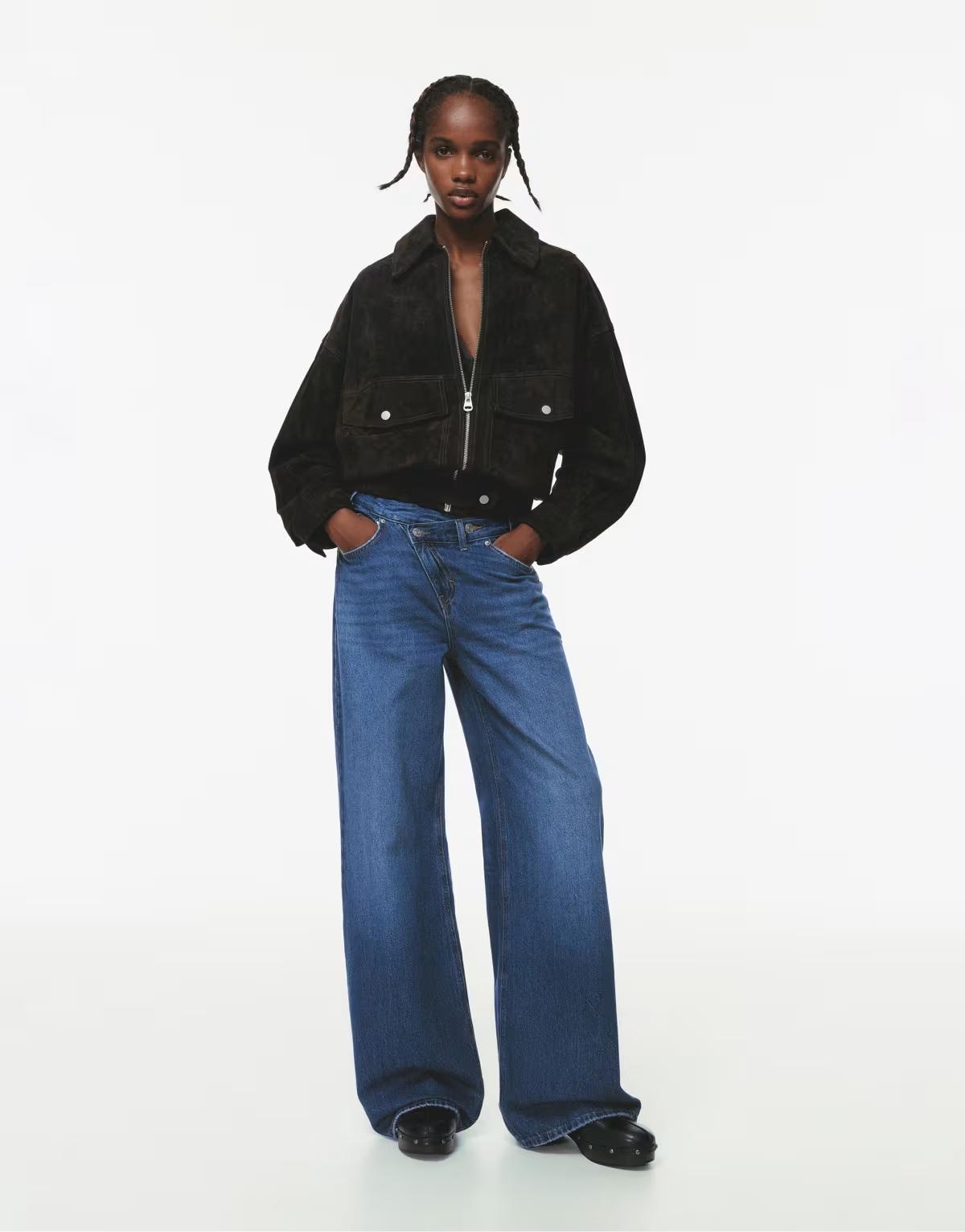 Pull&Bear Wide leg jeans with crossover waistband in medium blue