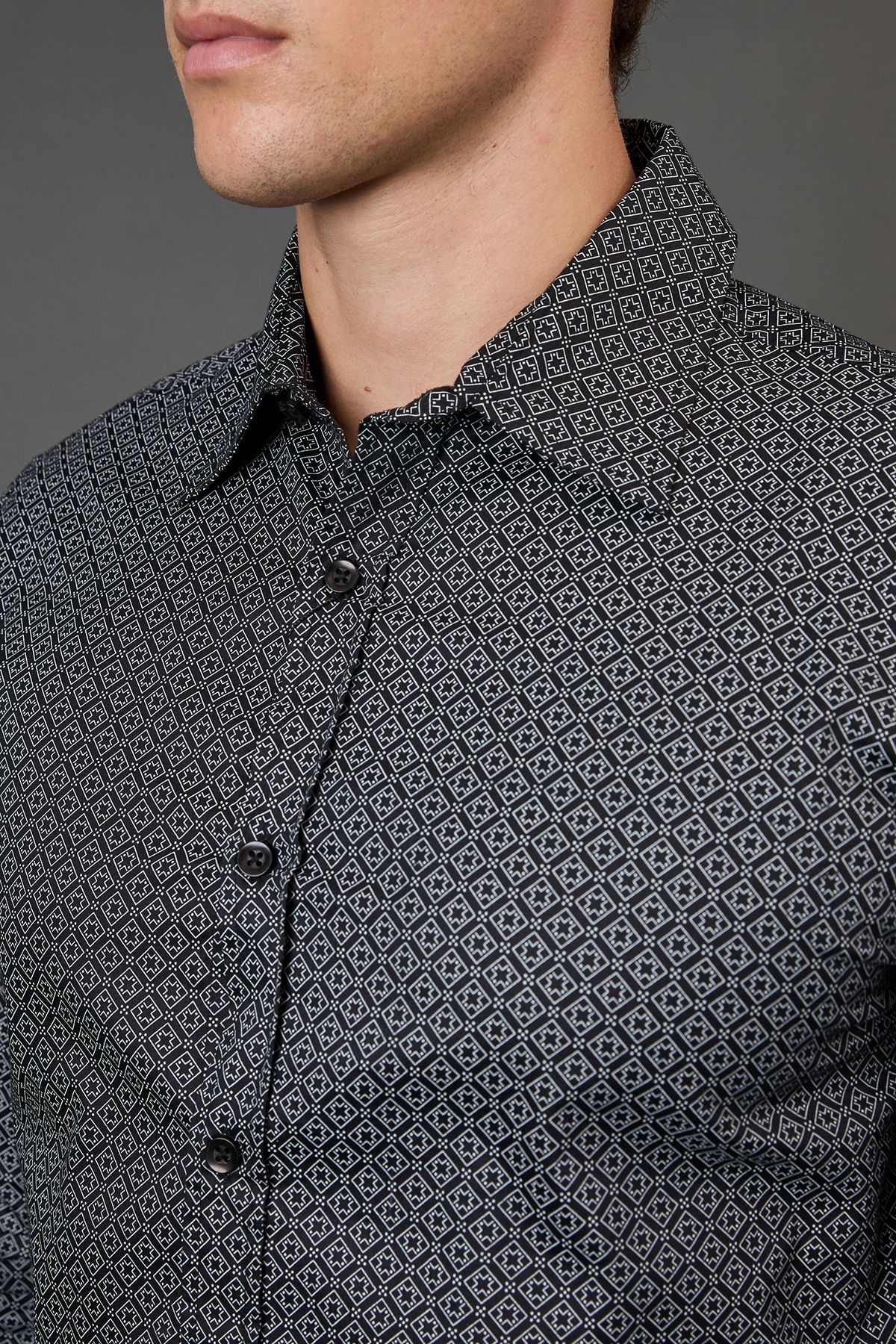 \u003cdiv\u003e\n \u003cul\u003e\n \u003cli\u003eSlim fit design with a tailored silhouette for a contemporary look\u003c/li\u003e\n \u003cli\u003eBold geometric print pattern adds distinctive character to your outfit\u003c/li\u003e\n \u003cli\u003eClassic collar with structured points for a refined appearance\u003c/li\u003e\n \u003cli\u003eLong sleeves with button cuffs for versatile styling options\u003c/li\u003e\n \u003cli\u003eWoven fabric construction offers comfortable structure and durability\u003c/li\u003e\n \u003c/ul\u003e\n \u003cp\u003eThis Burton slim fit shirt combines classic sophistication with modern style, perfect for elevating your night-out wardrobe. The distinctive geometric print creates visual interest while maintaining a refined aesthetic that transitions seamlessly from after-work drinks to weekend socialising. Style it as shown with smart black trousers and polished shoes for an evening at the pub or club, or pair with dark jeans for a more casual approach to nightlife. The tailored silhouette flatters your frame without restricting movement, ensuring you look sharp whilst remaining comfortable throughout the evening. This versatile piece works brilliantly layered under a blazer for more upscale venues or worn alone with sleeves rolled up for a more relaxed setting. A staple for the discerning gentleman who appreciates timeless style with a contemporary twist.\u003c/p\u003e\n\u003c/div\u003e