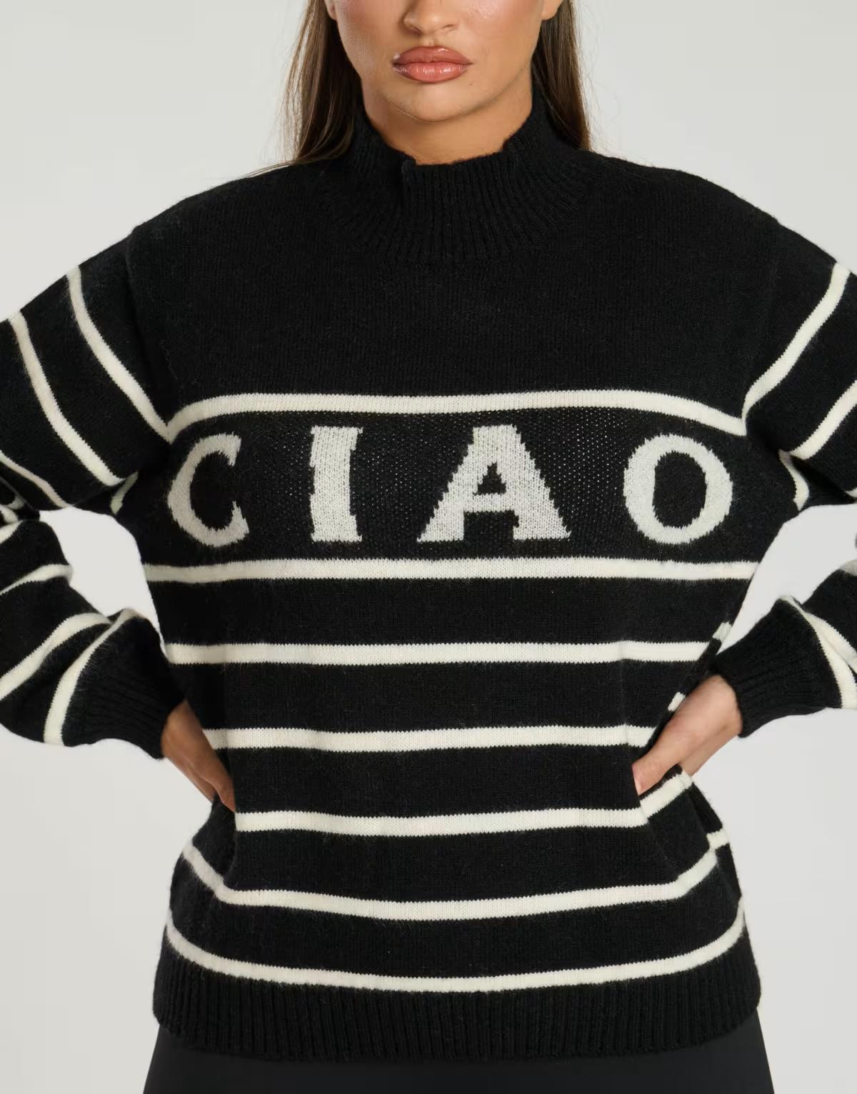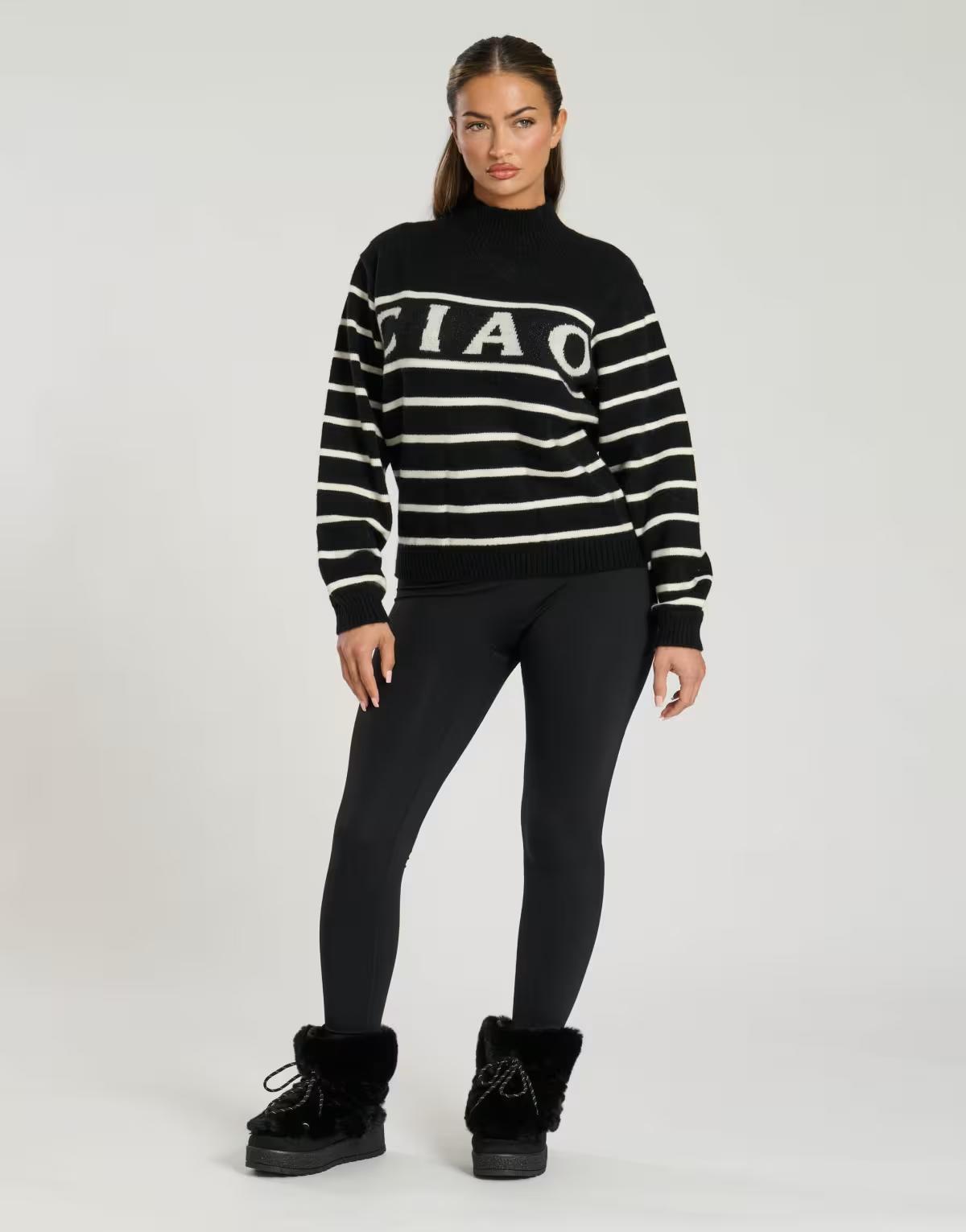 South Beach Funnel neck slogan striped knit jumper in black