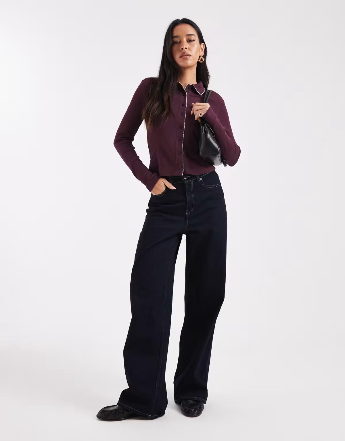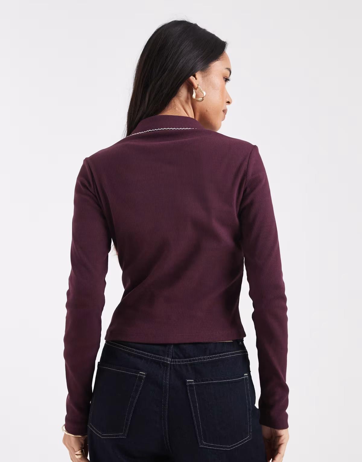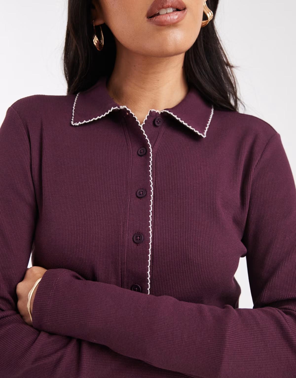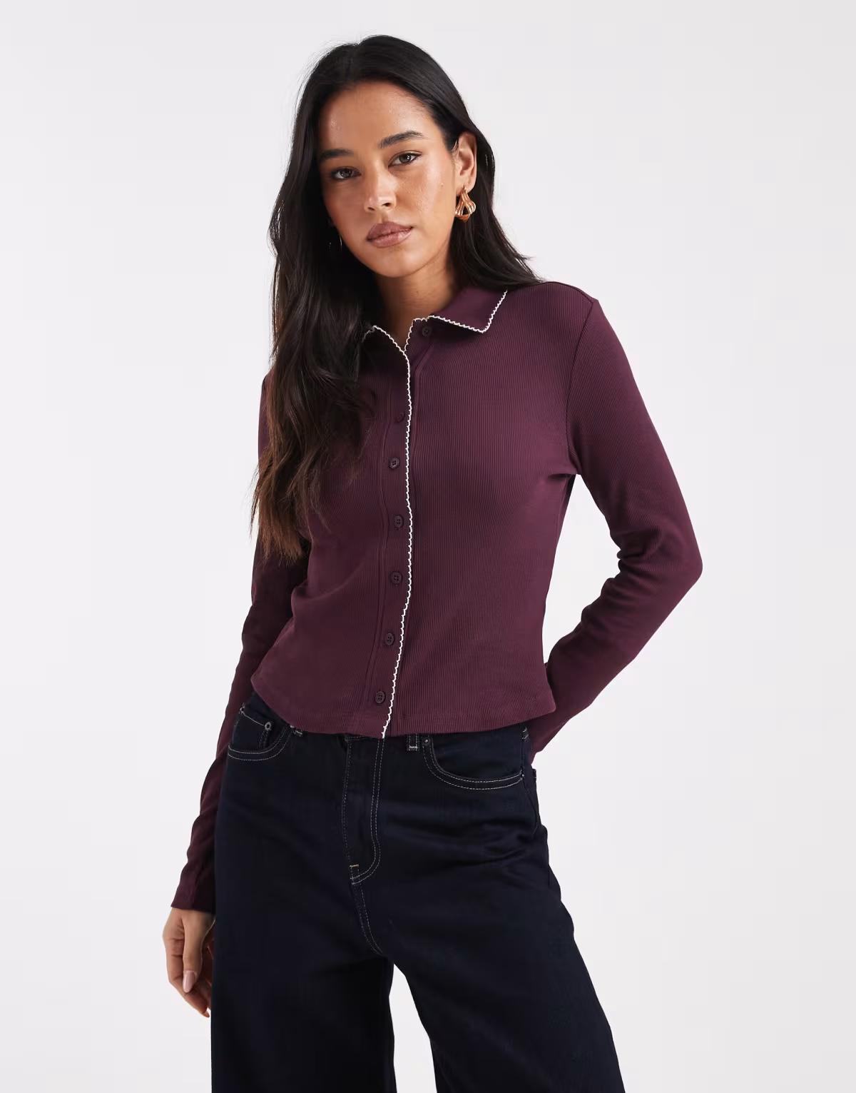 Miss Selfridge button though rib shirt with blanket stitch detail in plum