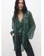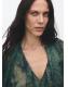 Confeccionada en tejido semitransparente, esta prenda presenta un diseño recto con estampado Paisley. El cuello pico se adorna con un fular y volantes, mientras que las mangas largas son abullonadas