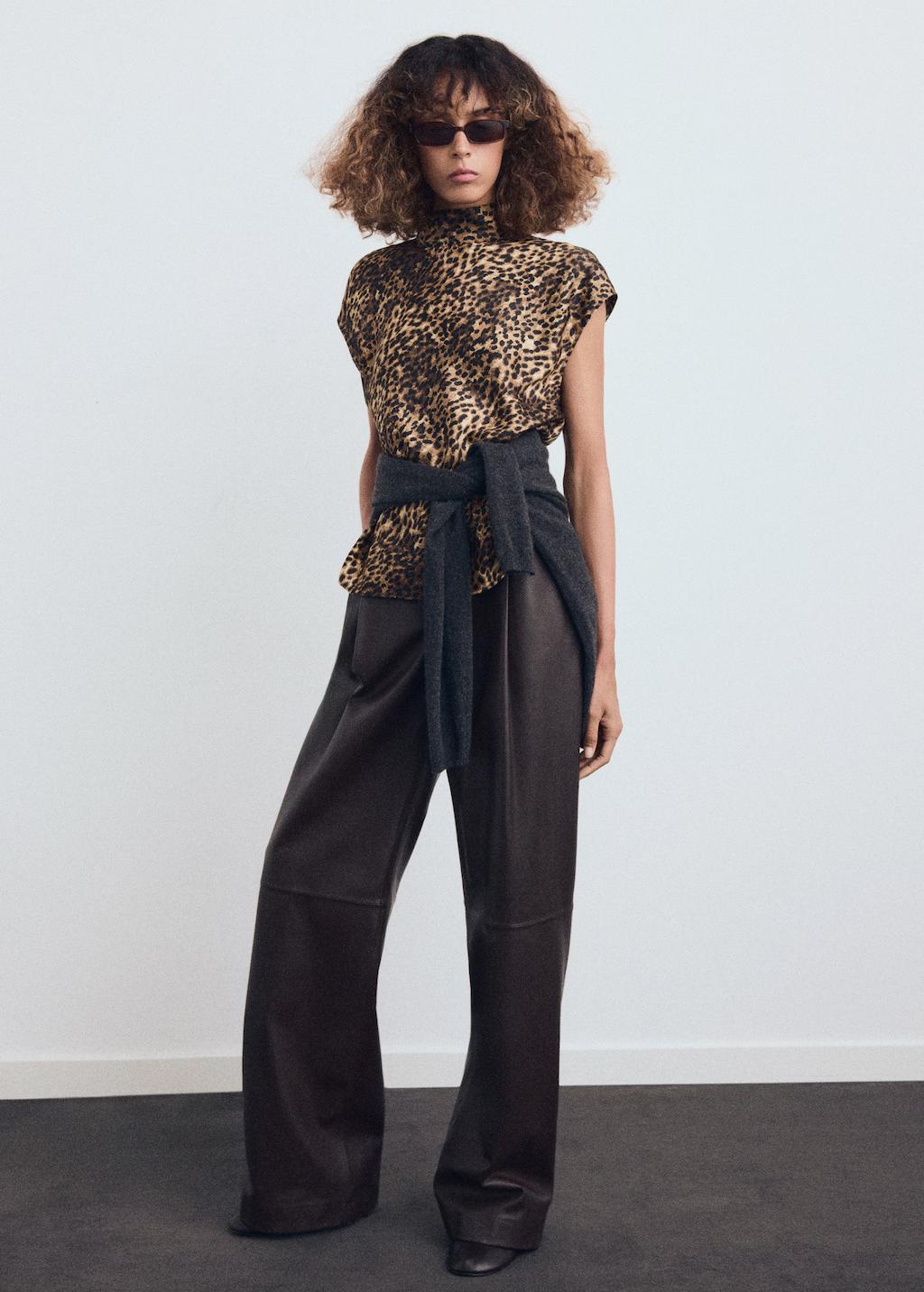 Confeccionada en tejido satinado, esta prenda presenta un diseño recto con estampado de leopardo, cuello alto y manga corta. Se cierra mediante botones en la parte posterior. Cuenta con una falda a conjunto
