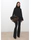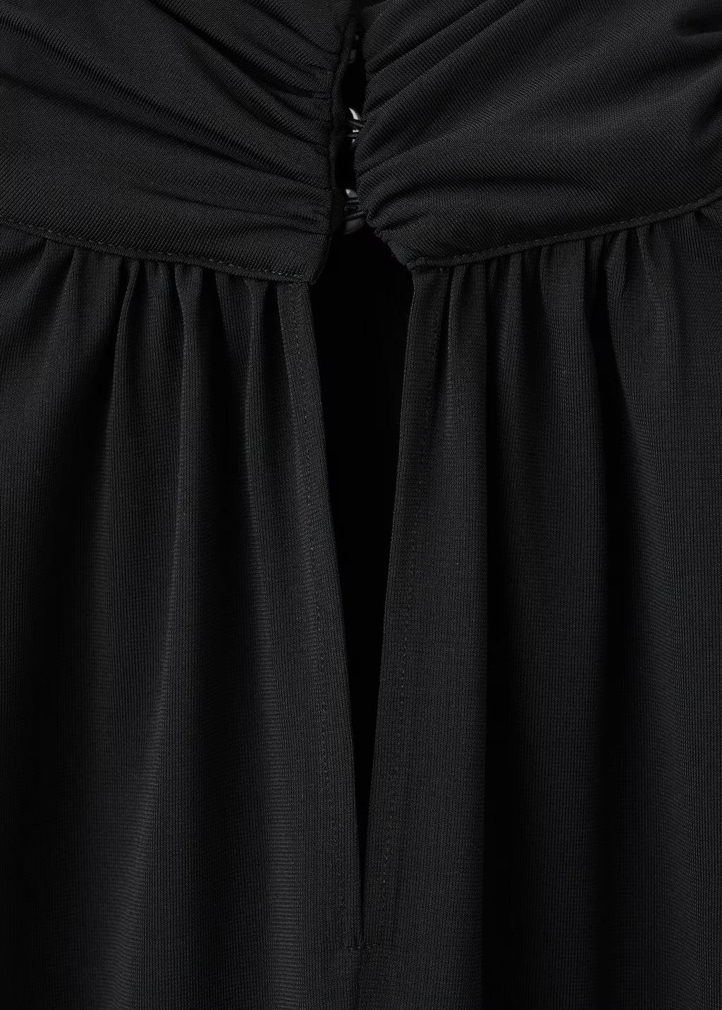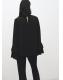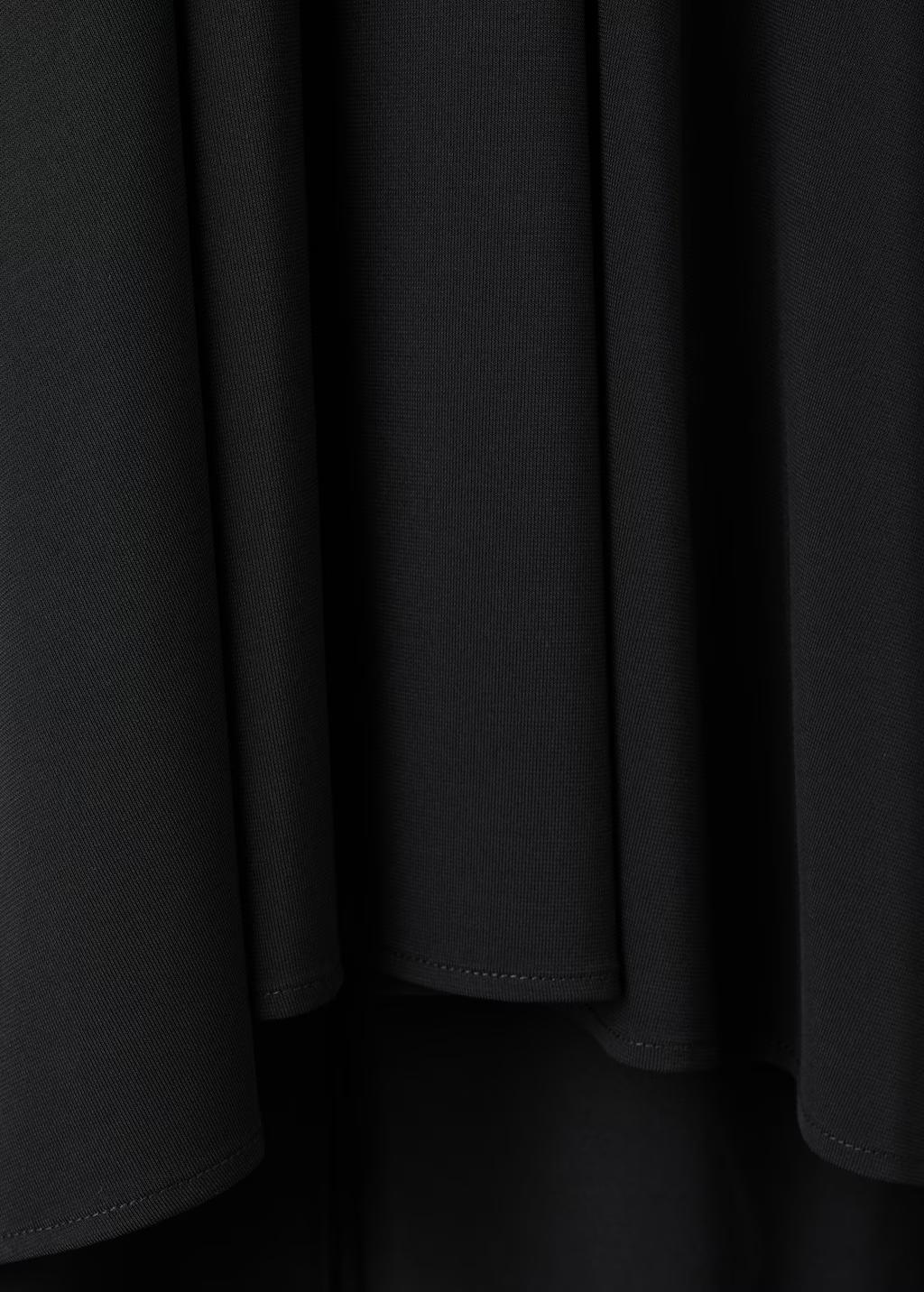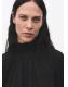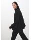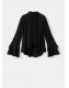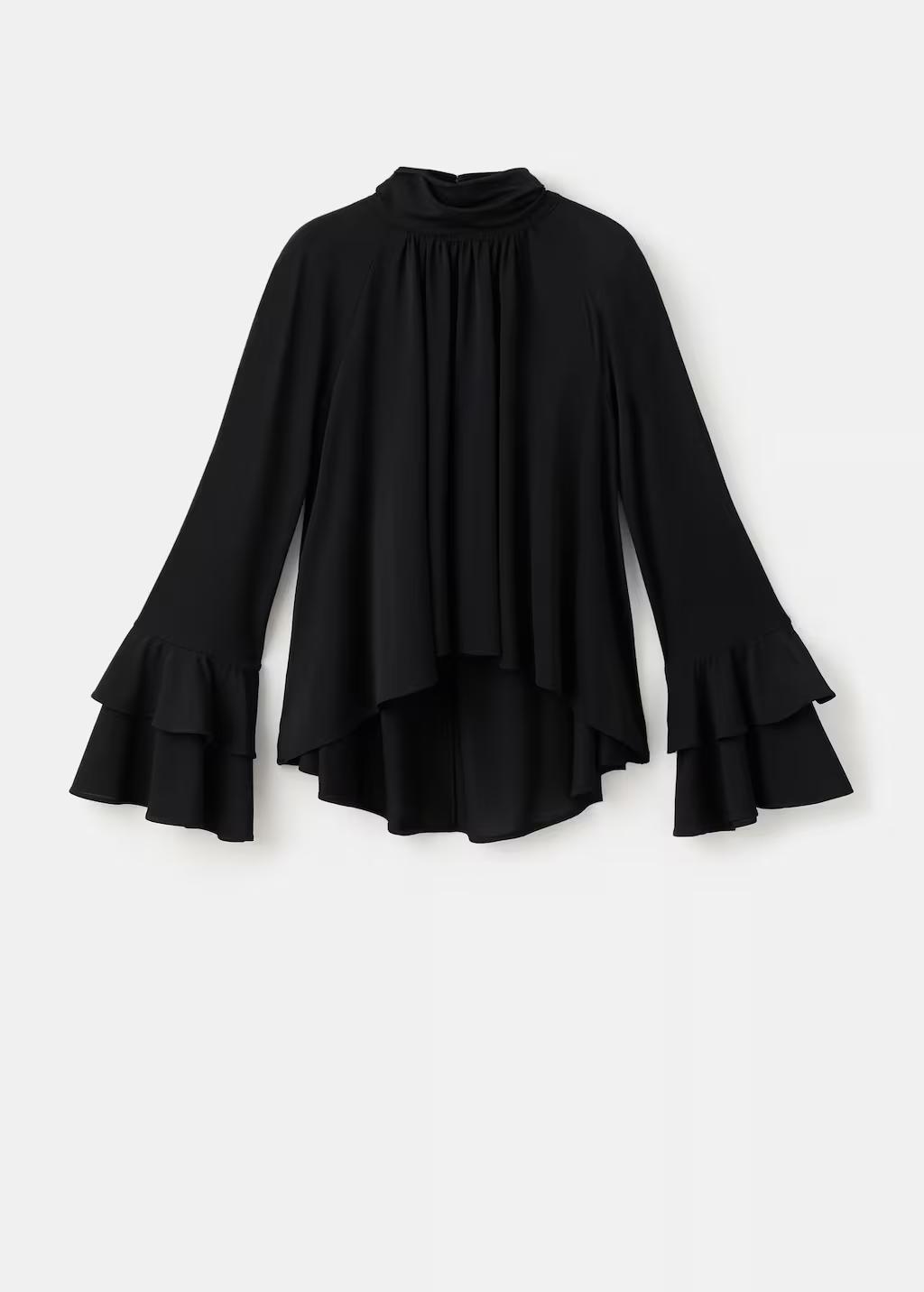 Confeccionada en tejido fluido, esta prenda presenta un diseño recto con cuello alto. Las mangas largas acampanadas con volante añaden un toque distintivo. El bajo asimétrico y el cierre de botones en el cuello completan el diseño