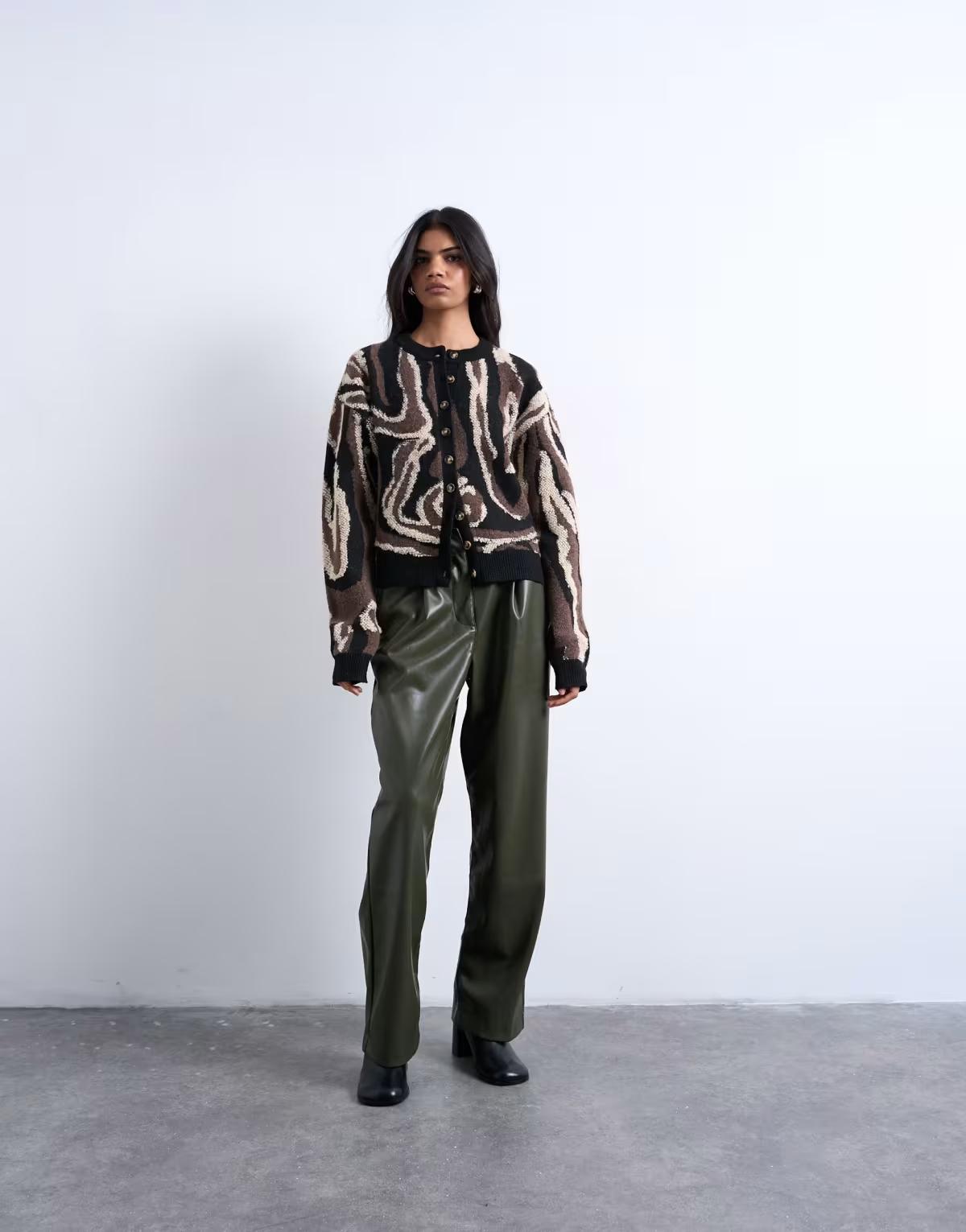 This cardigan is crafted from a textured knit in a swirly animal print. Featuring a crew neck, drop shoulders and a button placket, this style is cut to a regular fit.